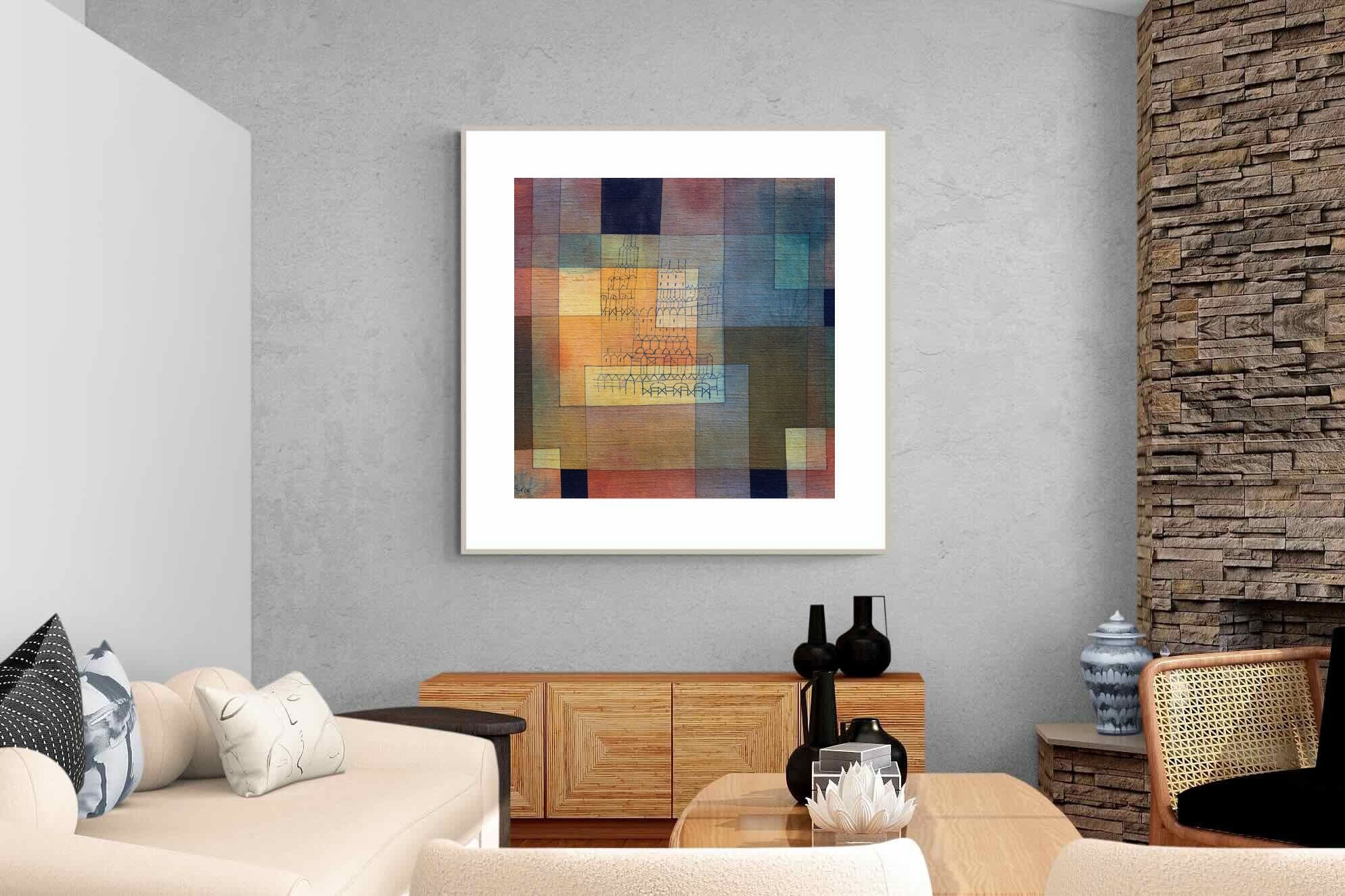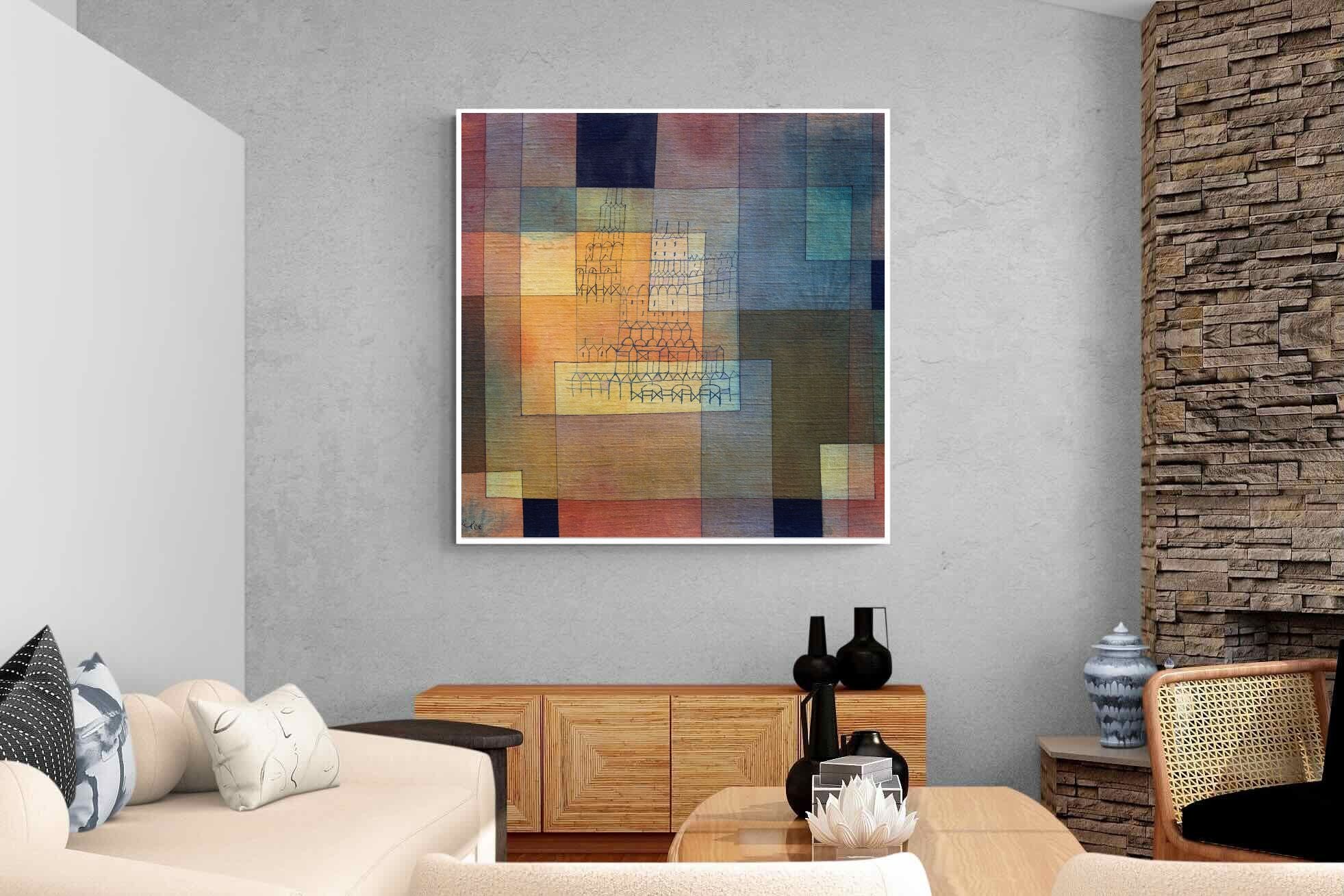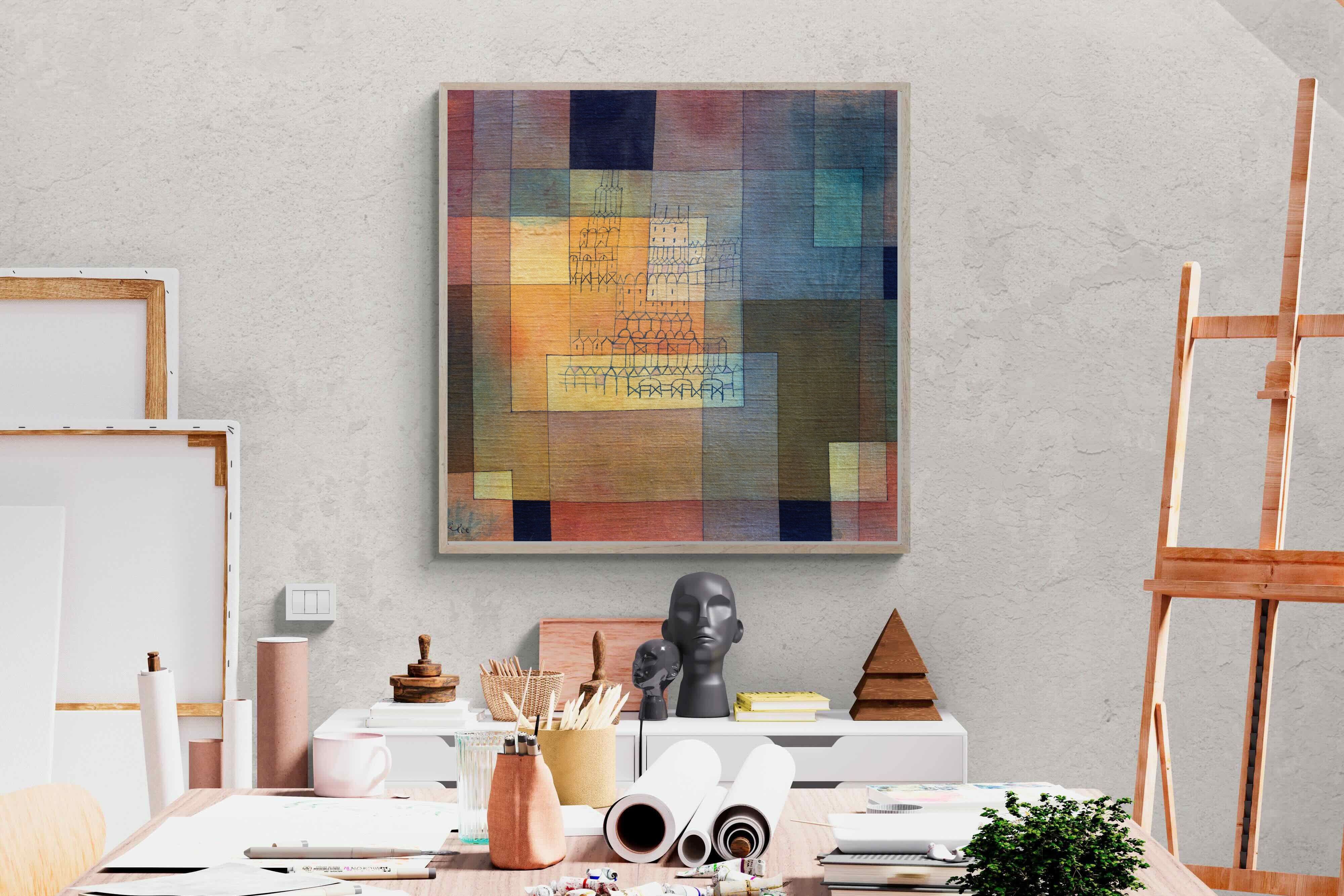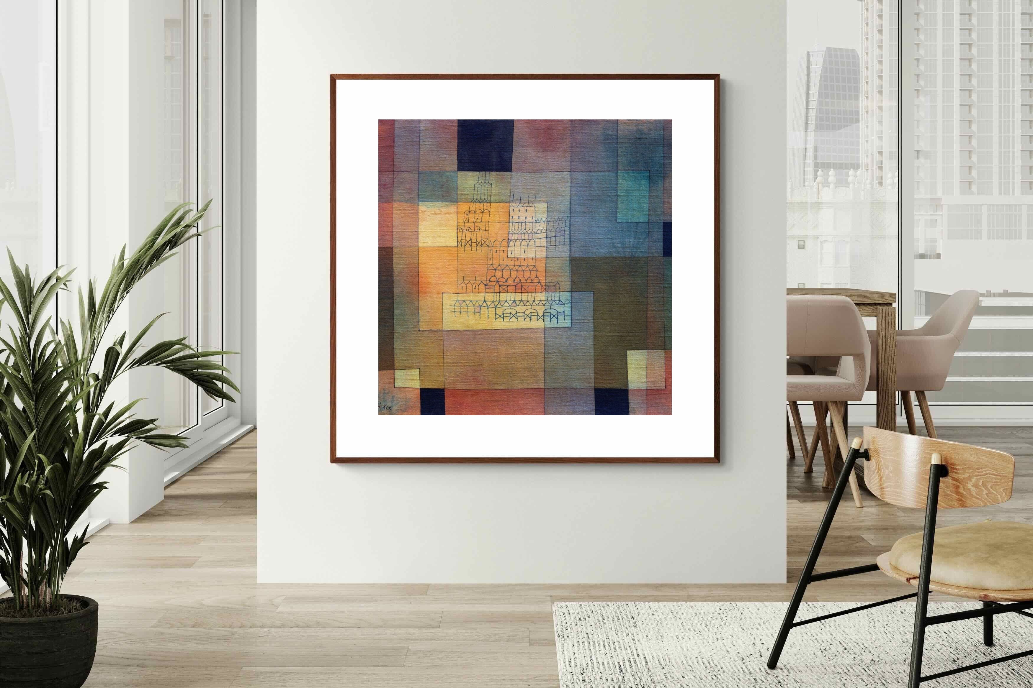 Klee blends musical theory with visual form, building an imagined structure composed of rhythm, repetition, and tonal harmony. The layered squares evoke notes, chords, and architectural scaffolding, symbolising the connection between sound and spatial design. Soft gradients and intersecting grids create meditative complexity. This print enhances modern homes, Scandinavian interiors, offices, and spaces that value clean geometry with artistic sophistication.