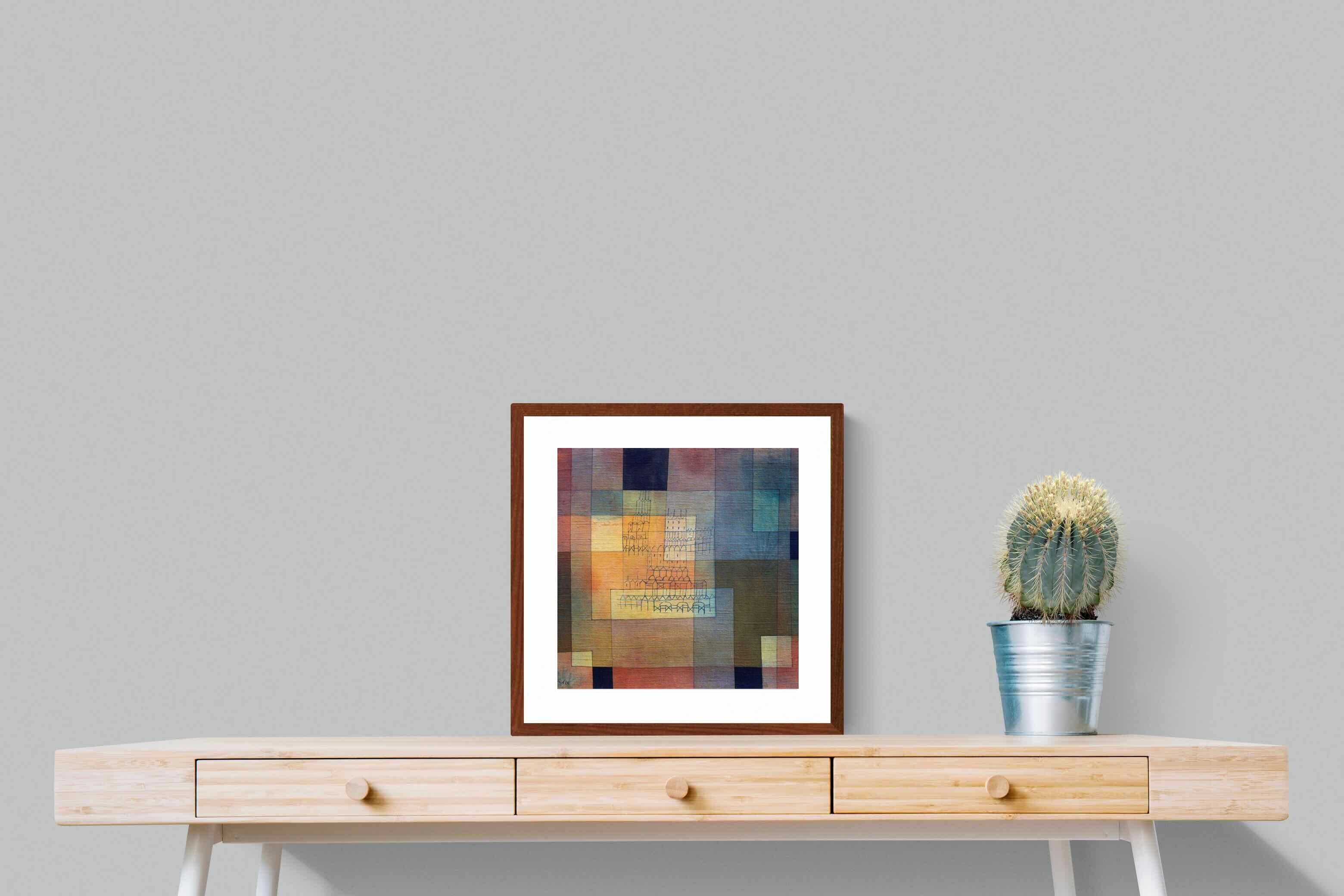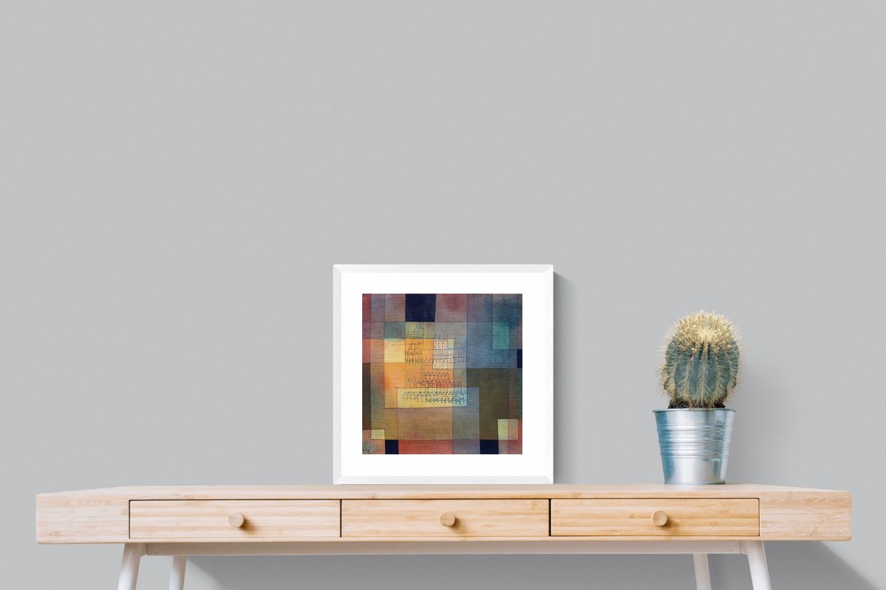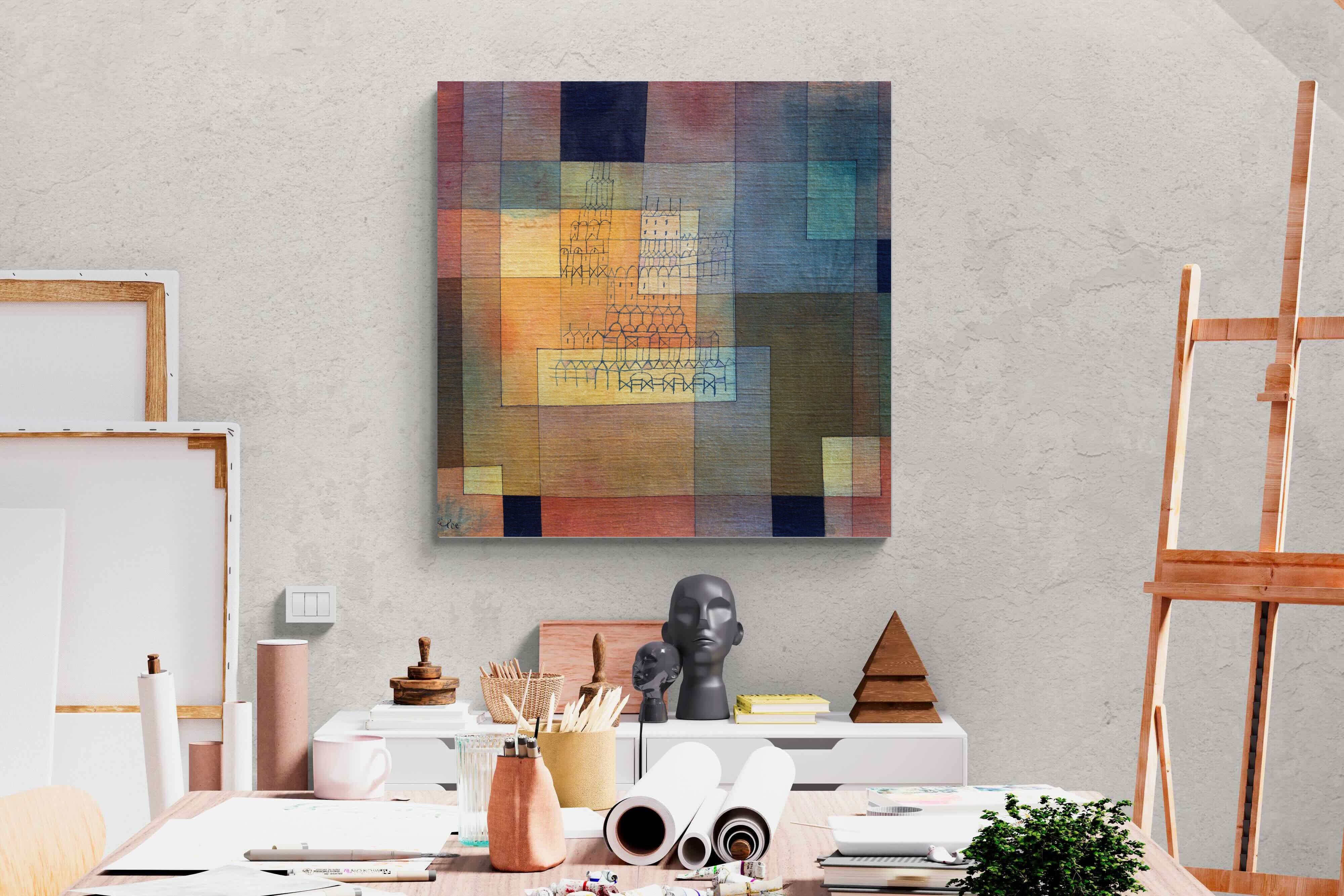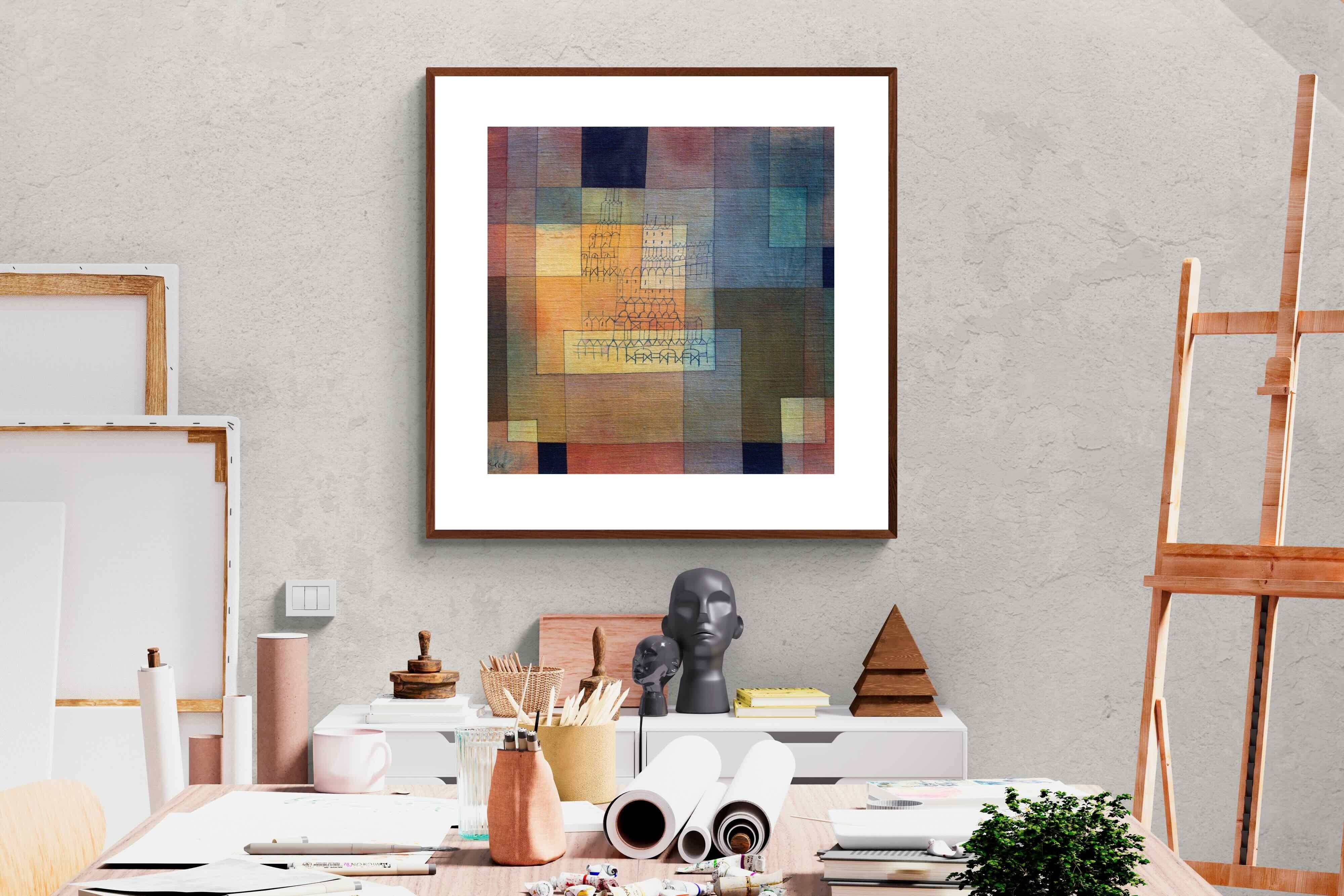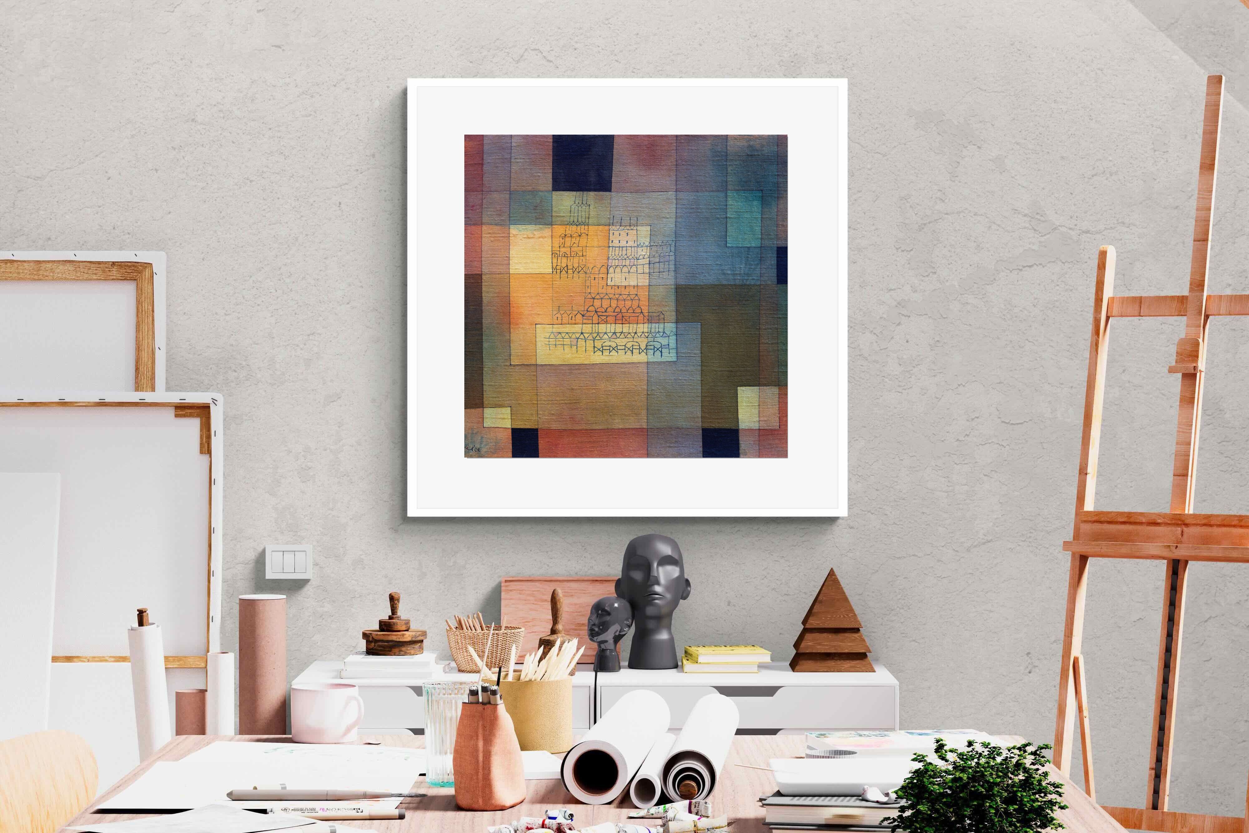 Klee blends musical theory with visual form, building an imagined structure composed of rhythm, repetition, and tonal harmony. The layered squares evoke notes, chords, and architectural scaffolding, symbolising the connection between sound and spatial design. Soft gradients and intersecting grids create meditative complexity. This print enhances modern homes, Scandinavian interiors, offices, and spaces that value clean geometry with artistic sophistication.