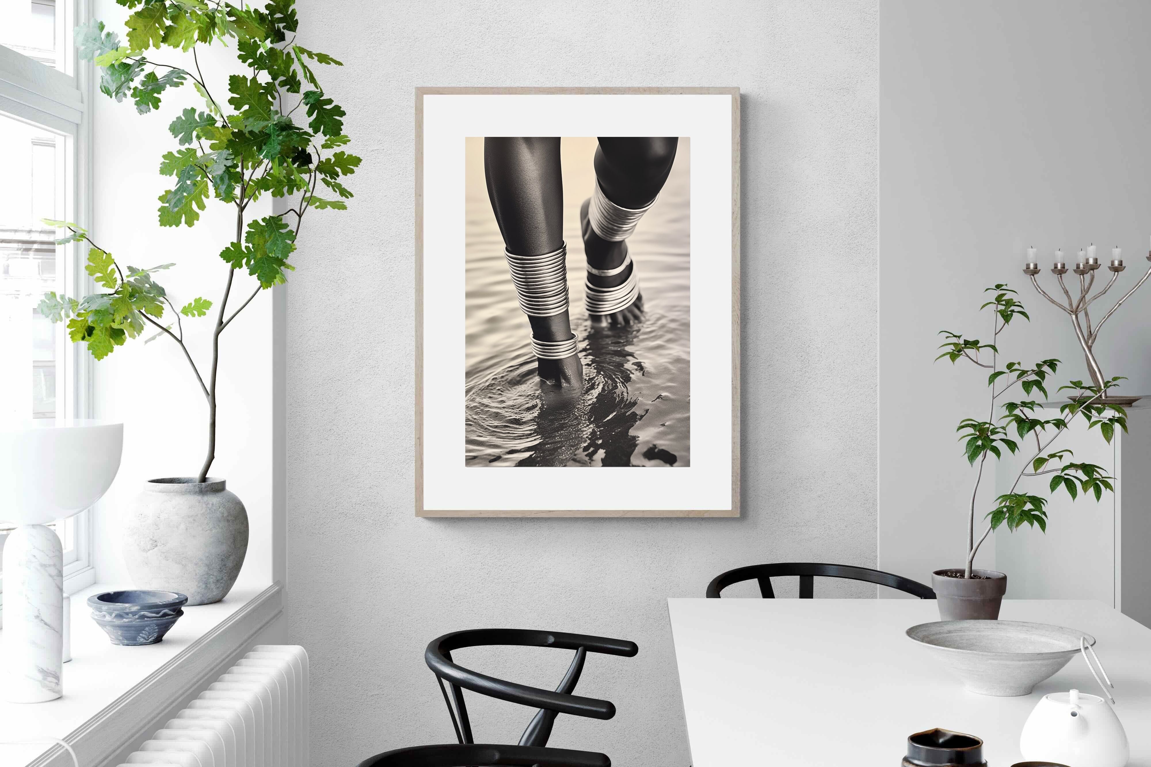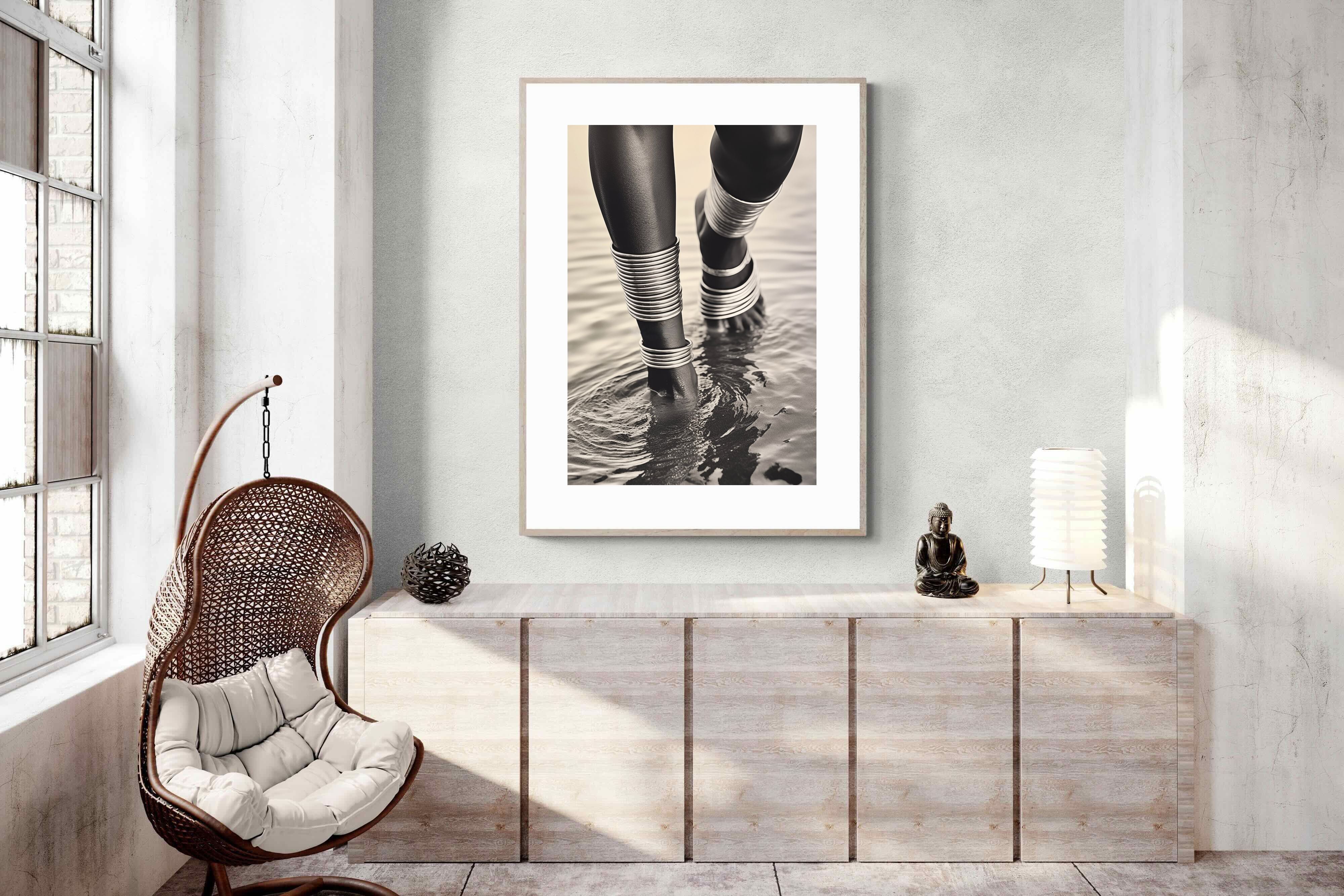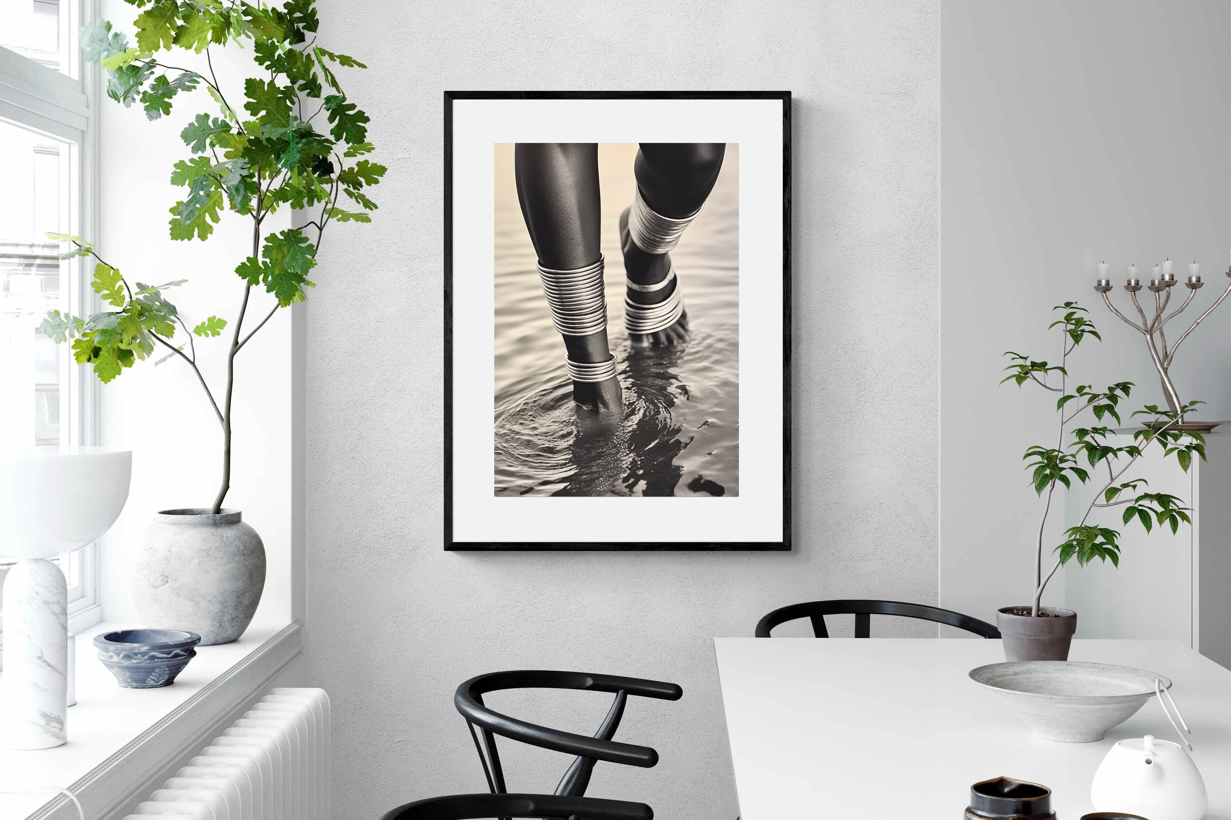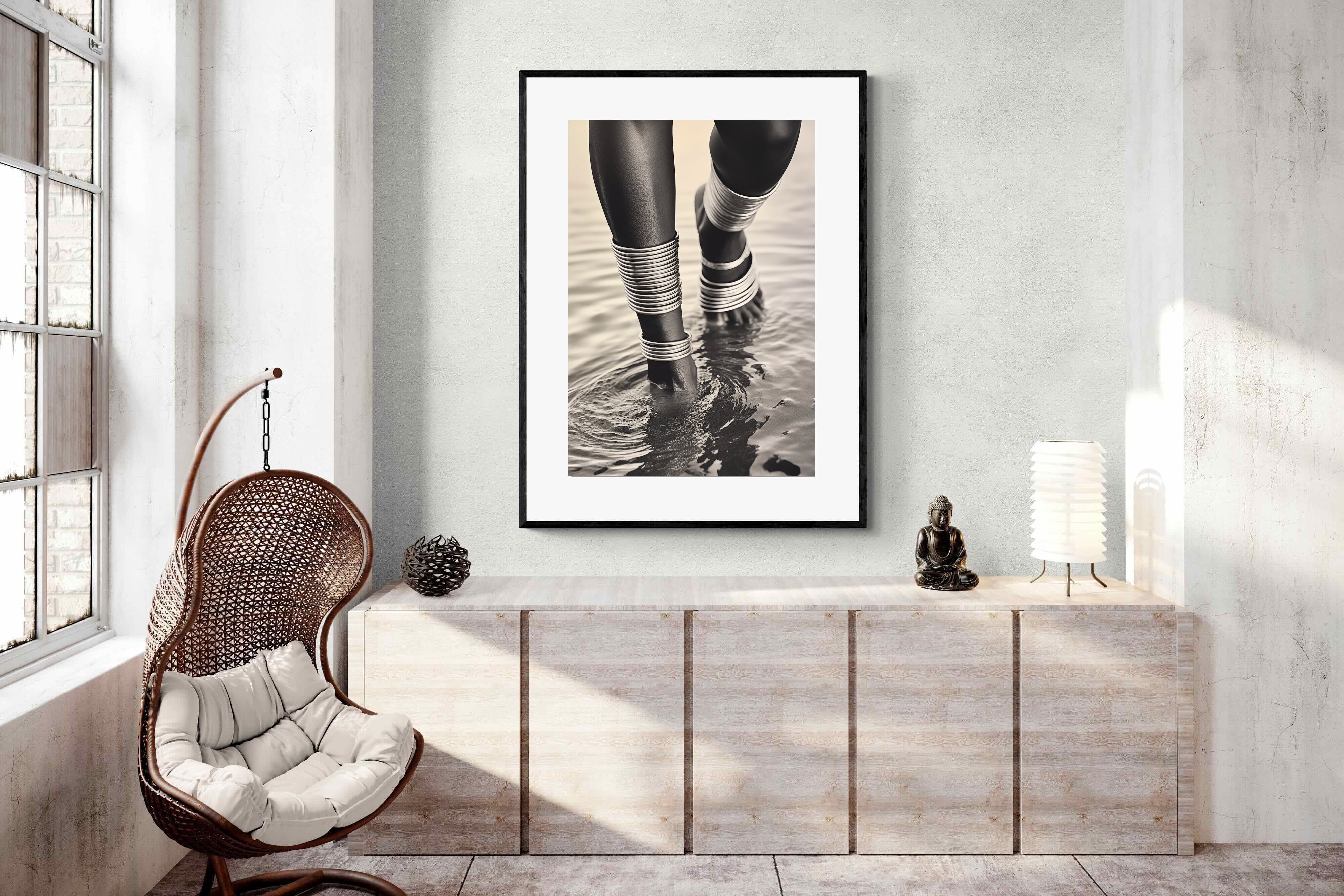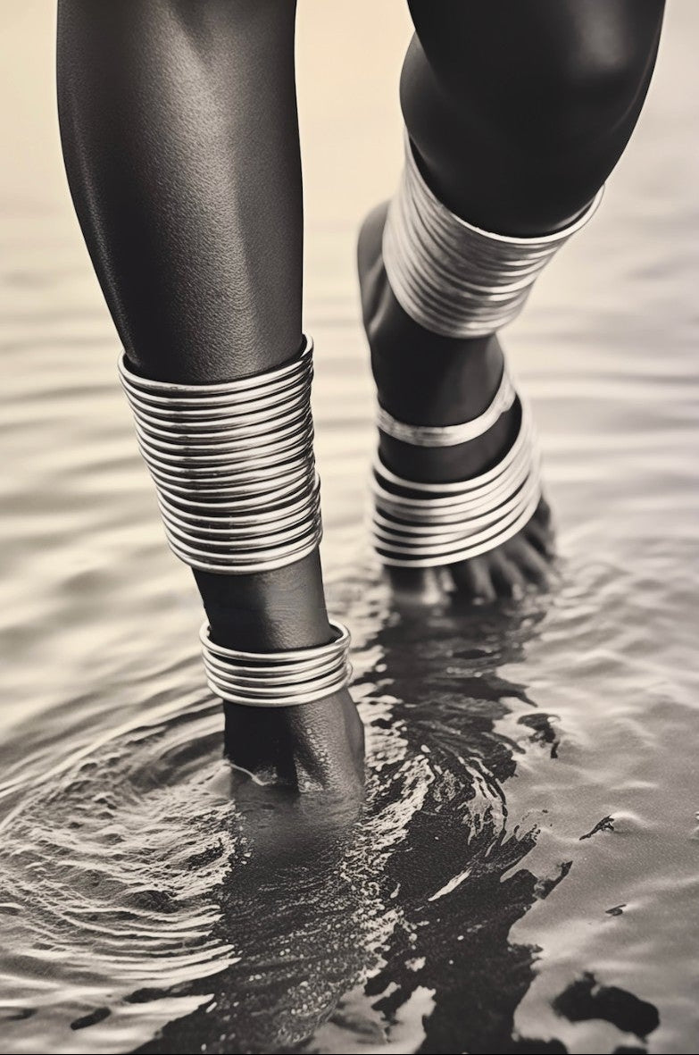 With exquisite detail, "Mucubal Anklet" showcases the beauty of traditional tribal jewellery, a testament to the artistry and history of the Mucubal women. The anklets, more than mere ornaments, are symbols of status and elegance, integral to the tribe's identity. The monochrome palette accentuates the textures and contours of the adornments, lending the subject a timeless grace.
