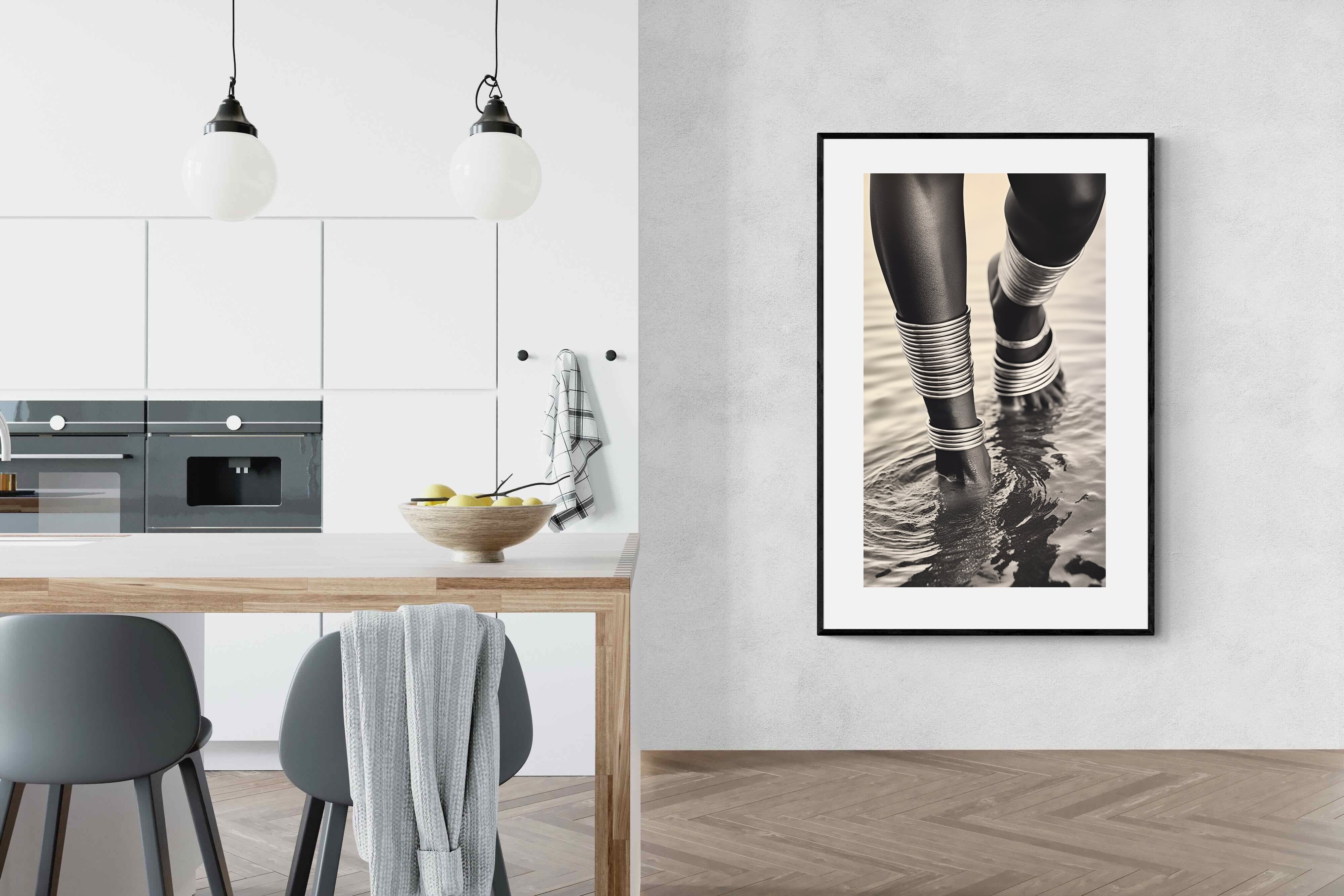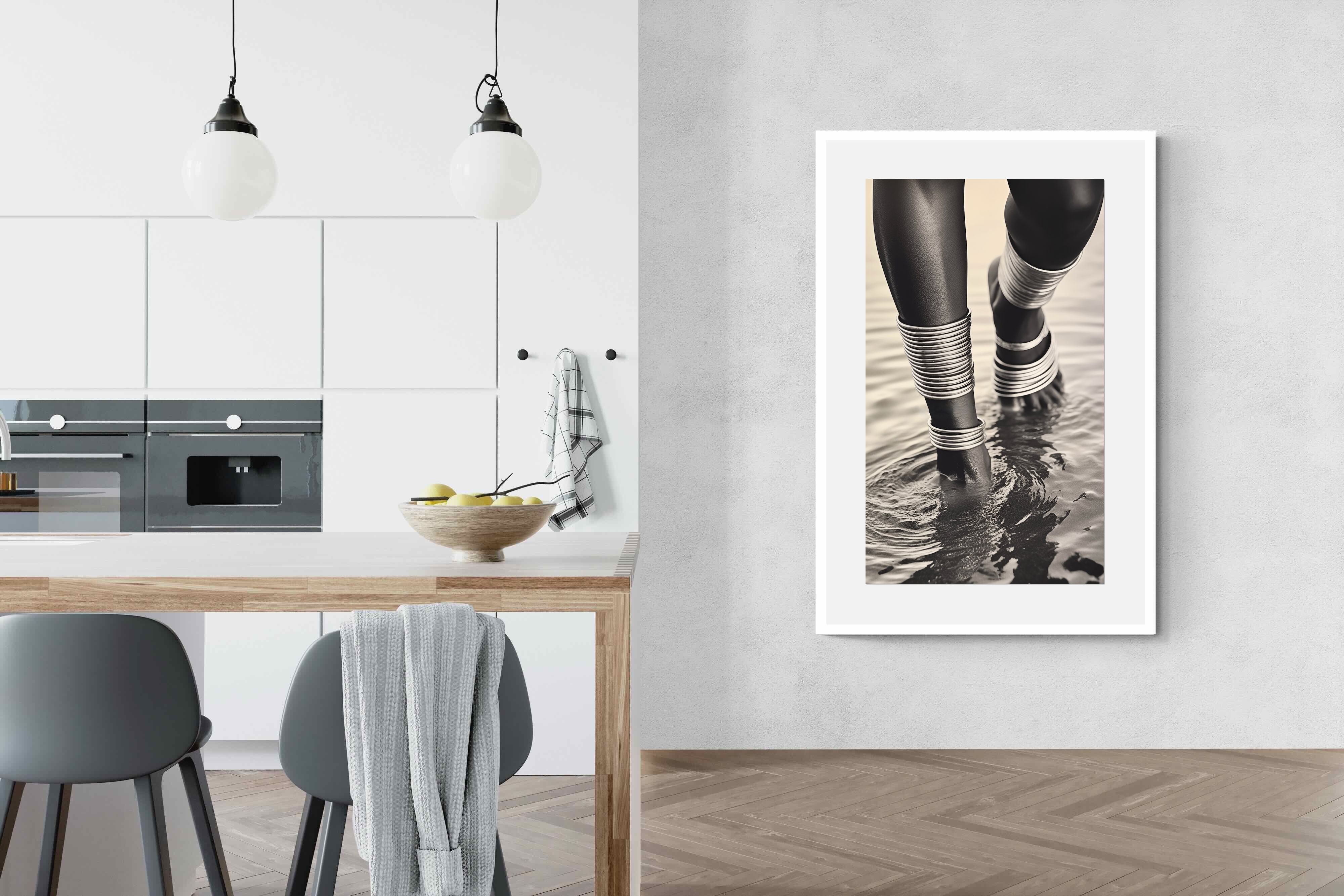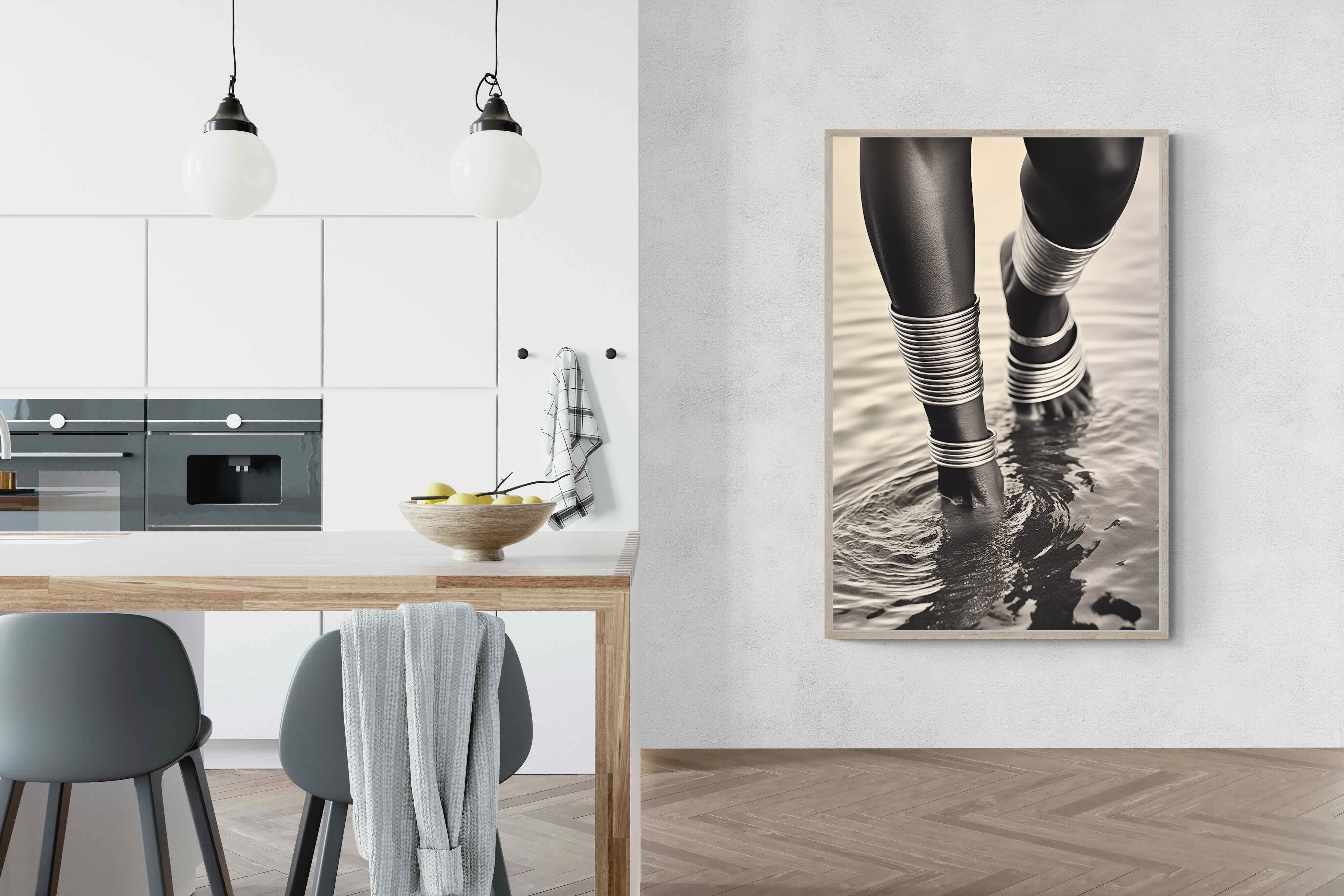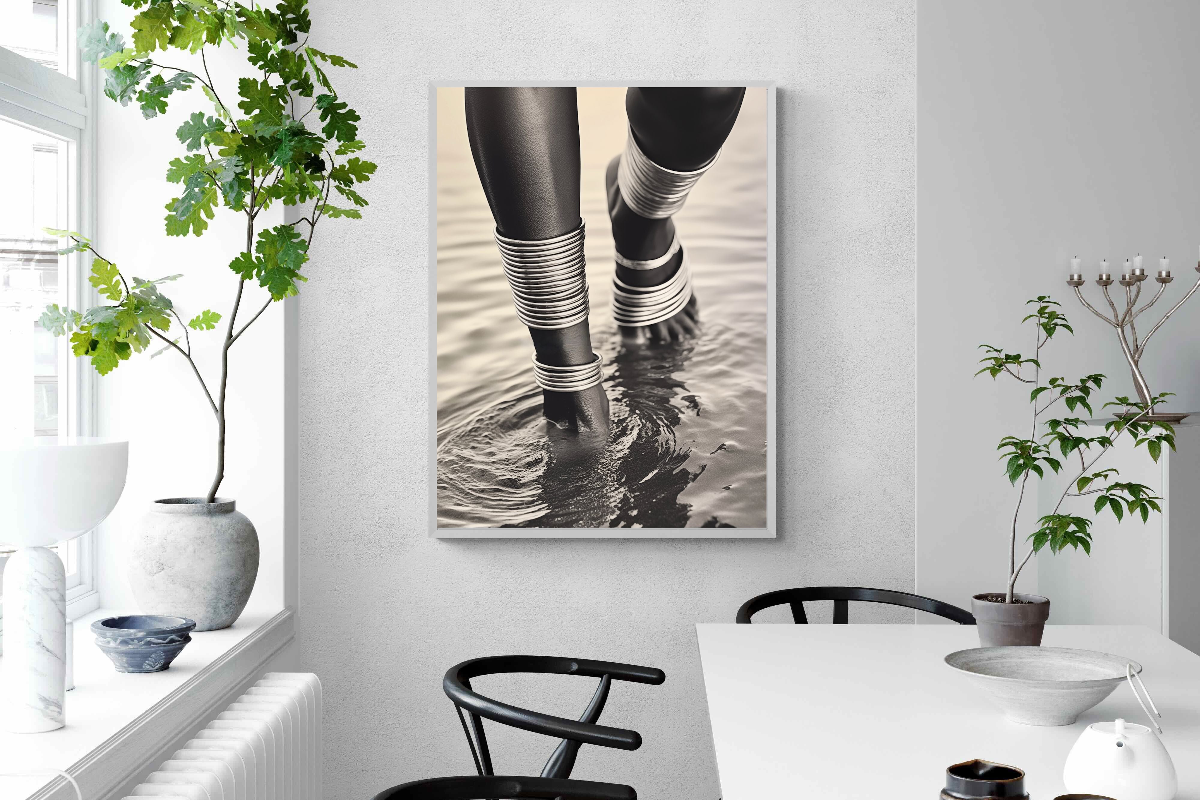 With exquisite detail, "Mucubal Anklet" showcases the beauty of traditional tribal jewellery, a testament to the artistry and history of the Mucubal women. The anklets, more than mere ornaments, are symbols of status and elegance, integral to the tribe's identity. The monochrome palette accentuates the textures and contours of the adornments, lending the subject a timeless grace.