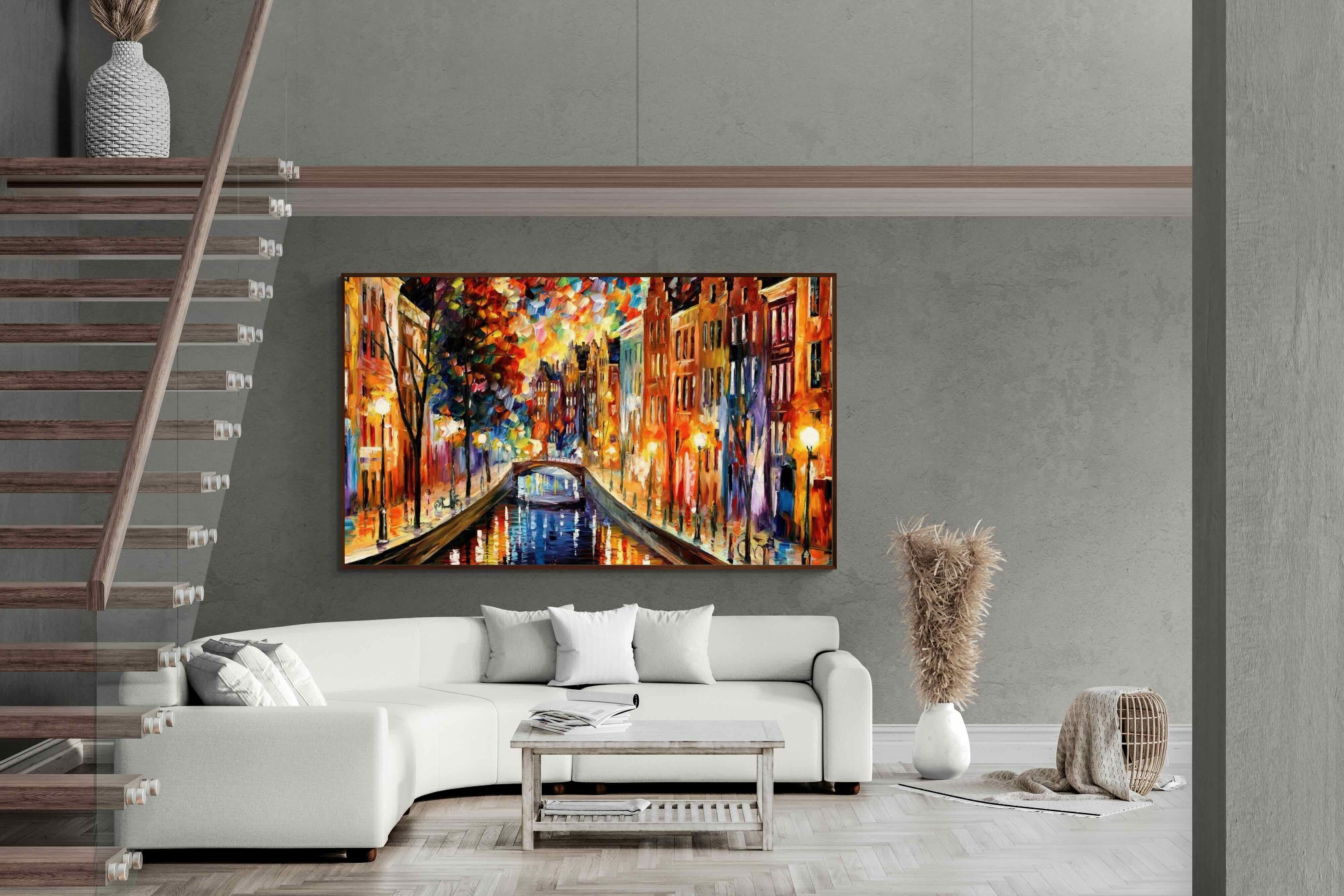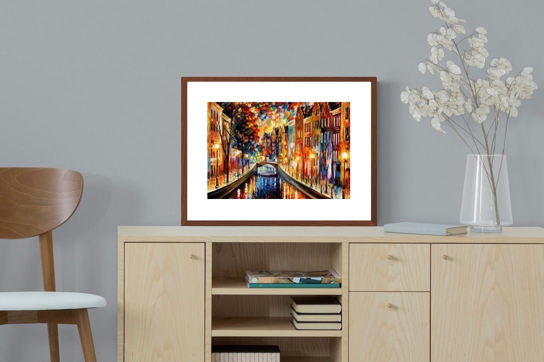 "Amsterdam Night Canal" by Leonid Afremov captures the magical allure of a nighttime canal scene. The glowing street lamps and vibrant reflections paint a romantic, energetic portrait of the city. This artwork’s vivid palette of warm oranges, blues, and purples makes it a stunning addition to any contemporary home, evoking both the charm of Amsterdam and the tranquility of water, ideal for creating an inviting atmosphere.