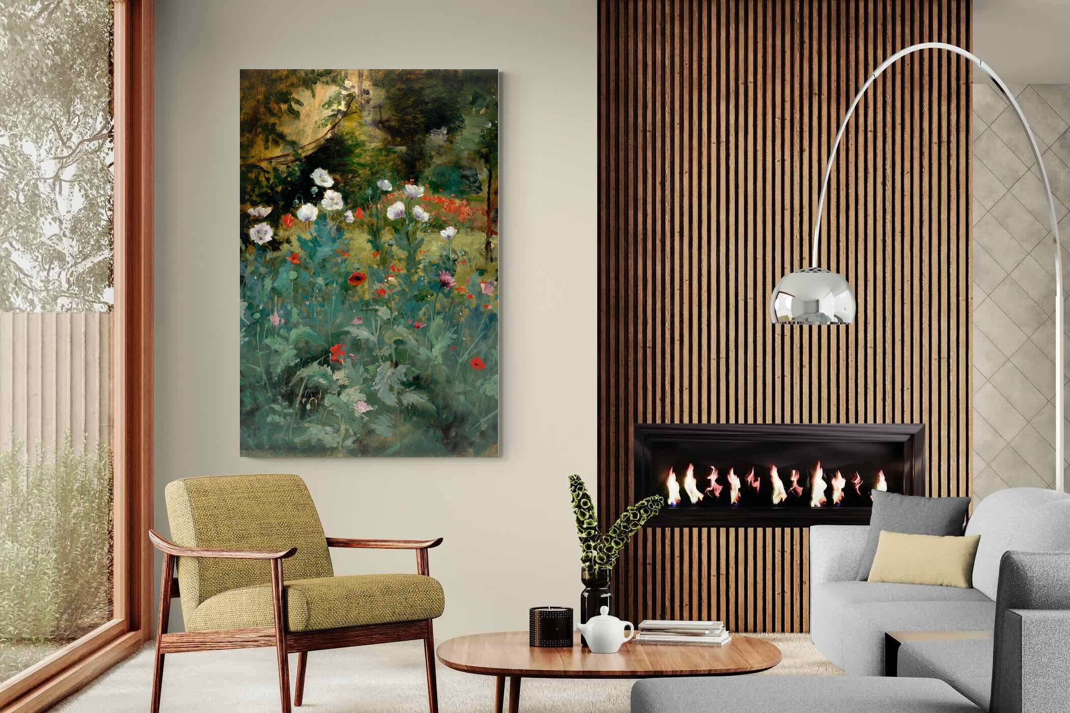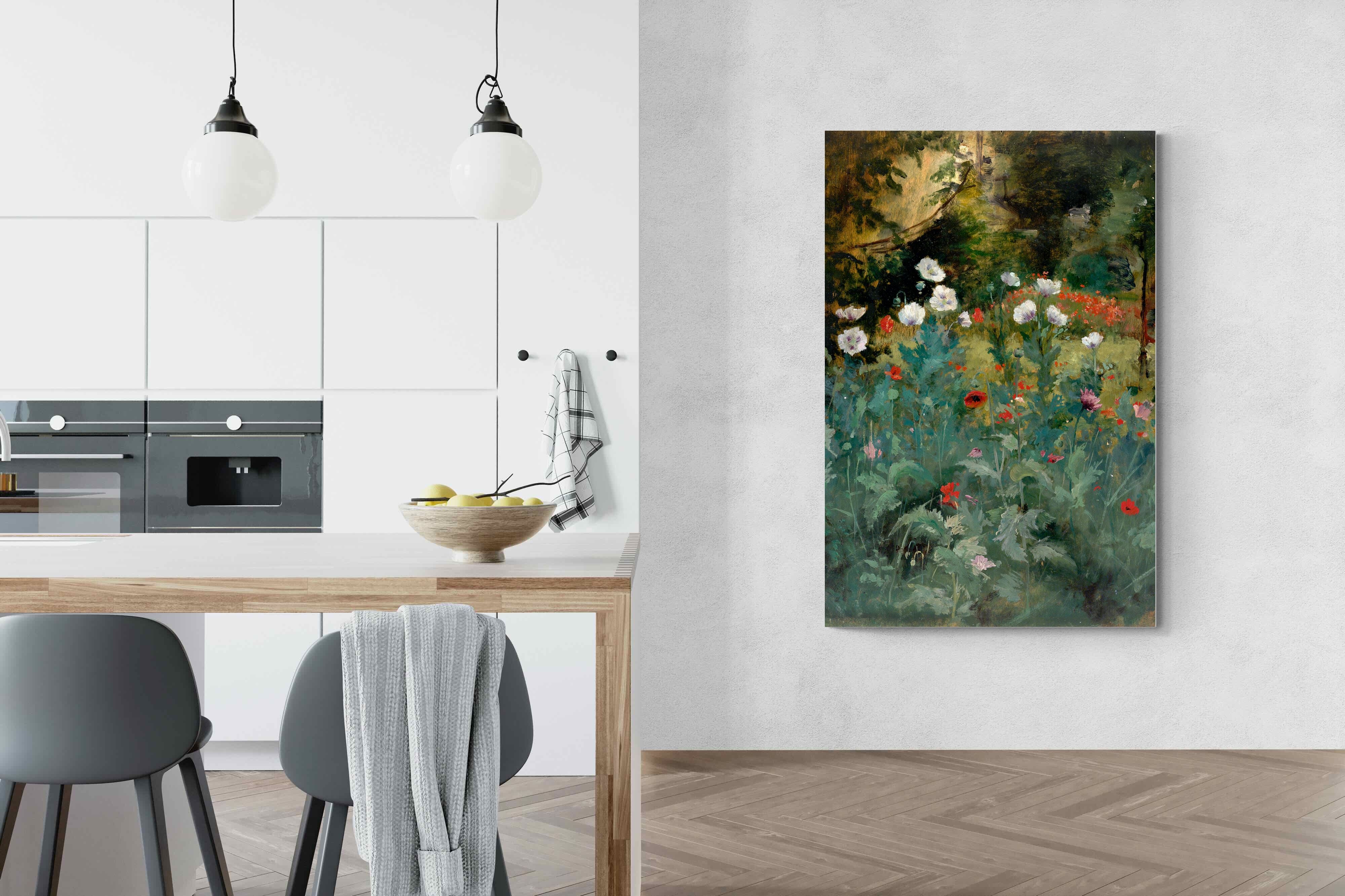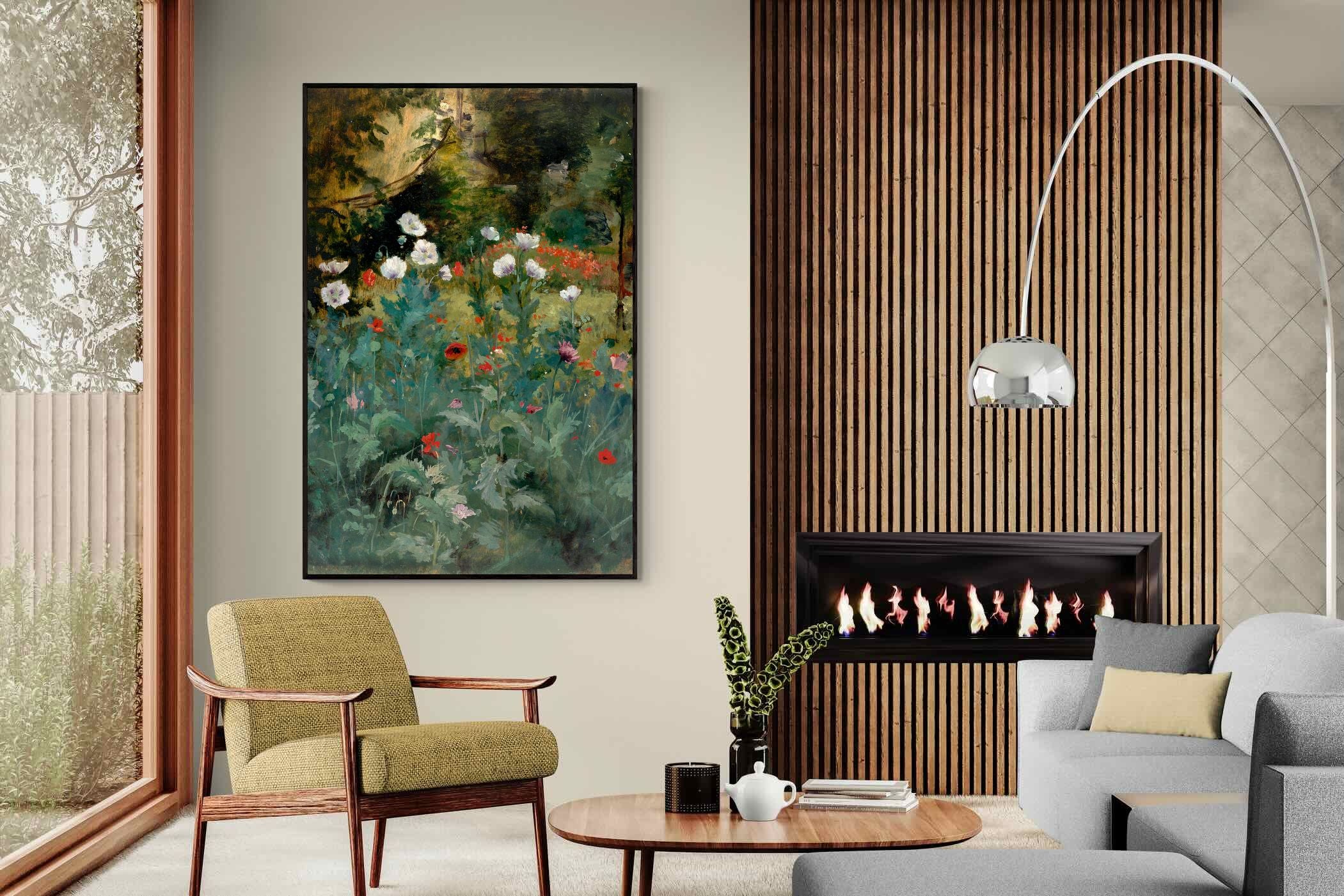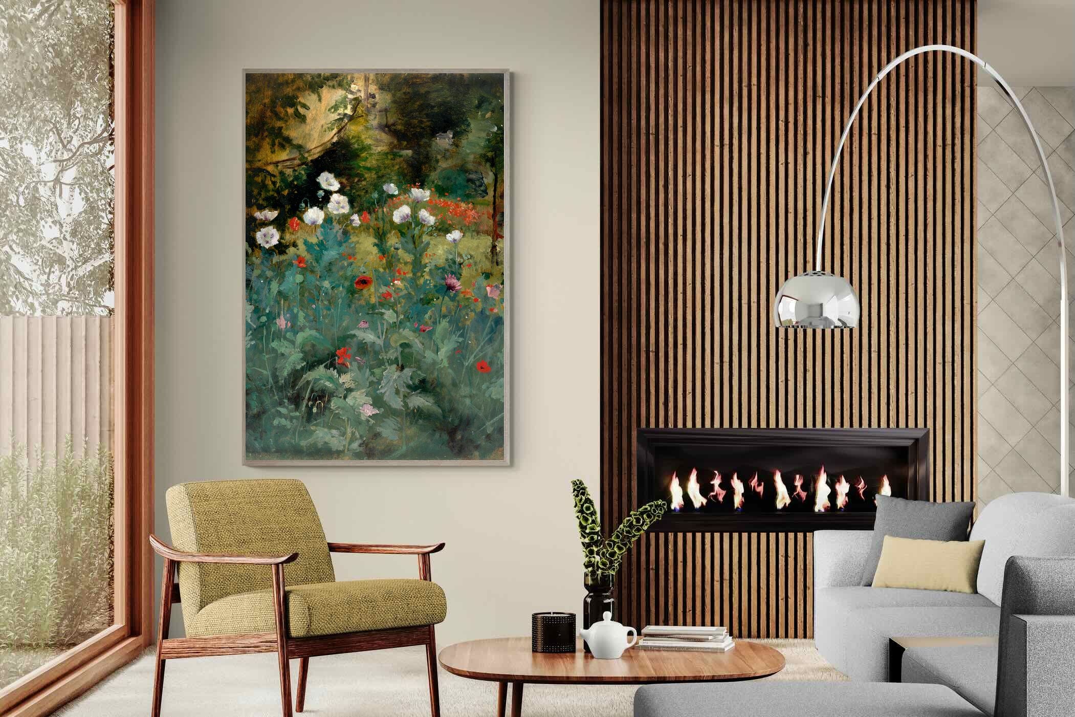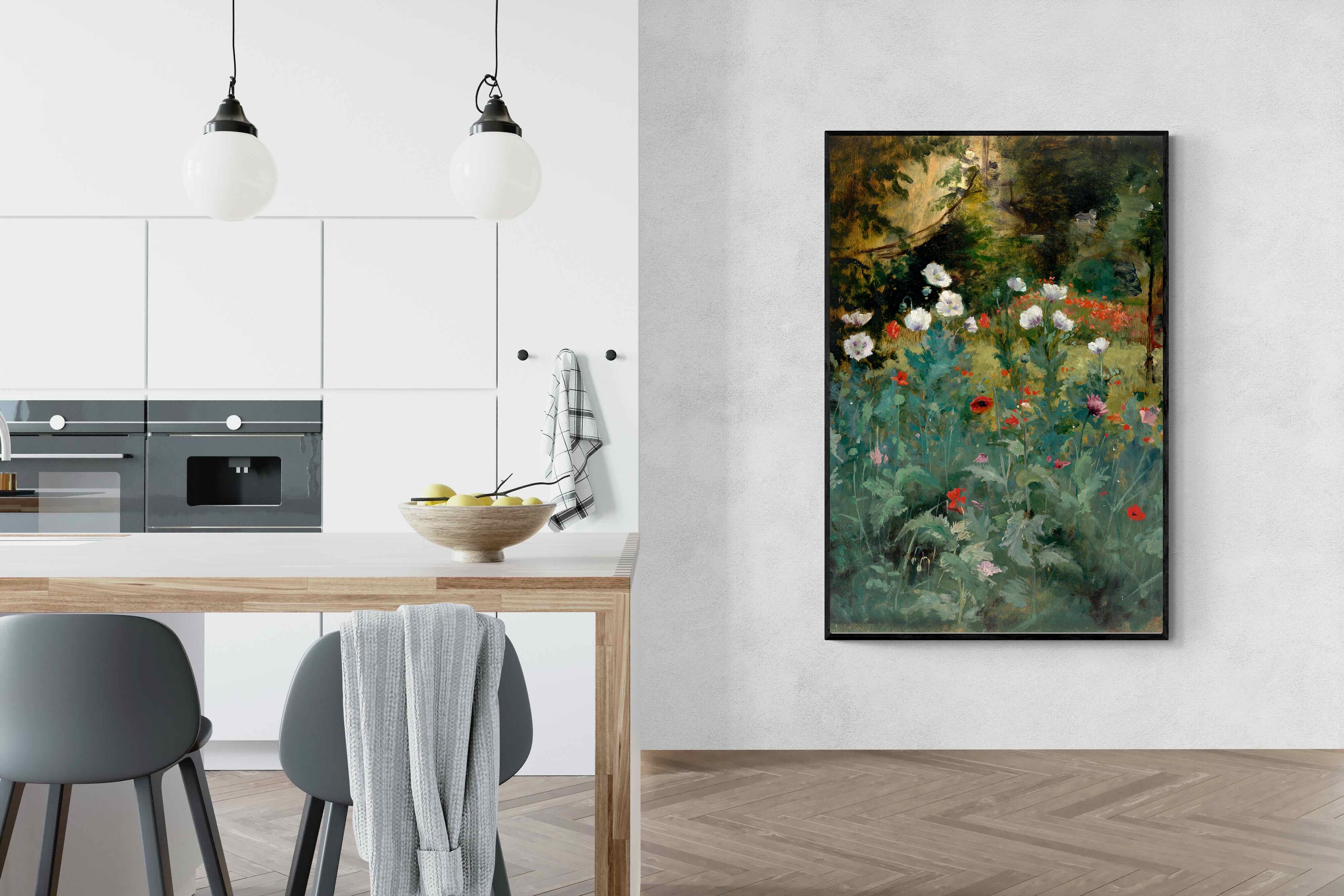 In Tranquil Poppy Garden, Eliphalet Fraser Andrews captures a dreamy garden scene, where delicate poppies bloom in soft whites, reds, and lavenders against a dusky woodland backdrop. Painted with a romantic sensibility, the work evokes peaceful solitude and natural beauty. Its rich yet subdued palette makes it a refined choice for interiors that favour elegance and calm—perfect for traditional, vintage-inspired, or nature-themed décor. This artwork brings a timeless charm and gentle floral ambience to any contemporary living space.