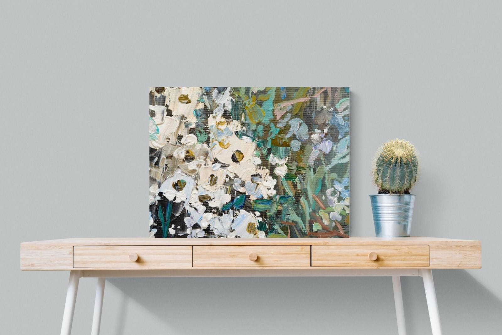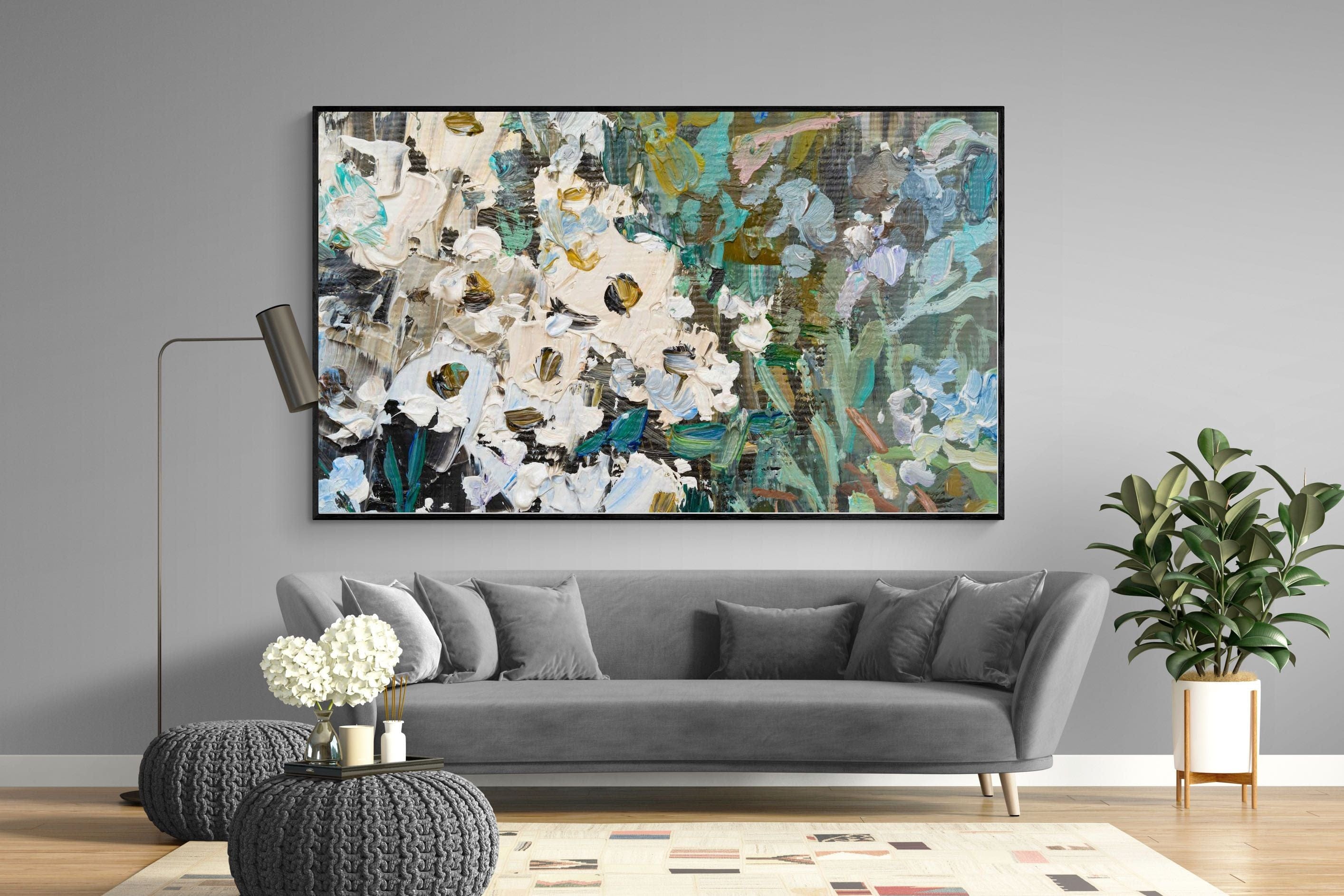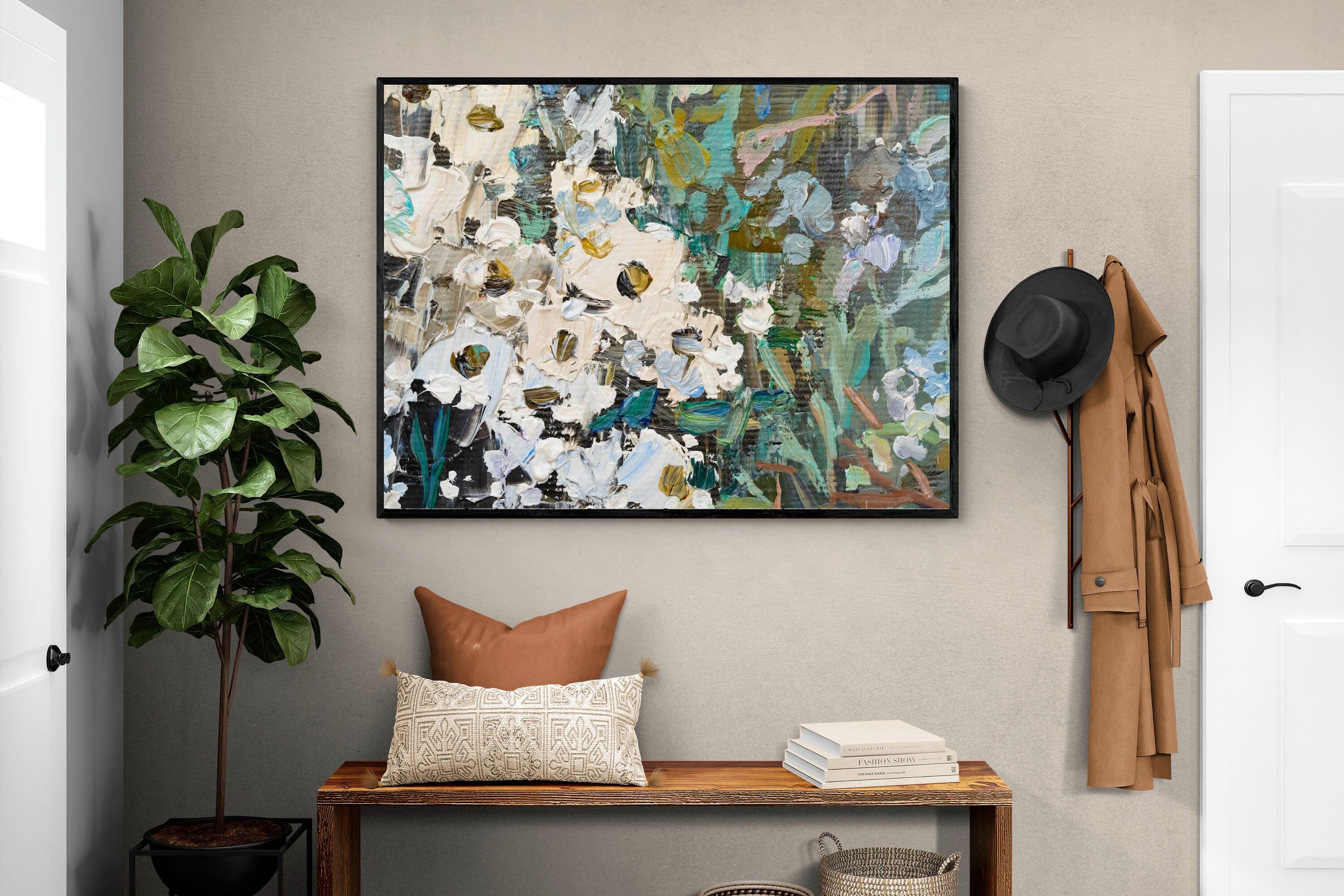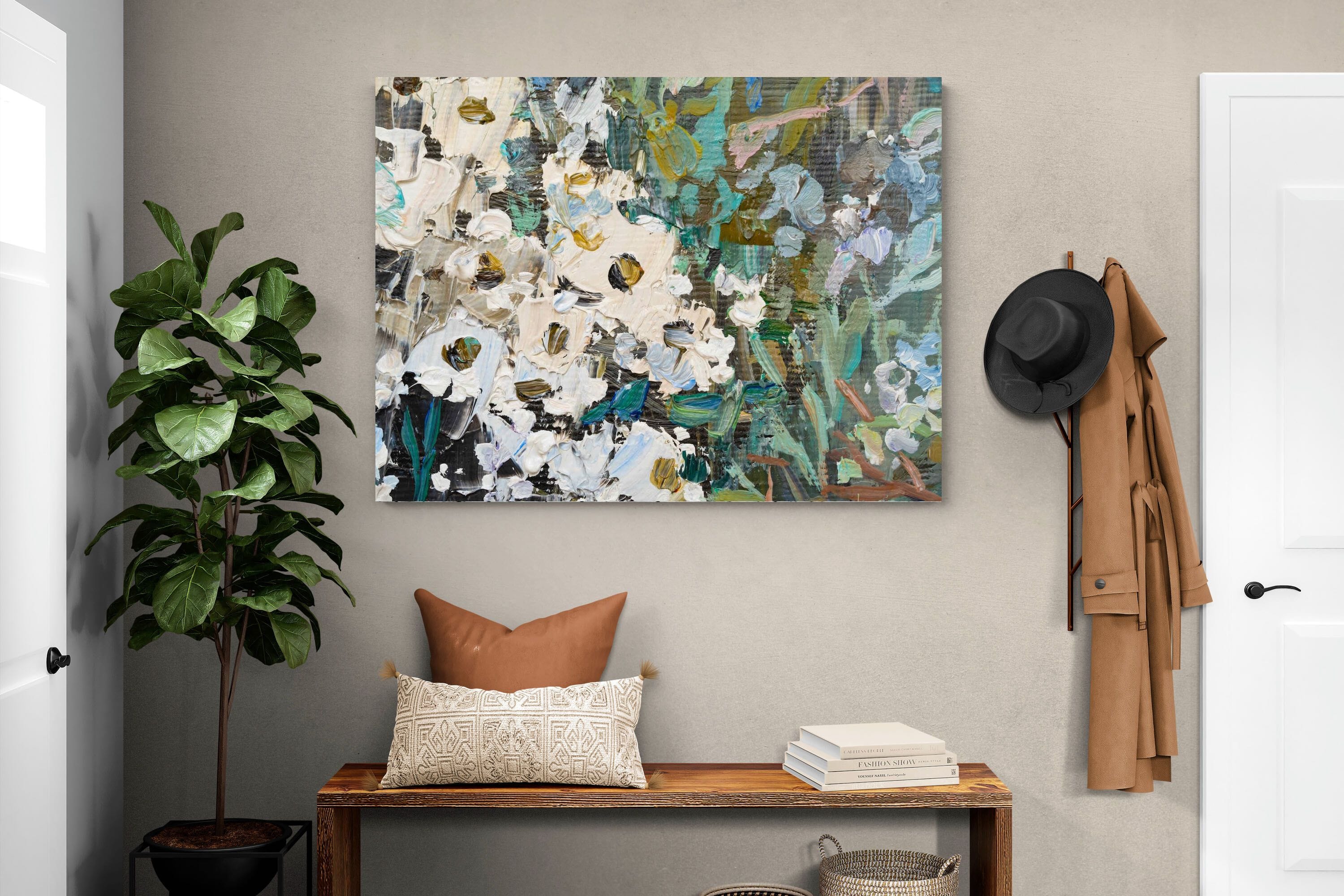 Thick, expressive strokes of oil paint form a lively abstract garden, where whites, greens, golds and muted blues dance across the canvas. The impasto technique adds depth and movement, making the flowers feel sculpted and tangible. Ideal for modern or eclectic spaces, this artwork brings organic energy and tactile richness to any wall, especially in lounges, dining rooms, or creative studios.