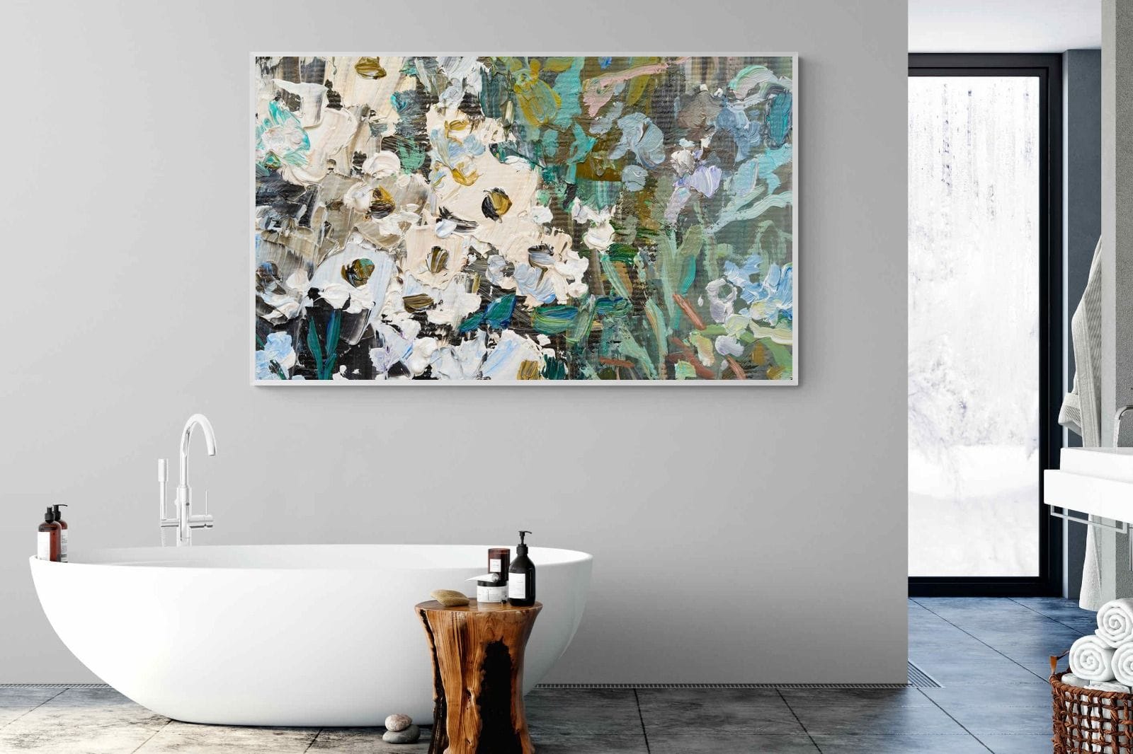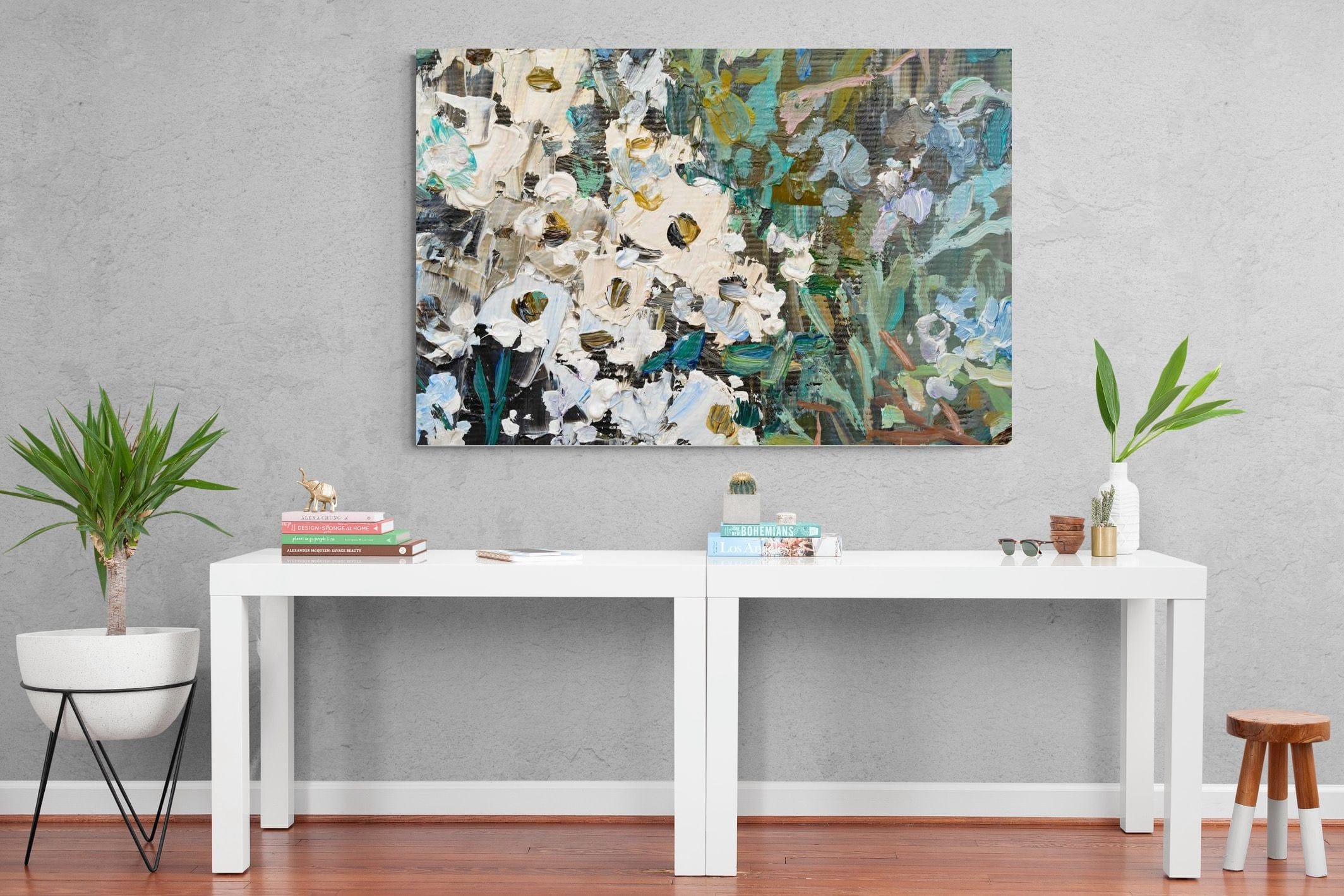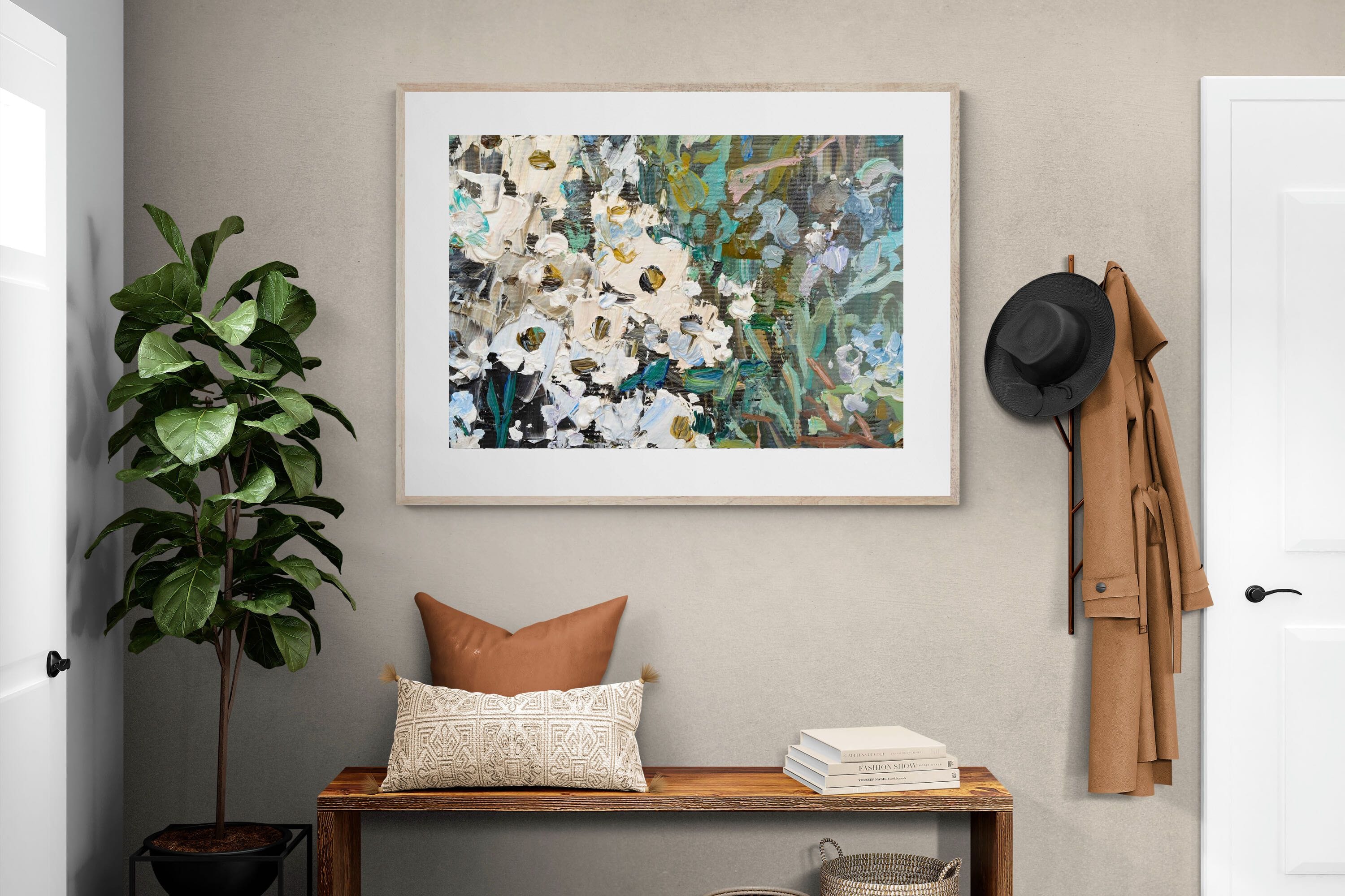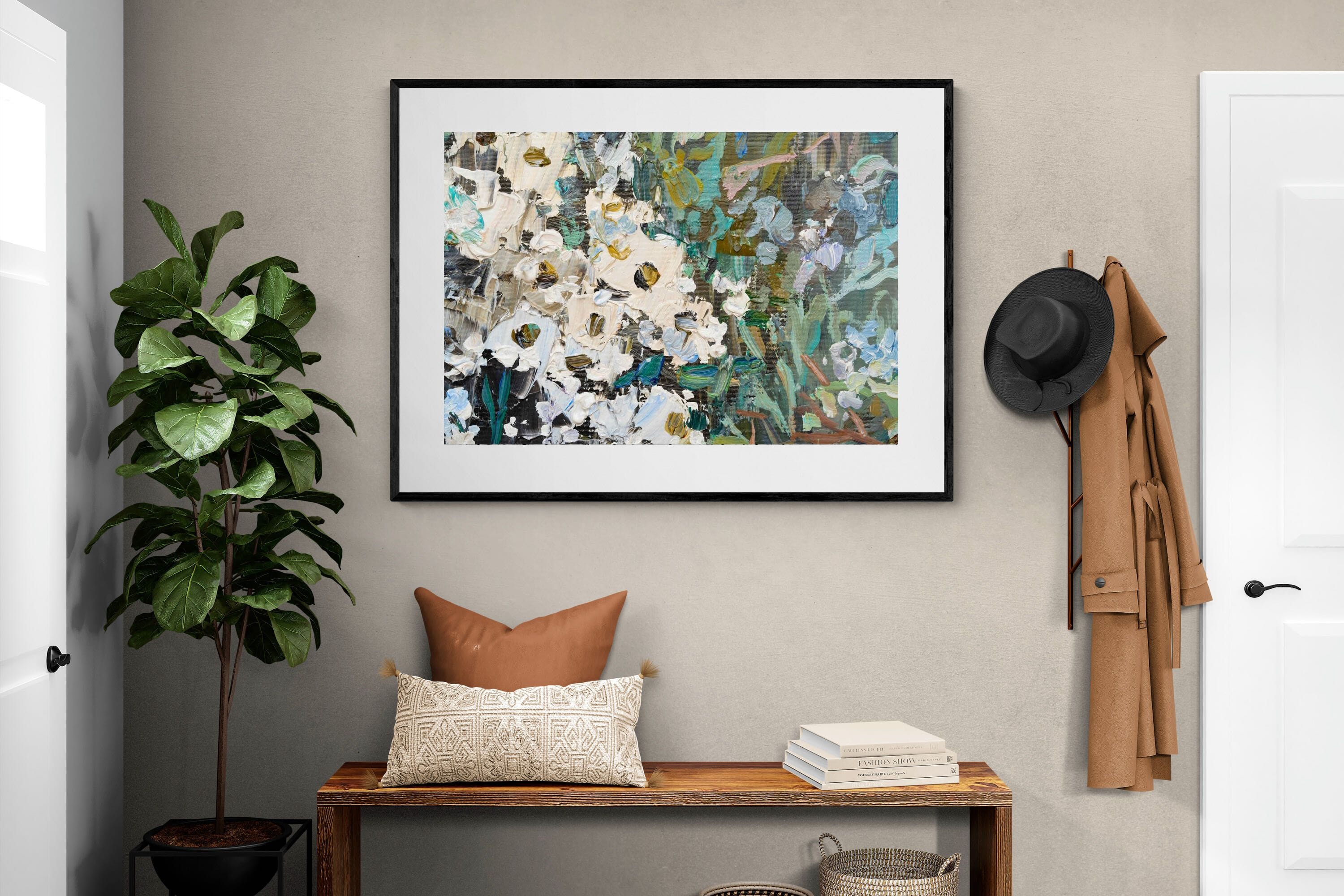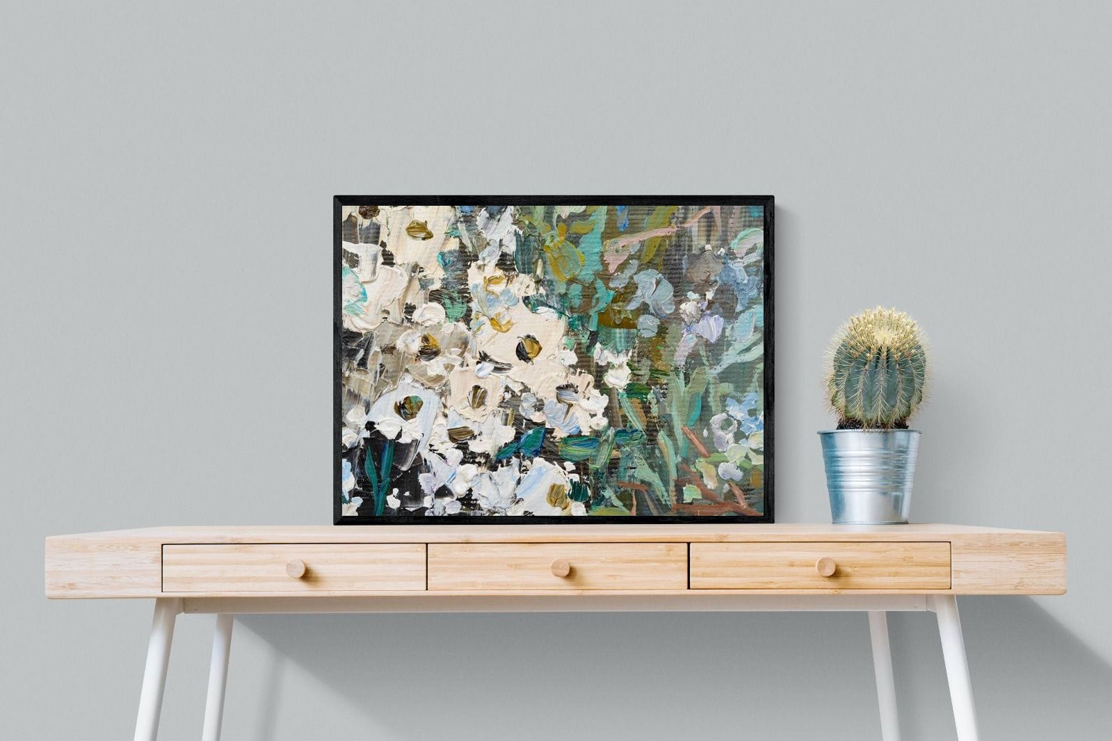 Thick, expressive strokes of oil paint form a lively abstract garden, where whites, greens, golds and muted blues dance across the canvas. The impasto technique adds depth and movement, making the flowers feel sculpted and tangible. Ideal for modern or eclectic spaces, this artwork brings organic energy and tactile richness to any wall, especially in lounges, dining rooms, or creative studios.
