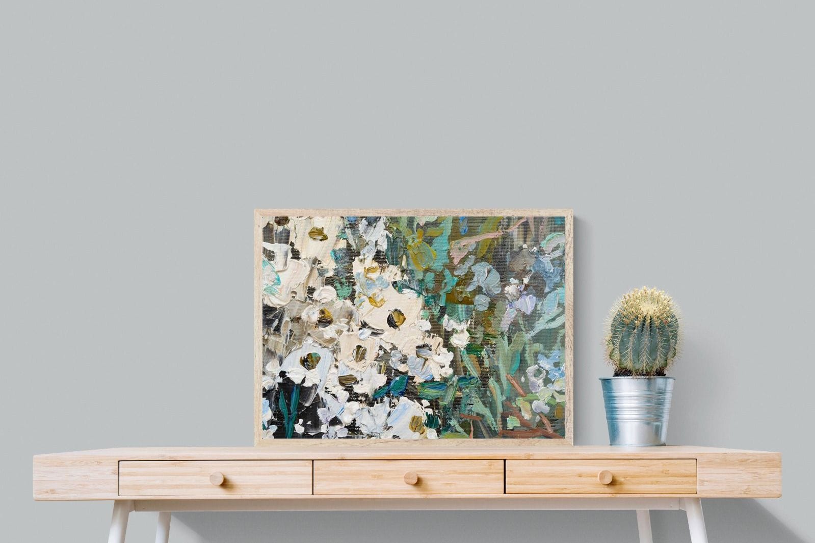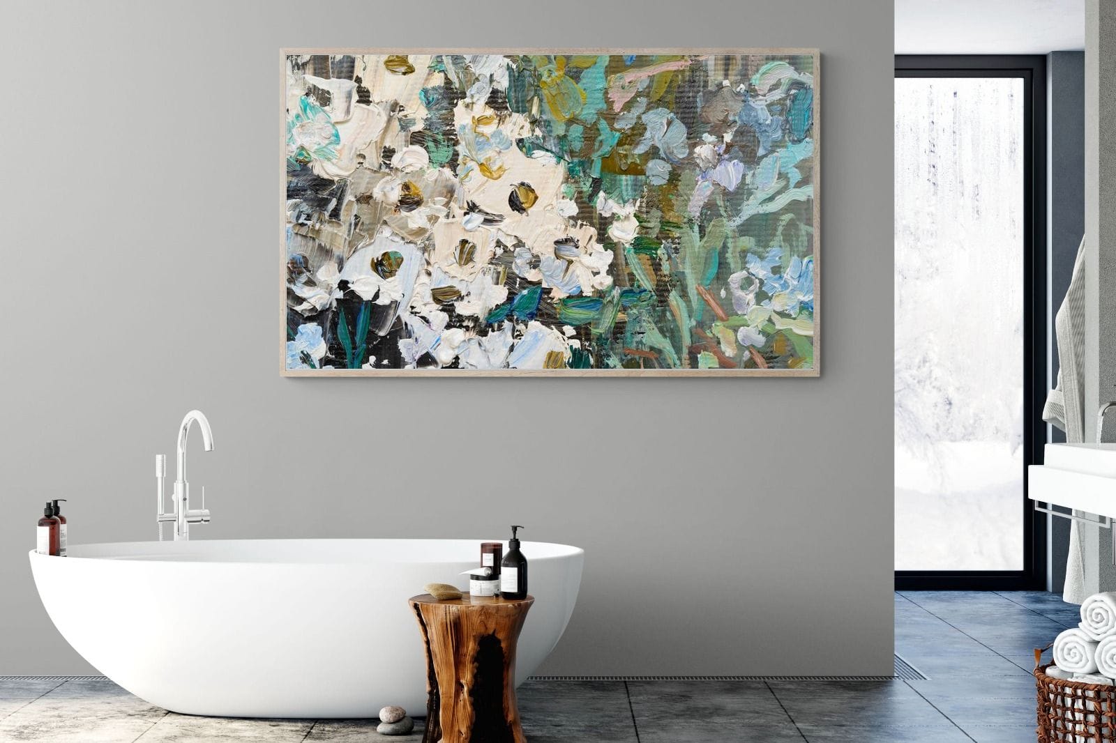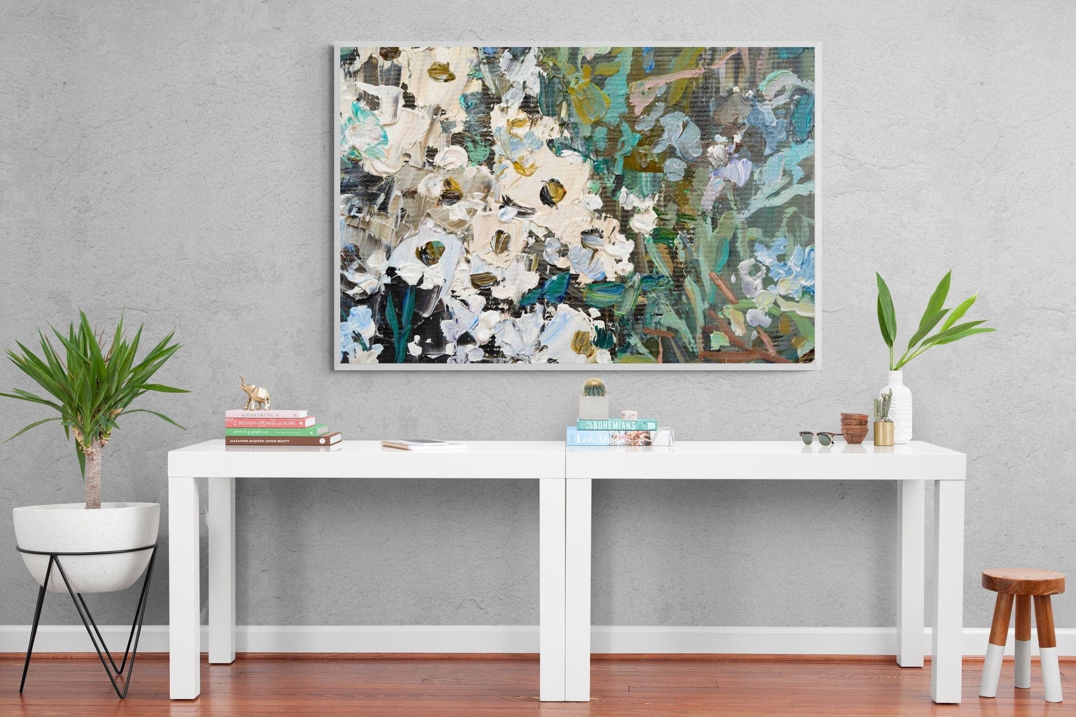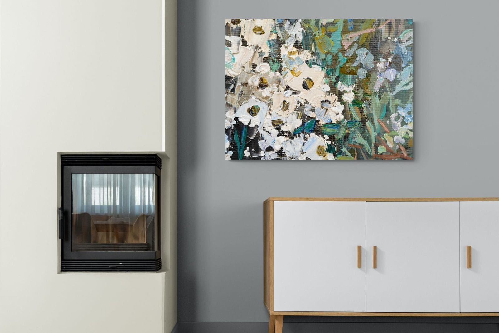 Thick, expressive strokes of oil paint form a lively abstract garden, where whites, greens, golds and muted blues dance across the canvas. The impasto technique adds depth and movement, making the flowers feel sculpted and tangible. Ideal for modern or eclectic spaces, this artwork brings organic energy and tactile richness to any wall, especially in lounges, dining rooms, or creative studios.