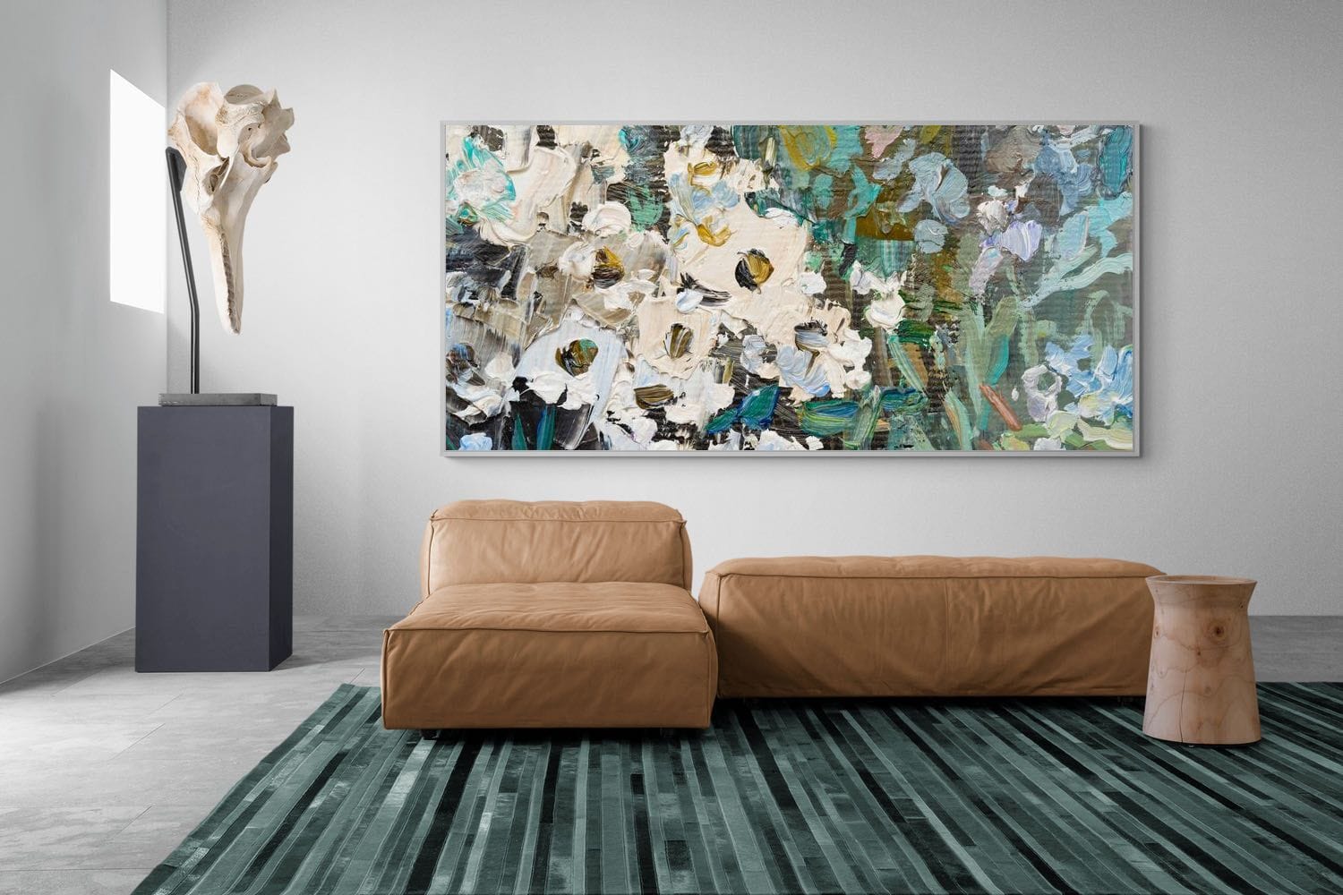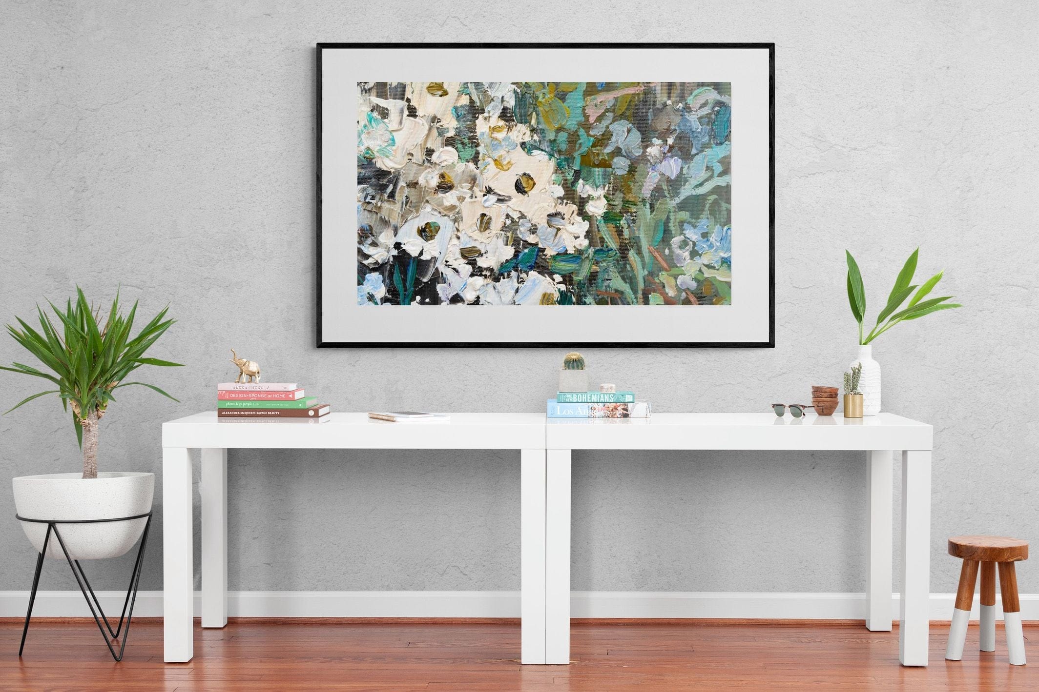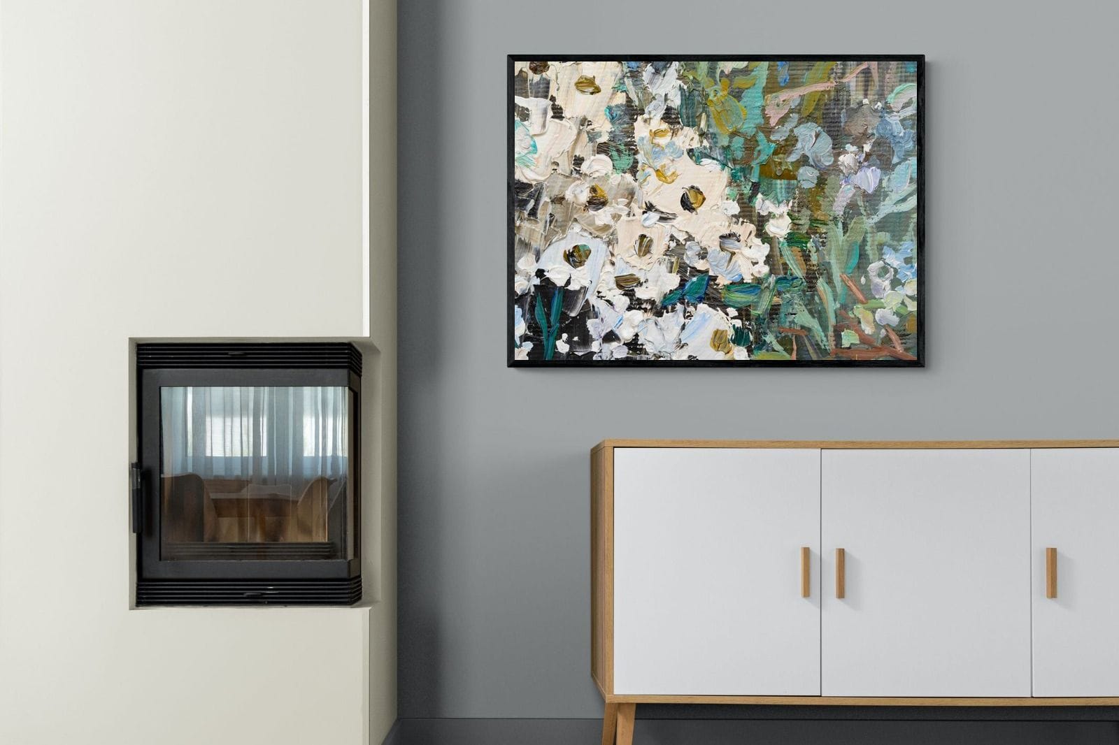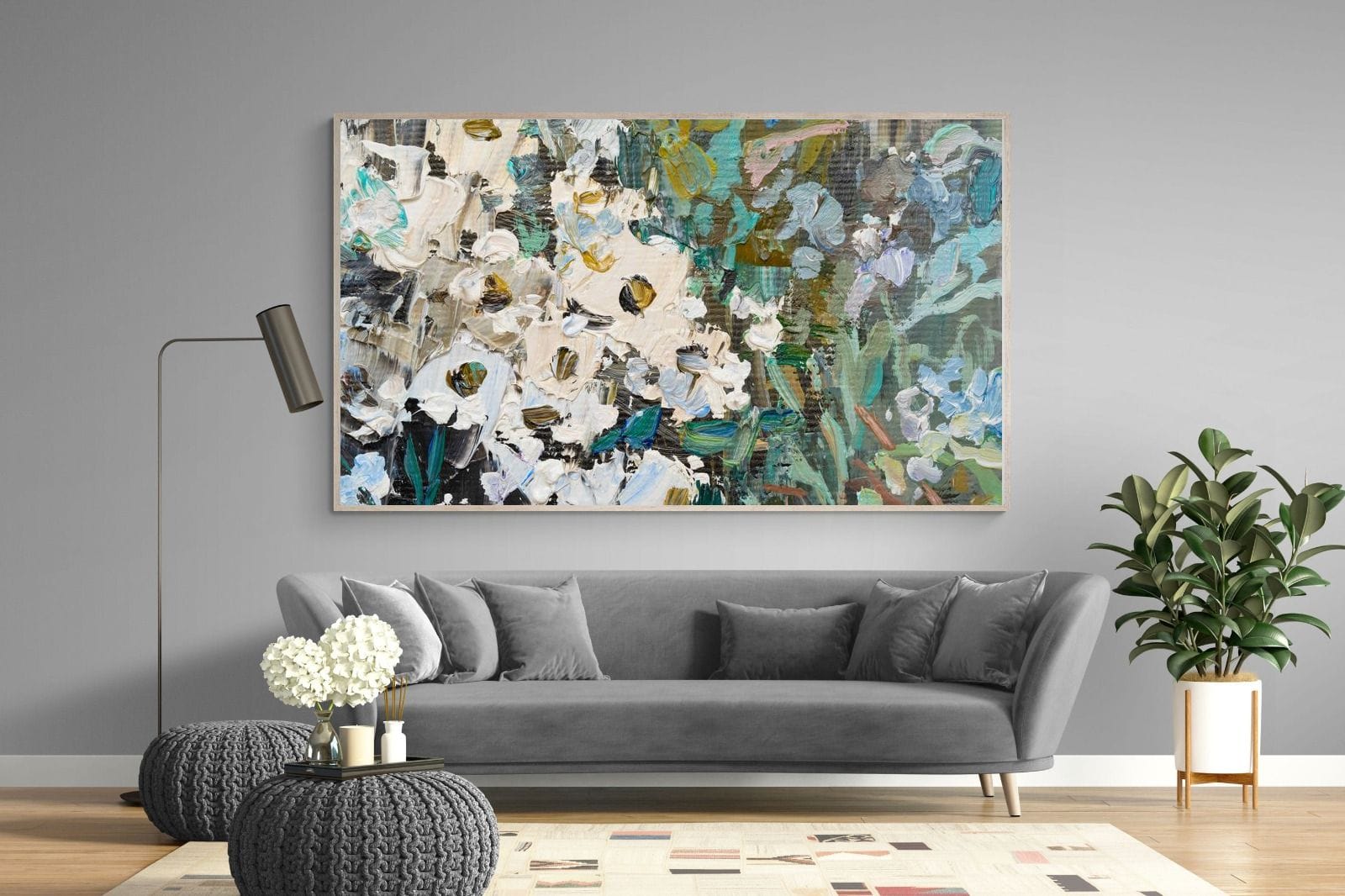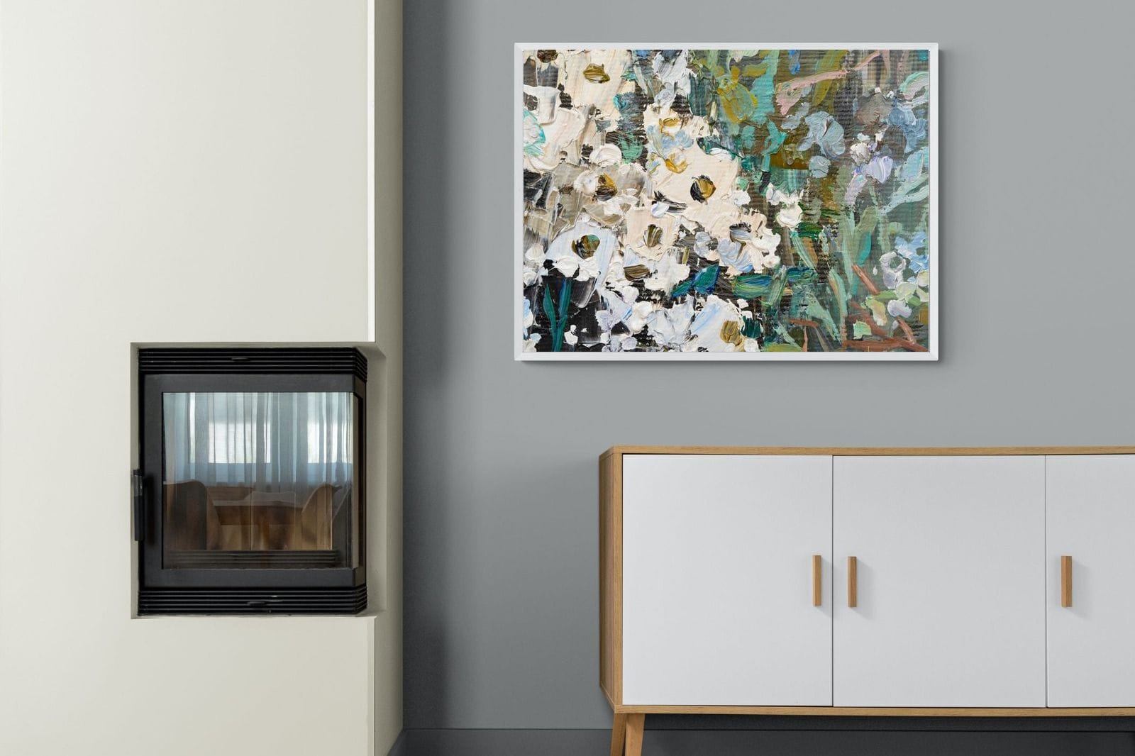 Thick, expressive strokes of oil paint form a lively abstract garden, where whites, greens, golds and muted blues dance across the canvas. The impasto technique adds depth and movement, making the flowers feel sculpted and tangible. Ideal for modern or eclectic spaces, this artwork brings organic energy and tactile richness to any wall, especially in lounges, dining rooms, or creative studios.