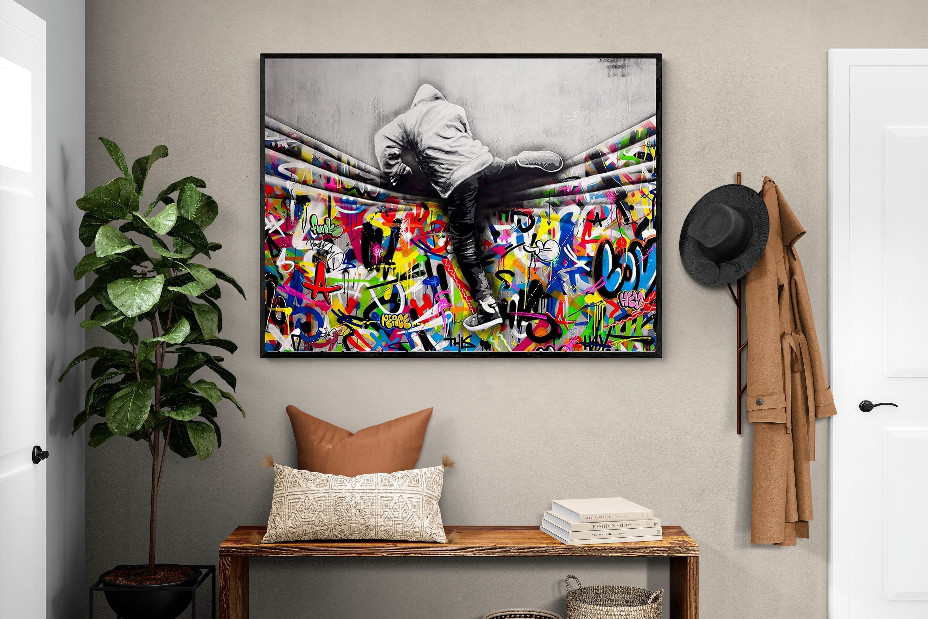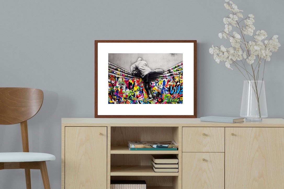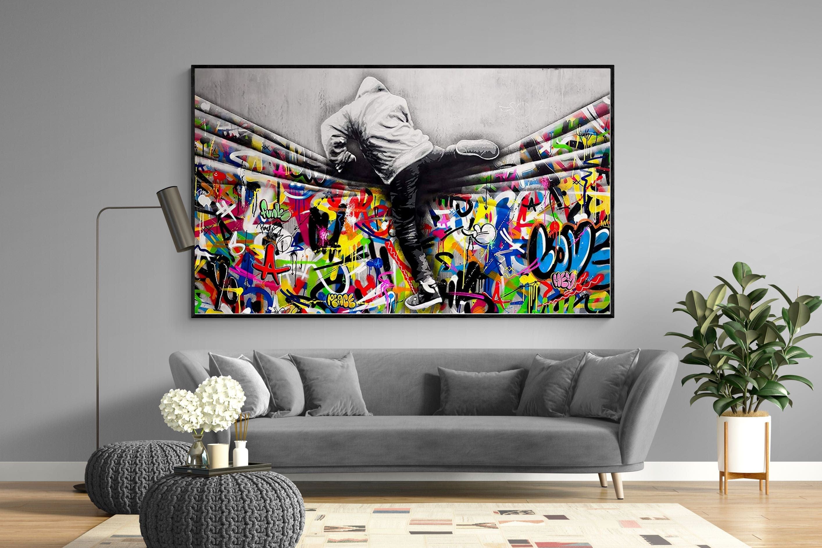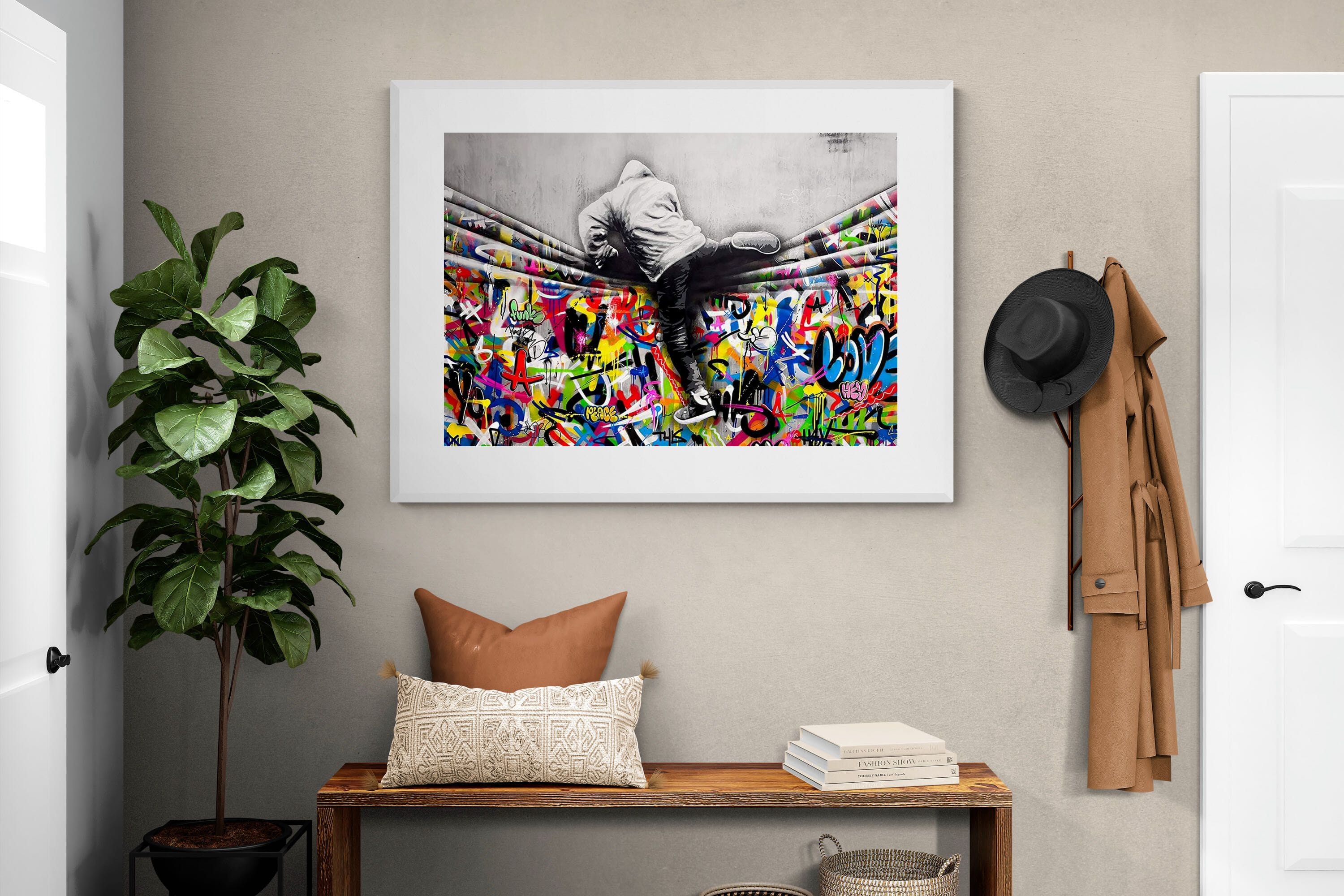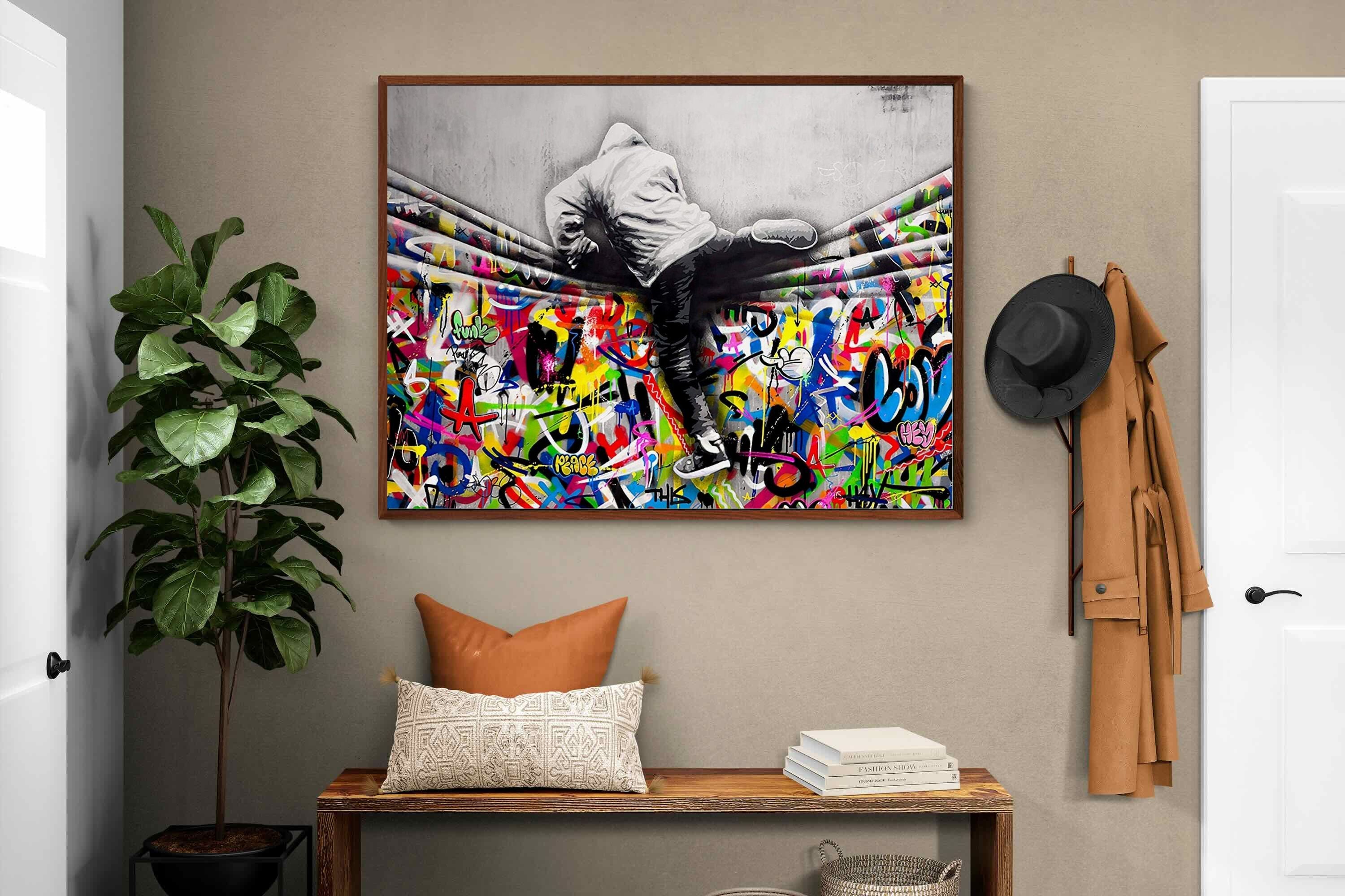 “Over the Curtain” is a striking urban art piece blending monochrome realism with chaotic colour. A hooded figure scales a curtain-like barrier, revealing a riot of graffiti beneath. The dramatic contrast between grayscale and vivid spray paint gives the illusion of tearing through dimensions—symbolic of rebellion, freedom, and expression. A bold statement for modern interiors, this artwork energises any space with its streetwise edge and visual storytelling.