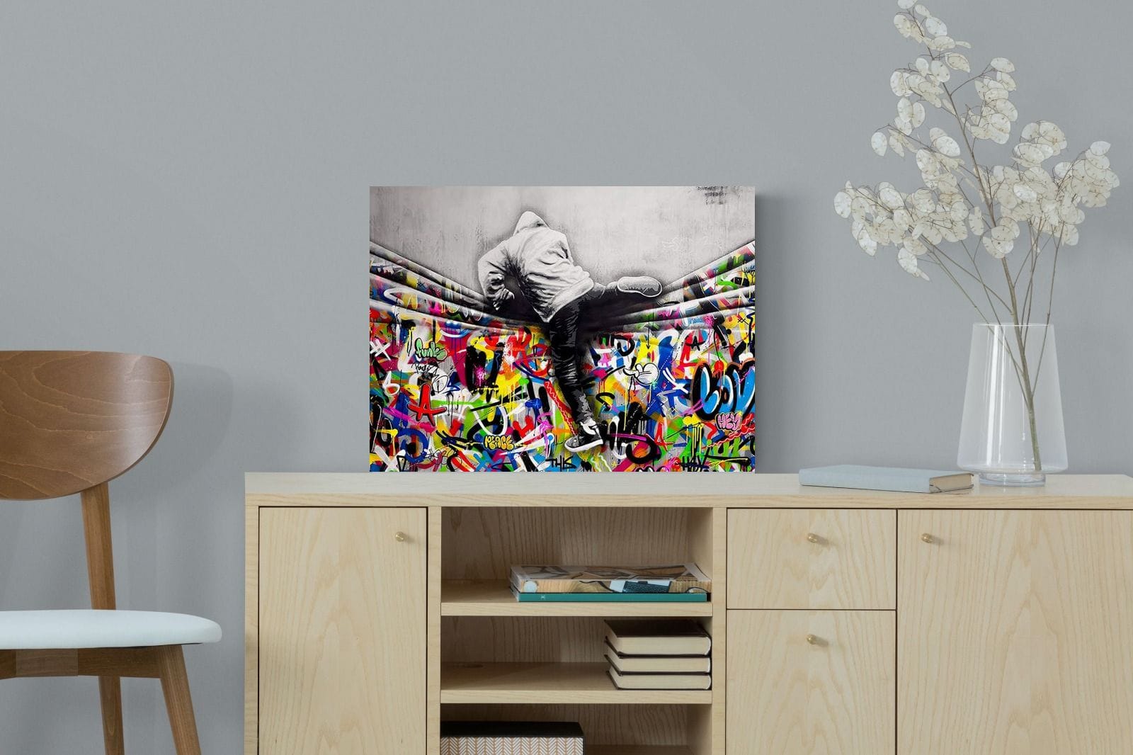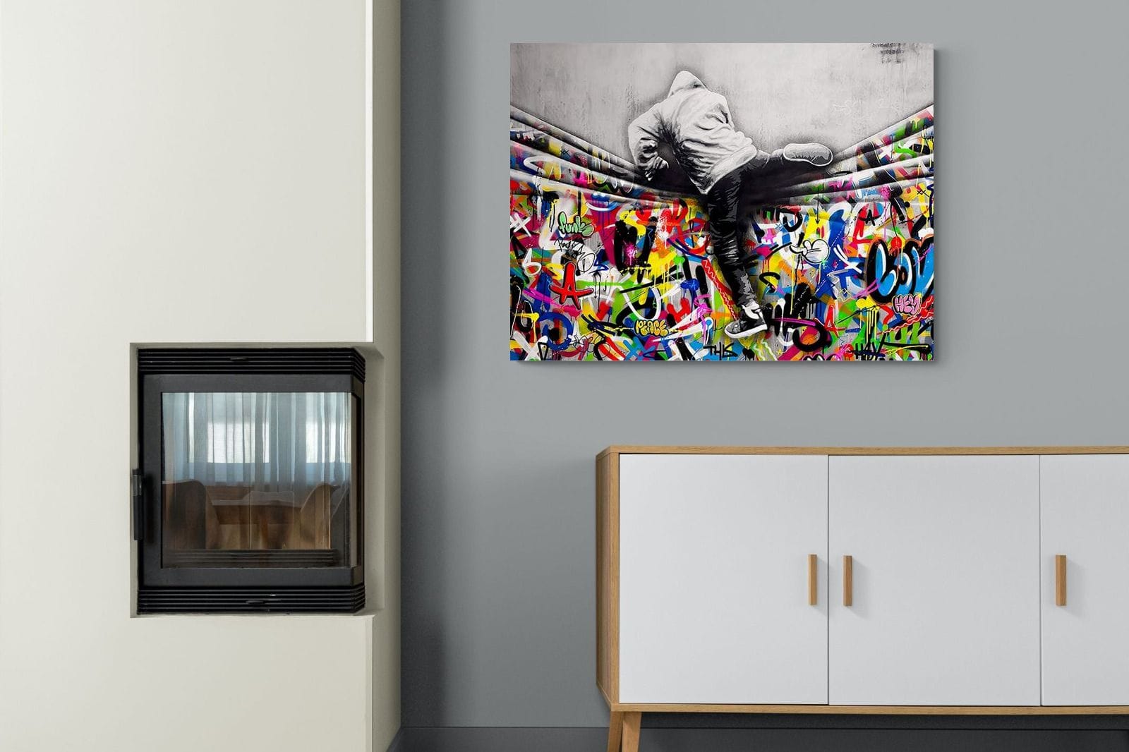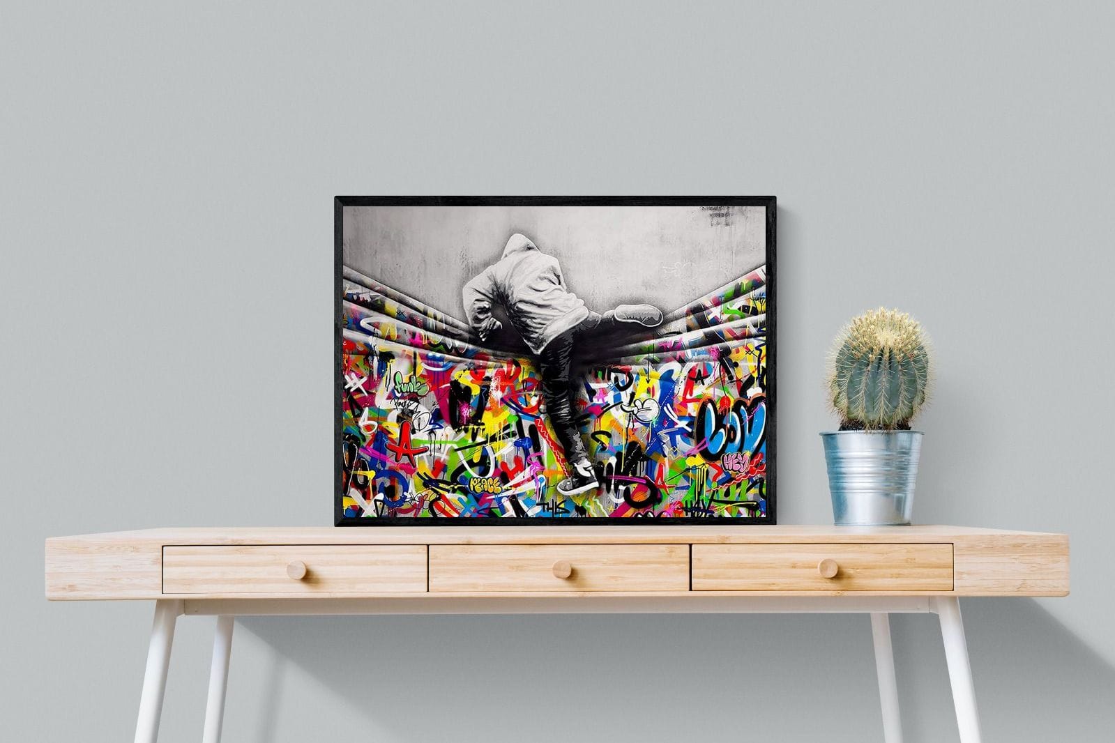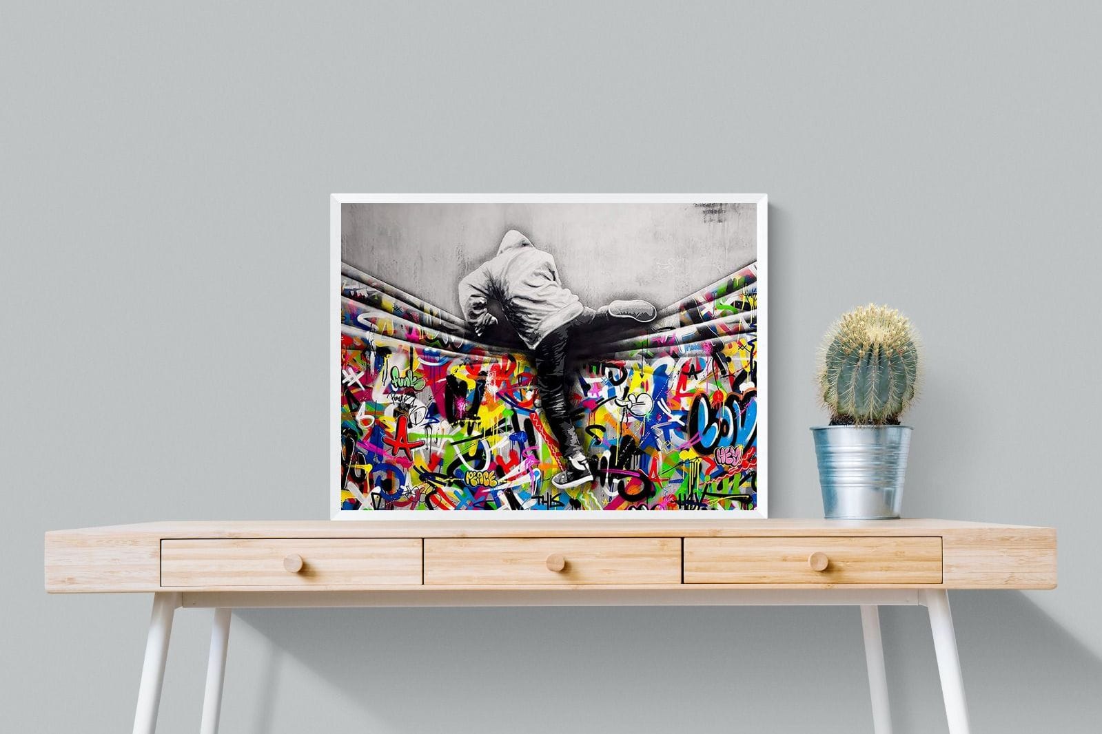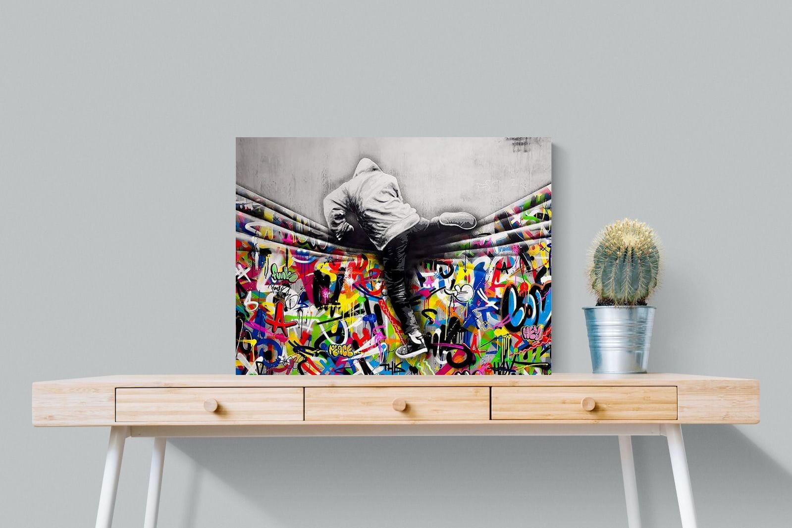 “Over the Curtain” is a striking urban art piece blending monochrome realism with chaotic colour. A hooded figure scales a curtain-like barrier, revealing a riot of graffiti beneath. The dramatic contrast between grayscale and vivid spray paint gives the illusion of tearing through dimensions—symbolic of rebellion, freedom, and expression. A bold statement for modern interiors, this artwork energises any space with its streetwise edge and visual storytelling.