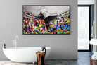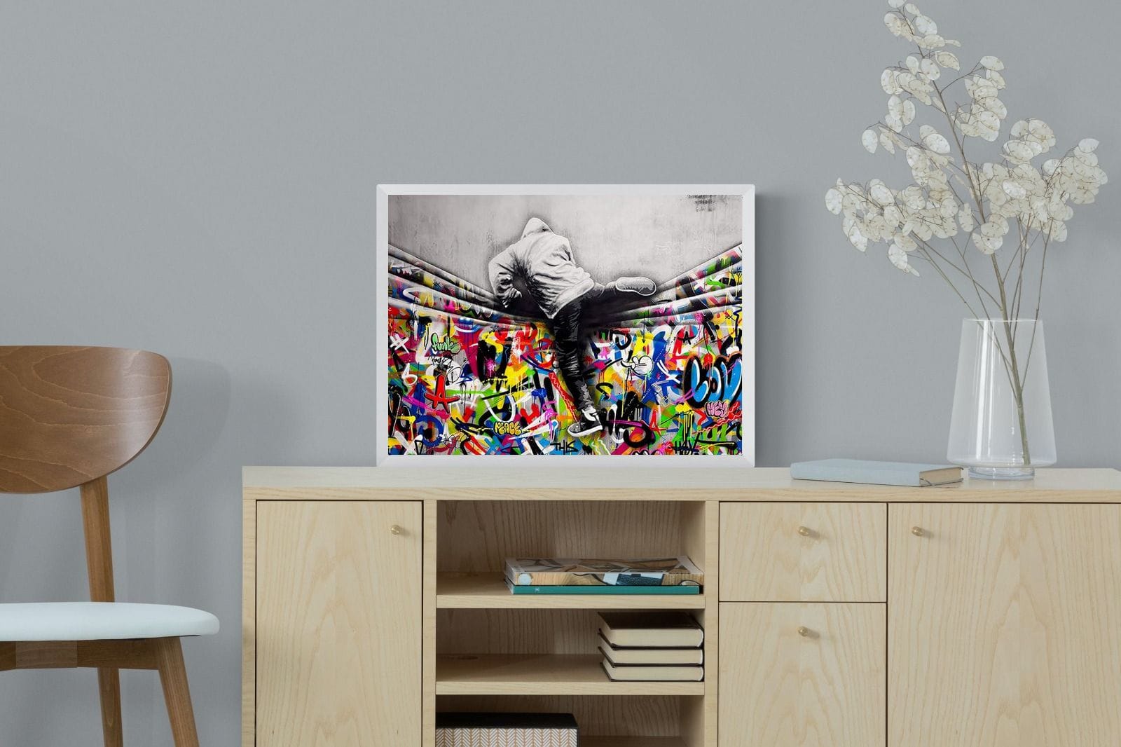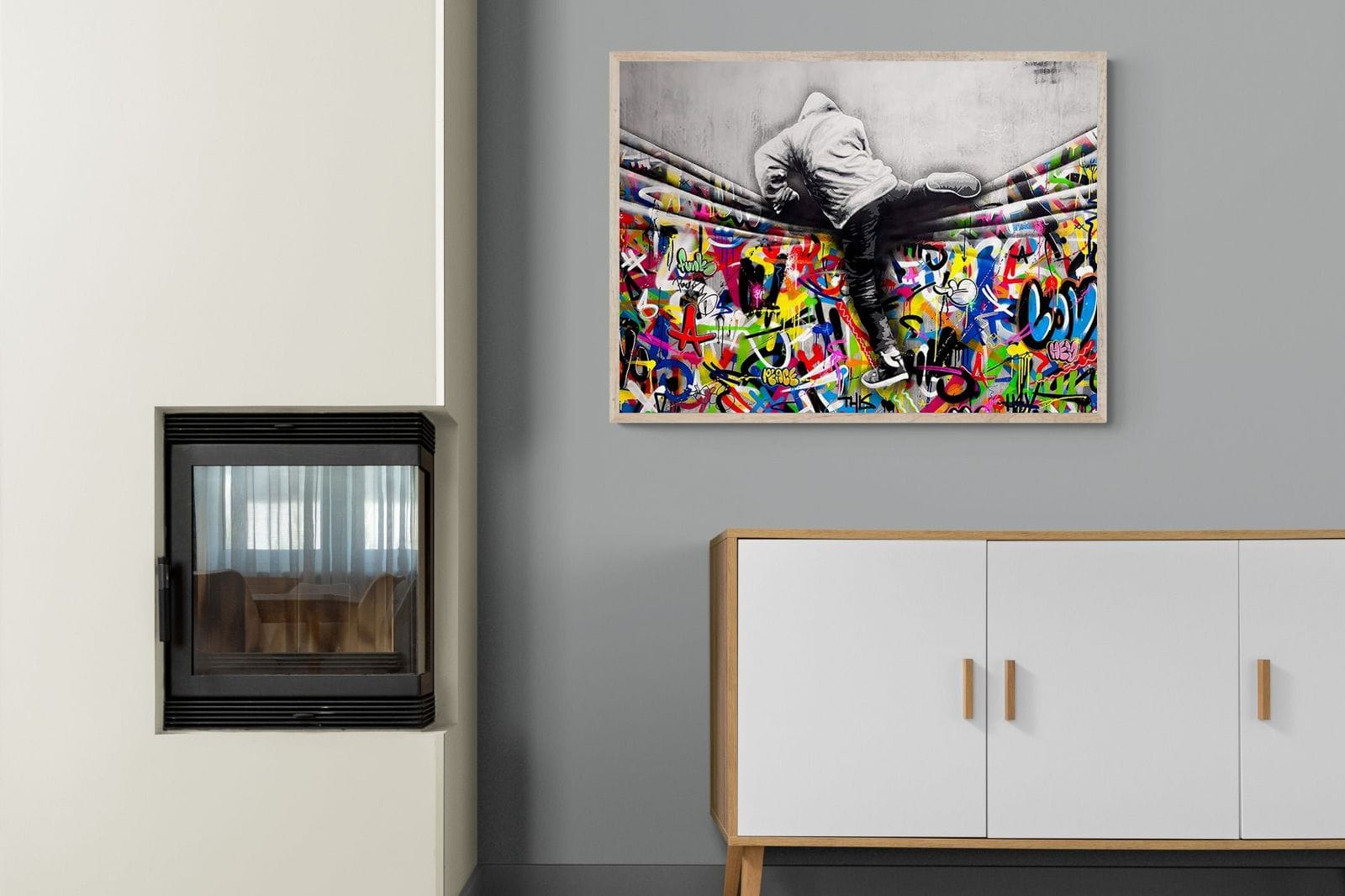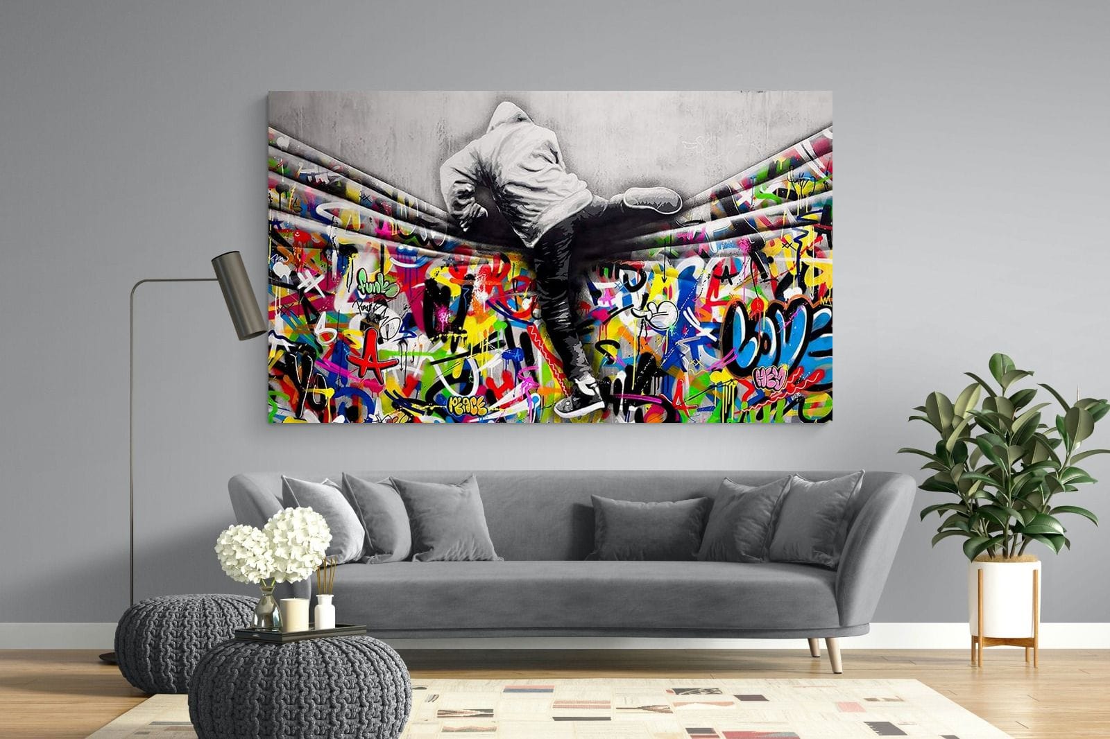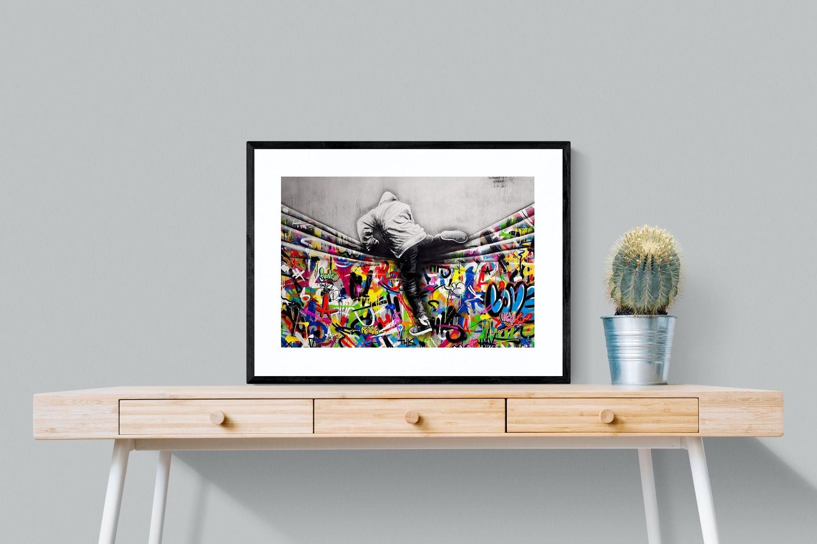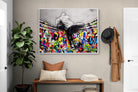 “Over the Curtain” is a striking urban art piece blending monochrome realism with chaotic colour. A hooded figure scales a curtain-like barrier, revealing a riot of graffiti beneath. The dramatic contrast between grayscale and vivid spray paint gives the illusion of tearing through dimensions—symbolic of rebellion, freedom, and expression. A bold statement for modern interiors, this artwork energises any space with its streetwise edge and visual storytelling.
