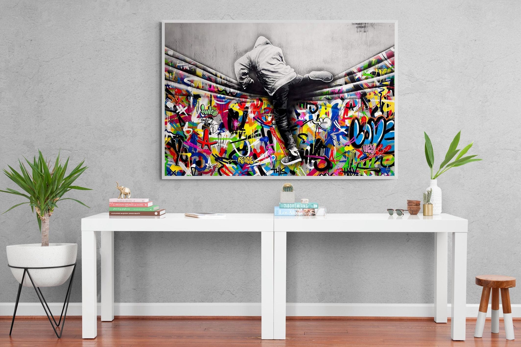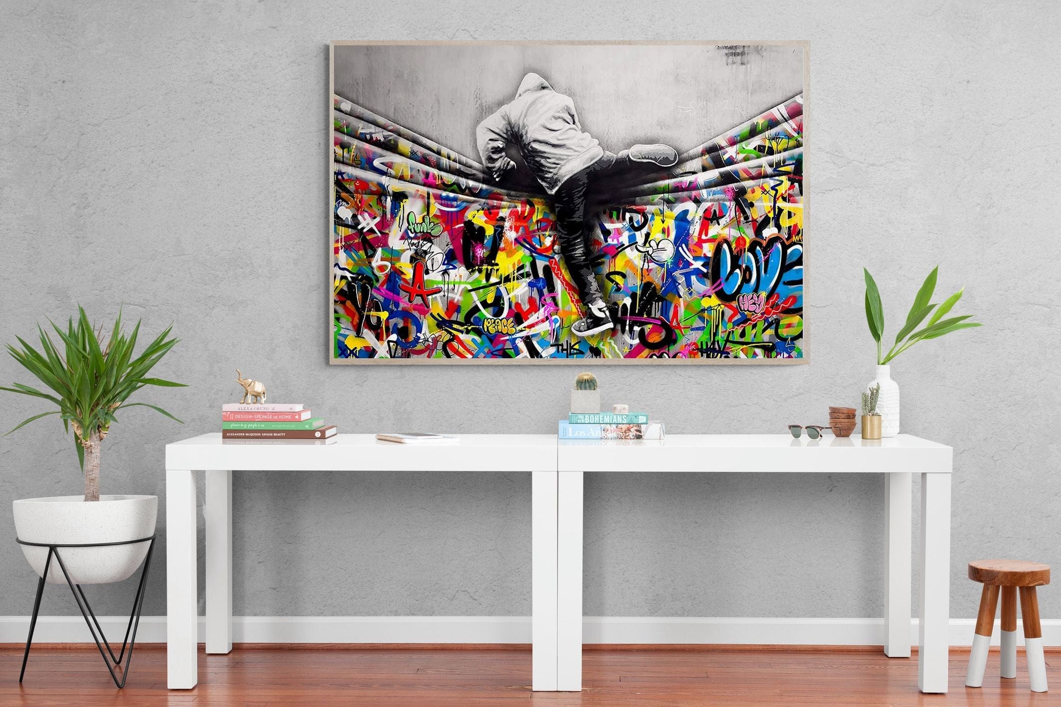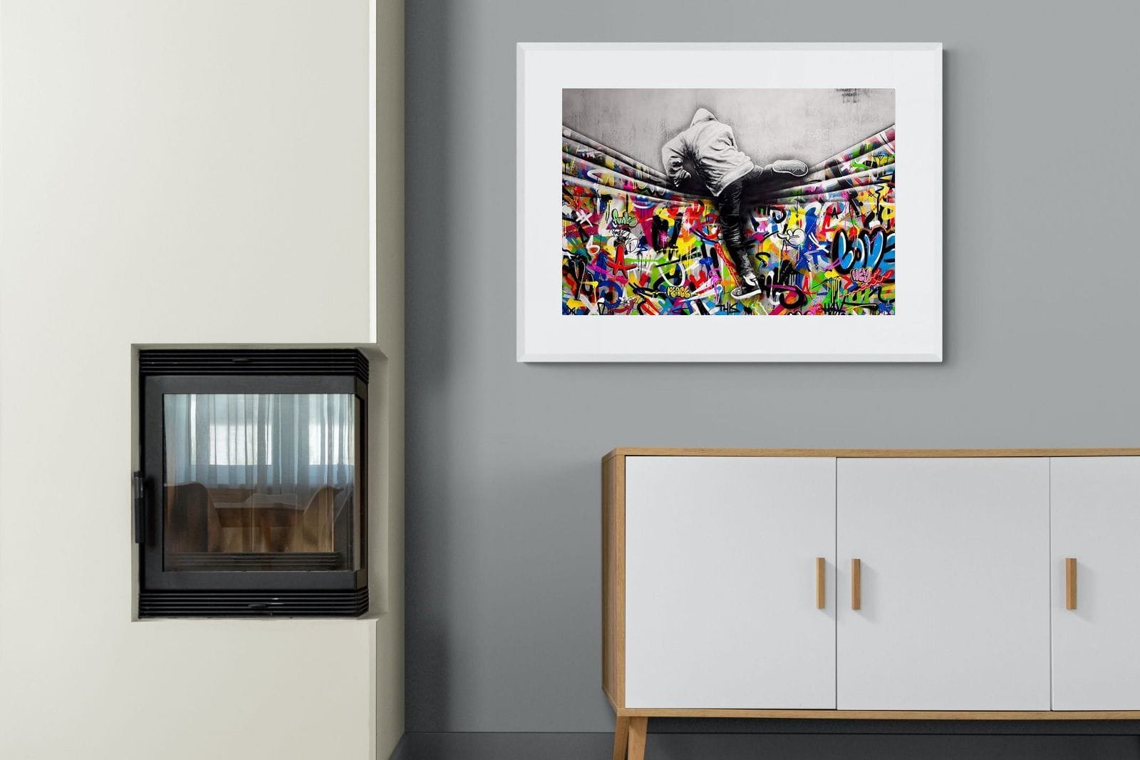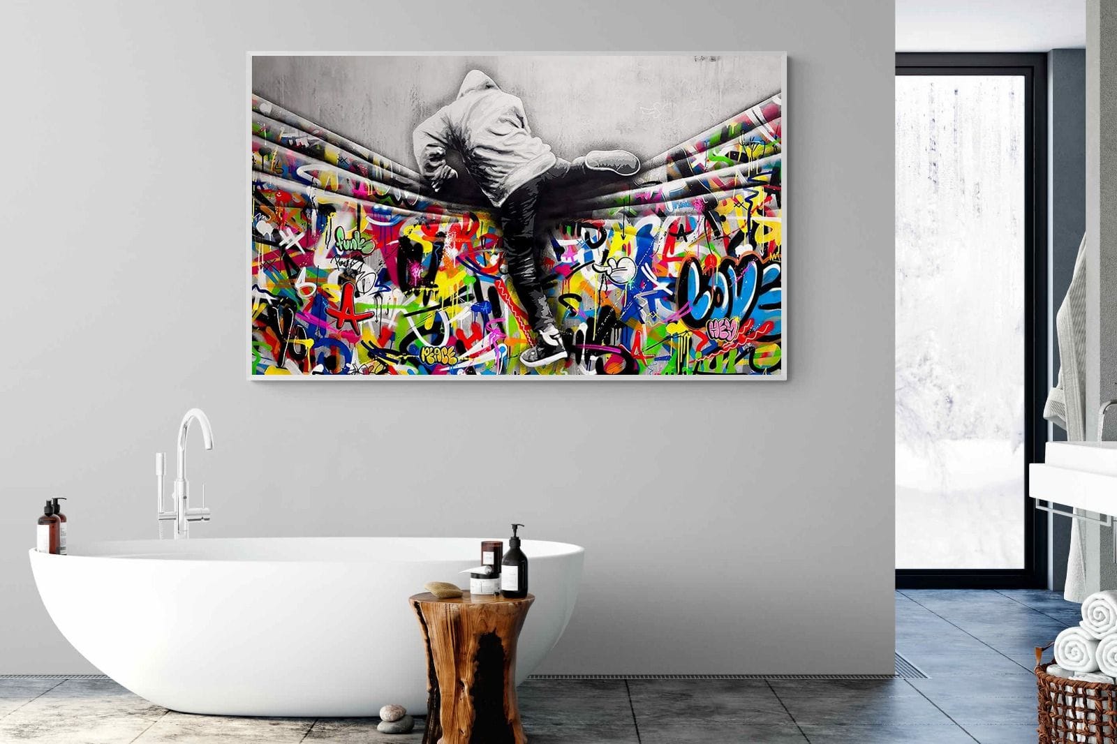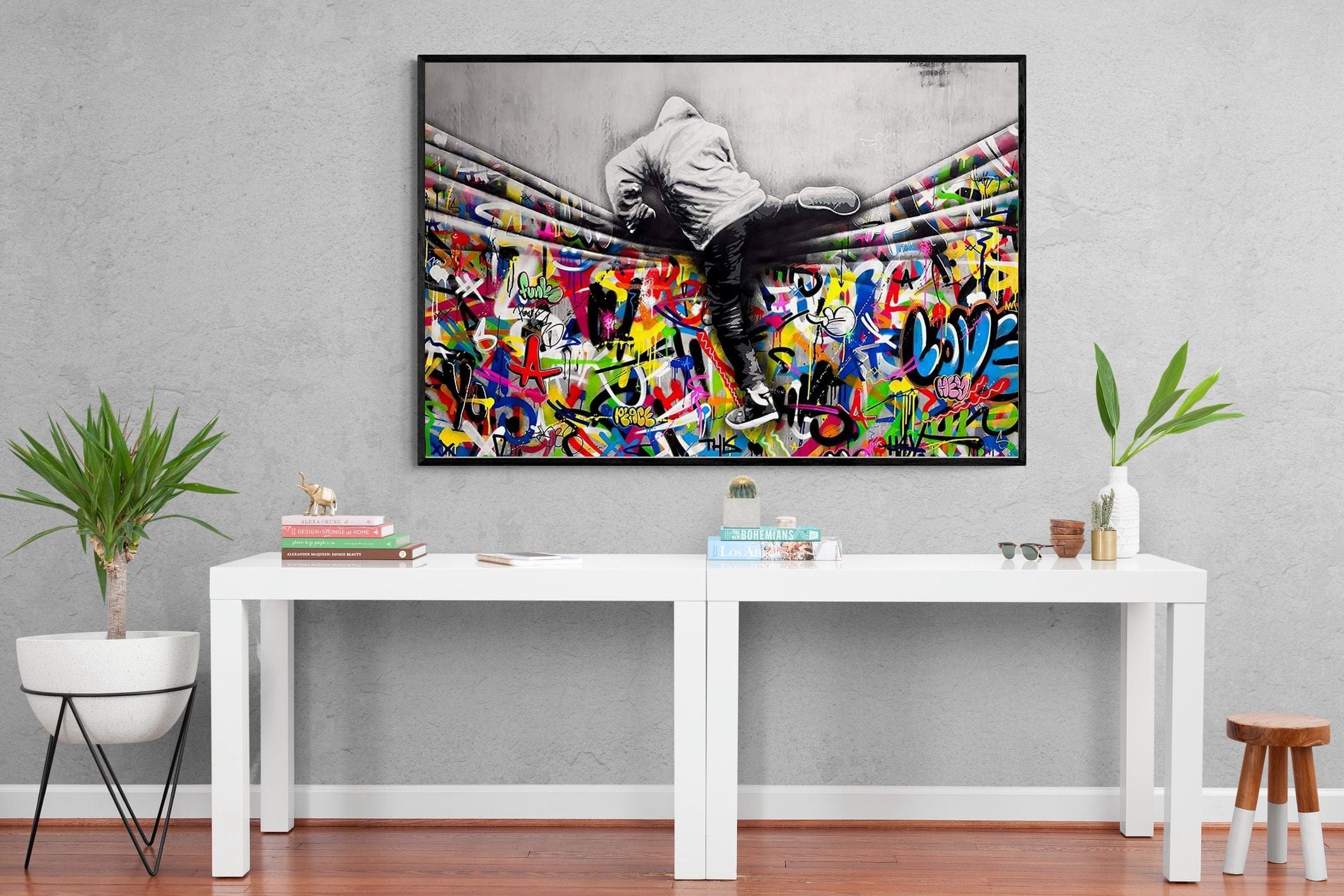 “Over the Curtain” is a striking urban art piece blending monochrome realism with chaotic colour. A hooded figure scales a curtain-like barrier, revealing a riot of graffiti beneath. The dramatic contrast between grayscale and vivid spray paint gives the illusion of tearing through dimensions—symbolic of rebellion, freedom, and expression. A bold statement for modern interiors, this artwork energises any space with its streetwise edge and visual storytelling.