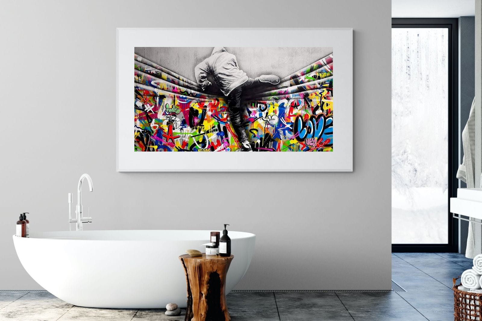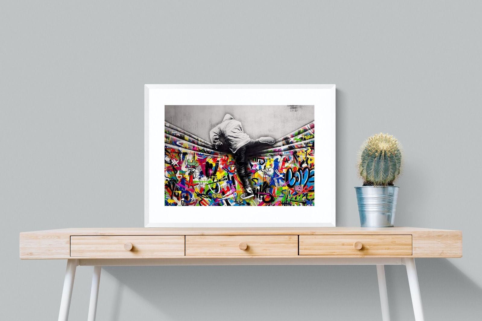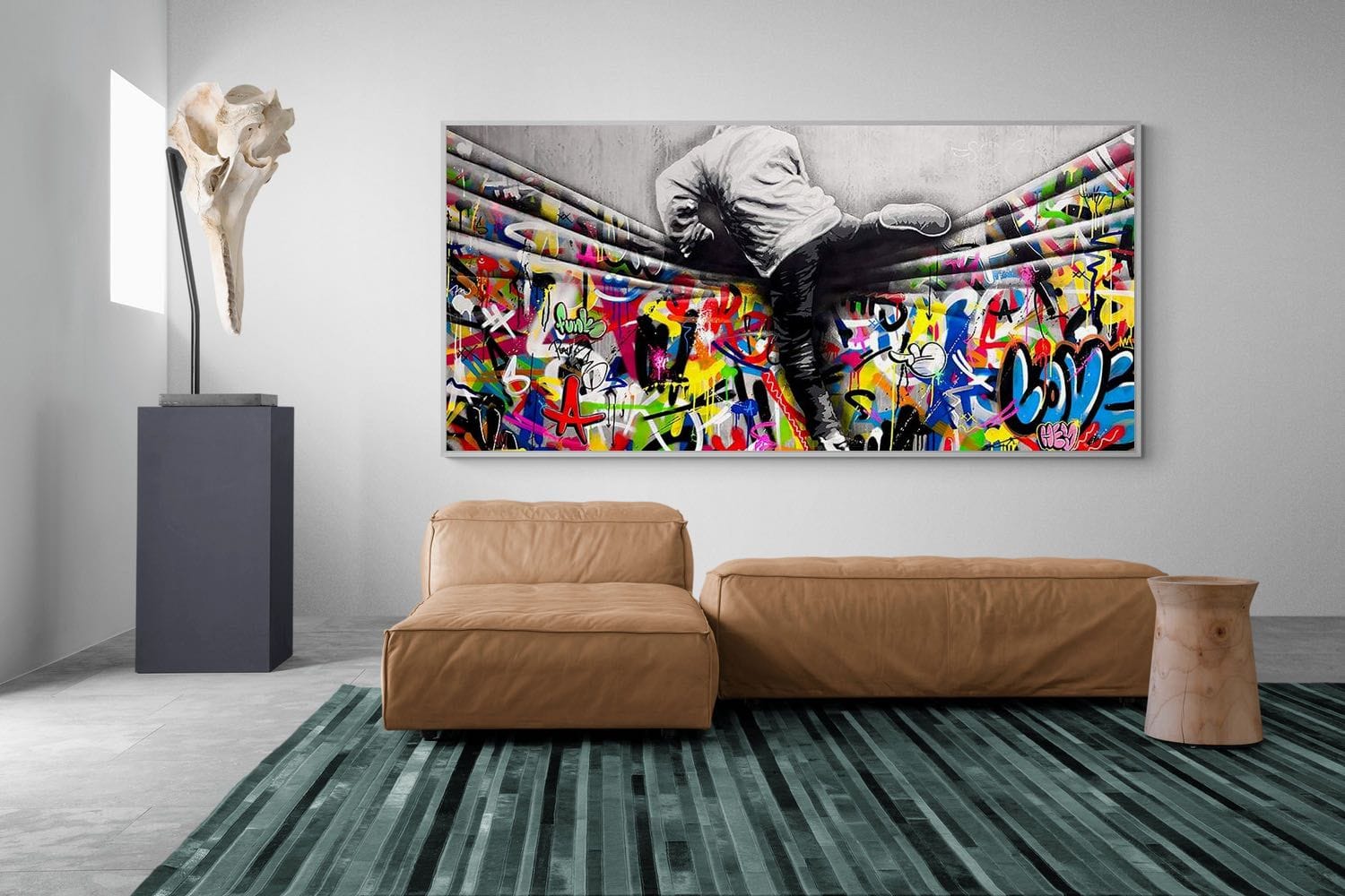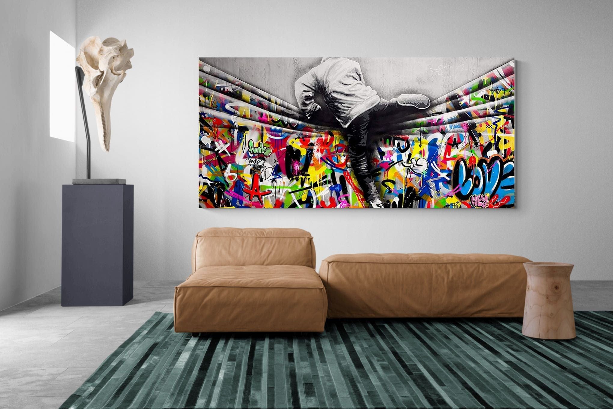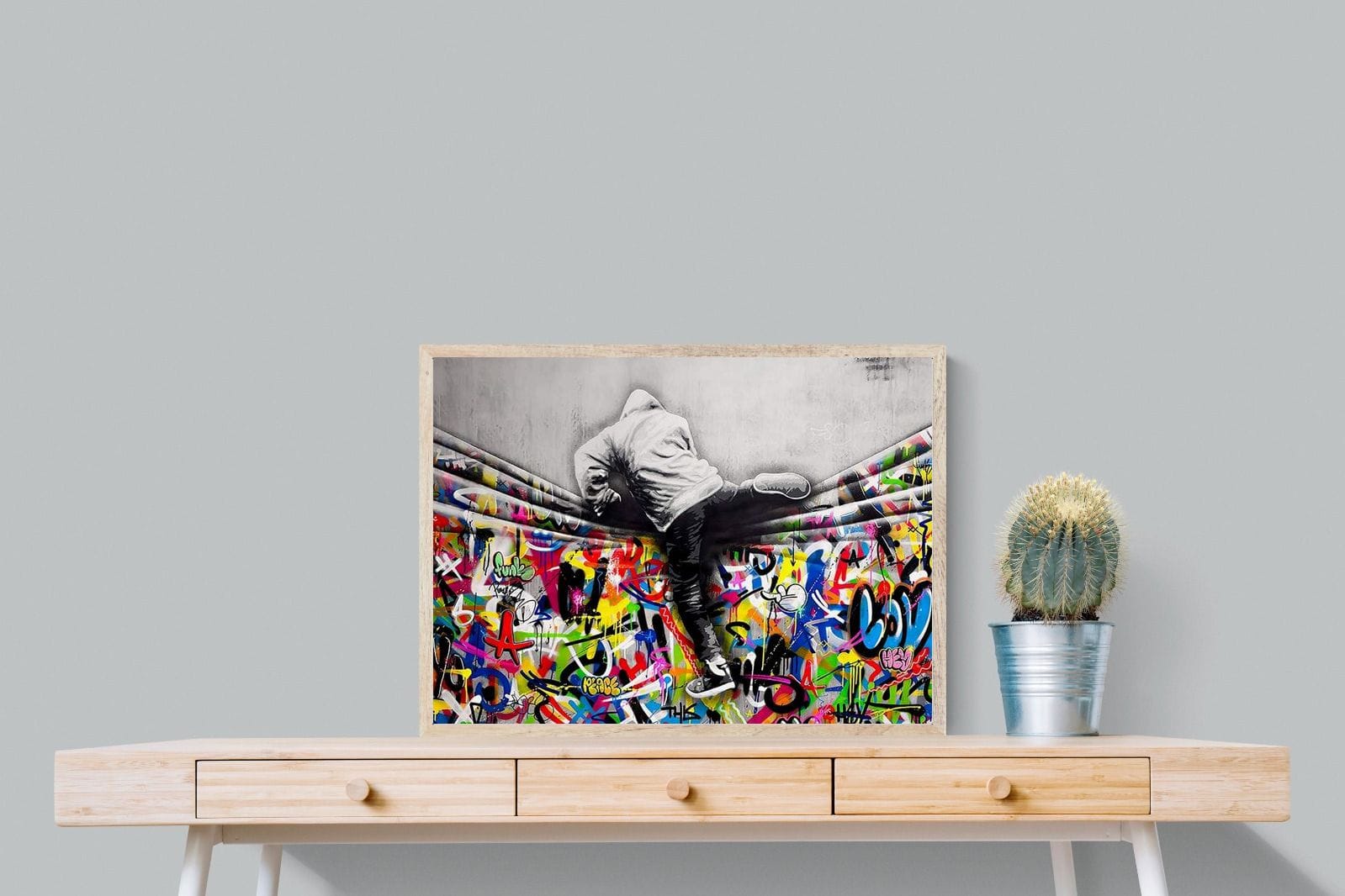 “Over the Curtain” is a striking urban art piece blending monochrome realism with chaotic colour. A hooded figure scales a curtain-like barrier, revealing a riot of graffiti beneath. The dramatic contrast between grayscale and vivid spray paint gives the illusion of tearing through dimensions—symbolic of rebellion, freedom, and expression. A bold statement for modern interiors, this artwork energises any space with its streetwise edge and visual storytelling.