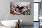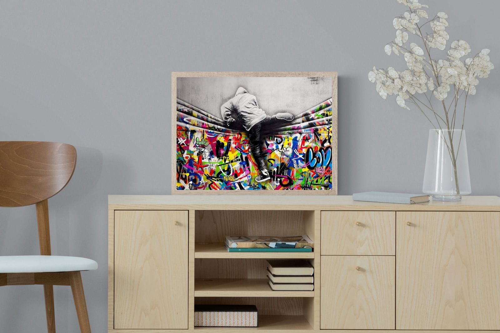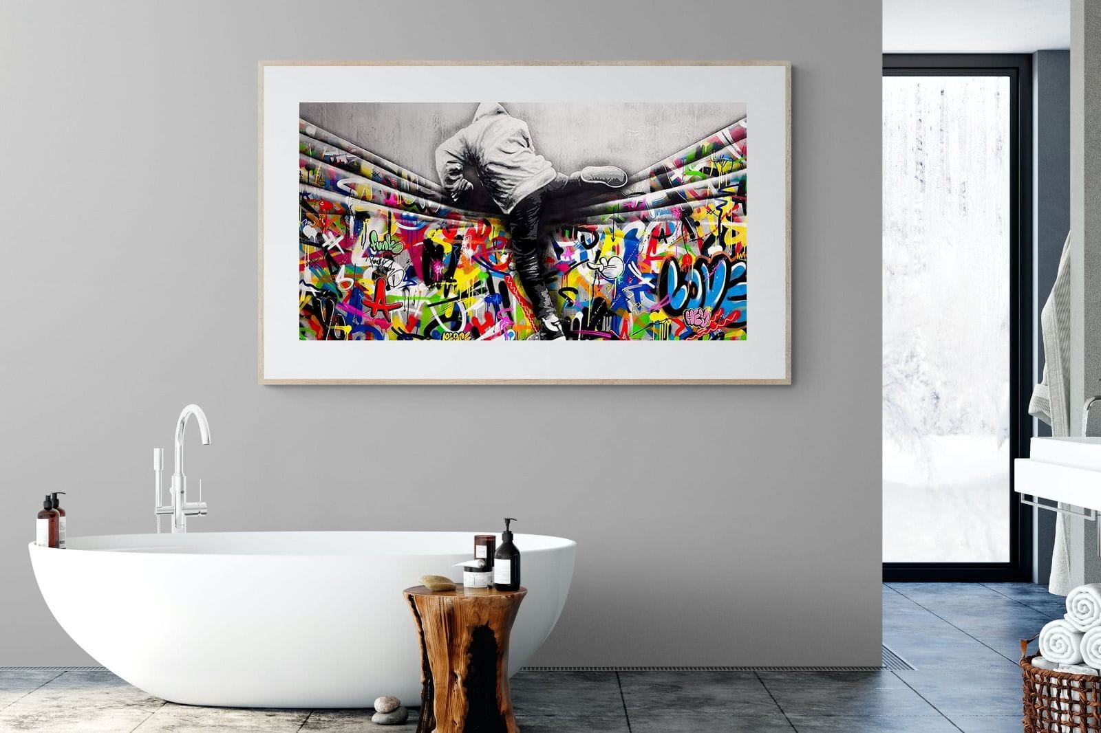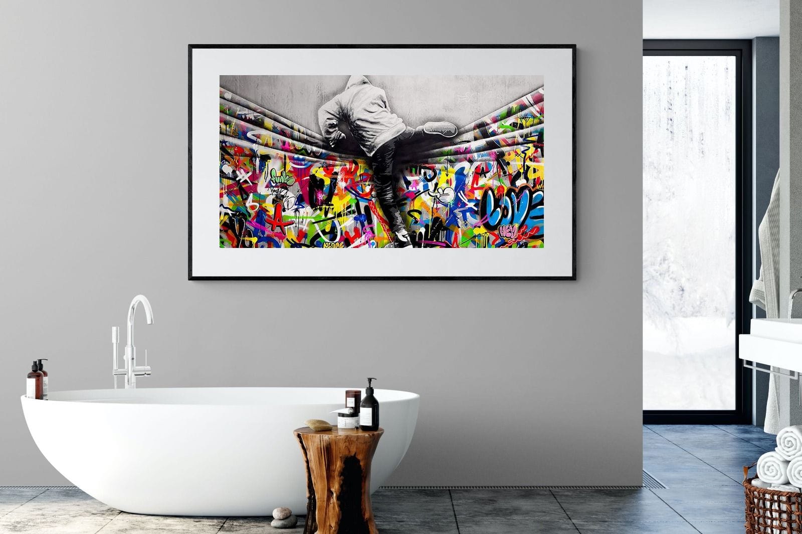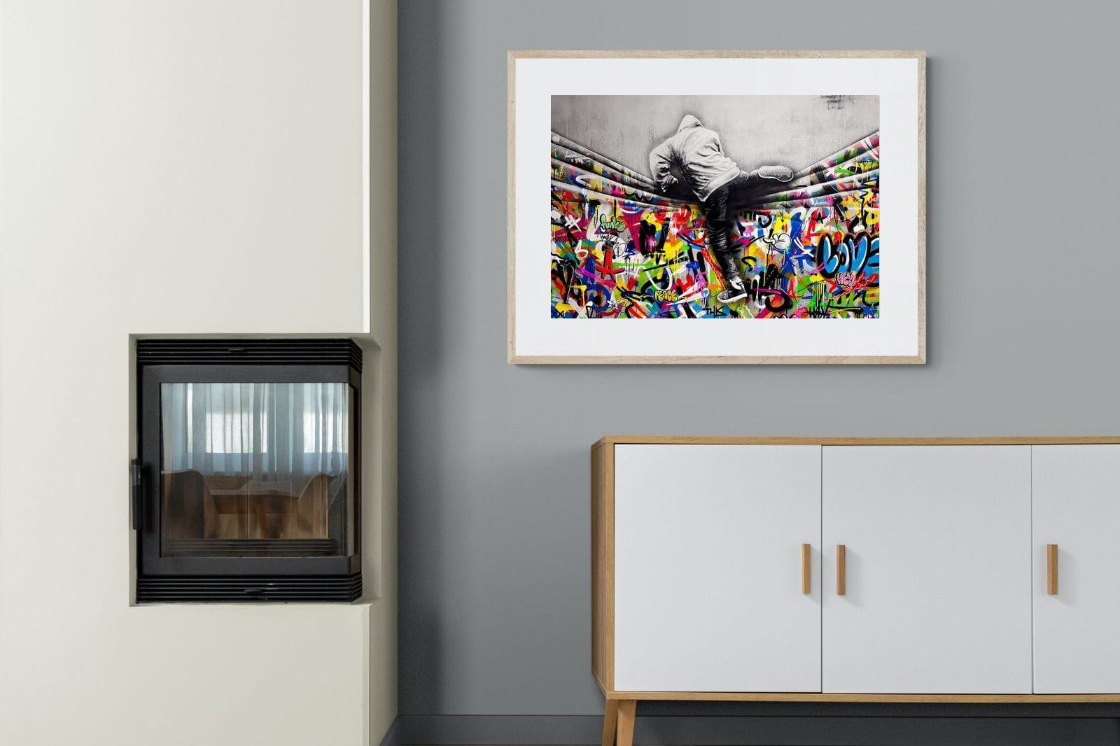 “Over the Curtain” is a striking urban art piece blending monochrome realism with chaotic colour. A hooded figure scales a curtain-like barrier, revealing a riot of graffiti beneath. The dramatic contrast between grayscale and vivid spray paint gives the illusion of tearing through dimensions—symbolic of rebellion, freedom, and expression. A bold statement for modern interiors, this artwork energises any space with its streetwise edge and visual storytelling.