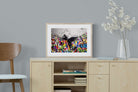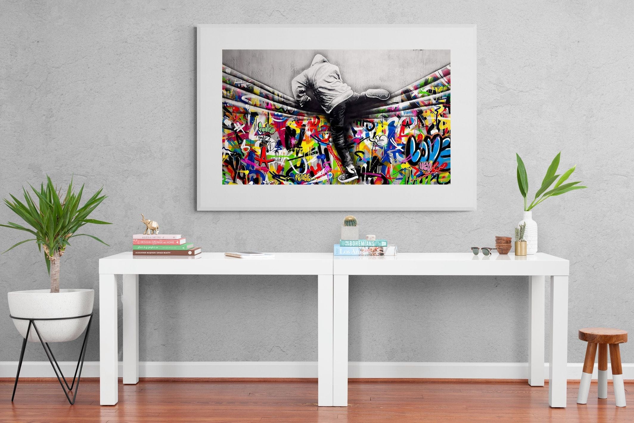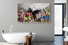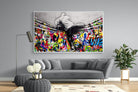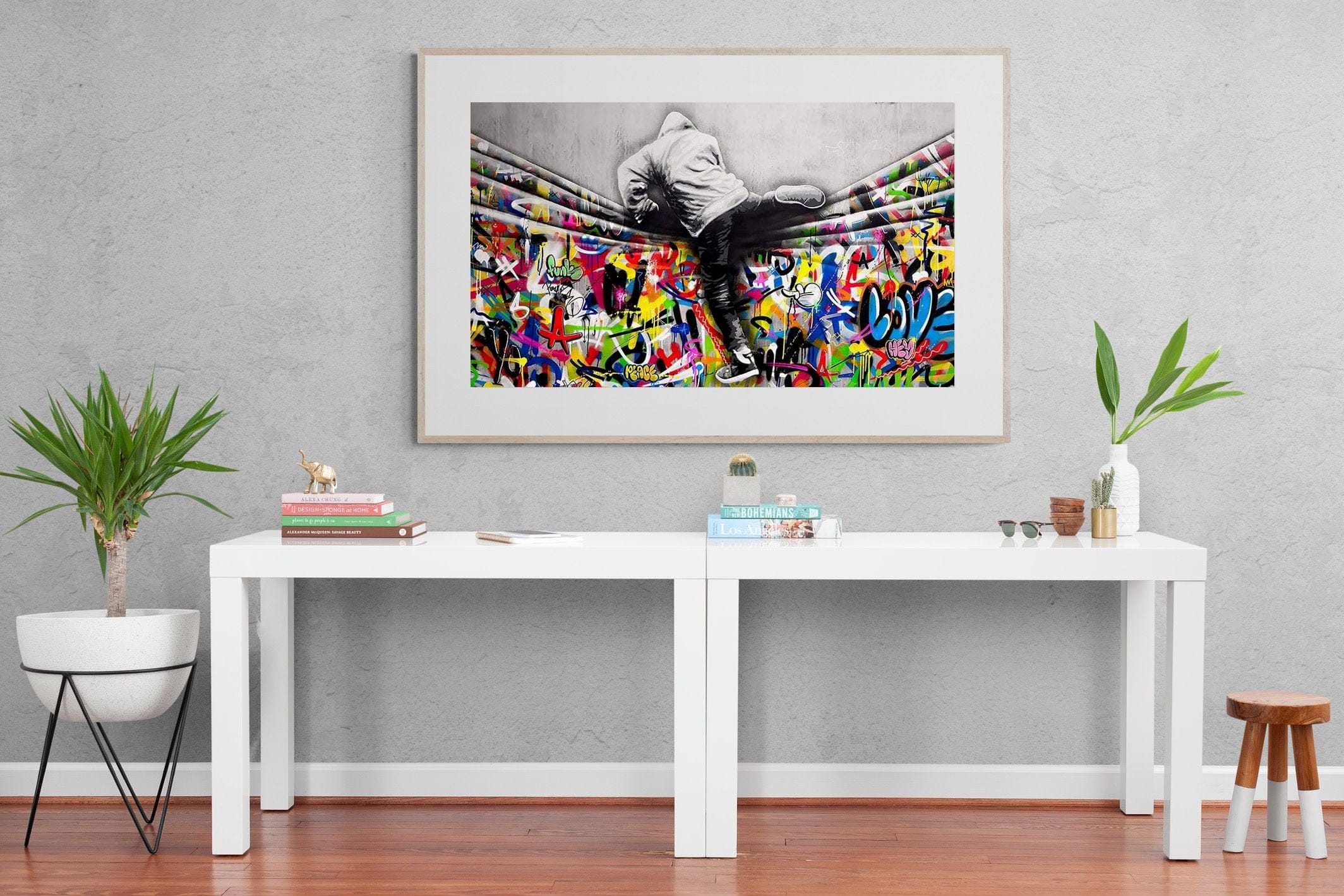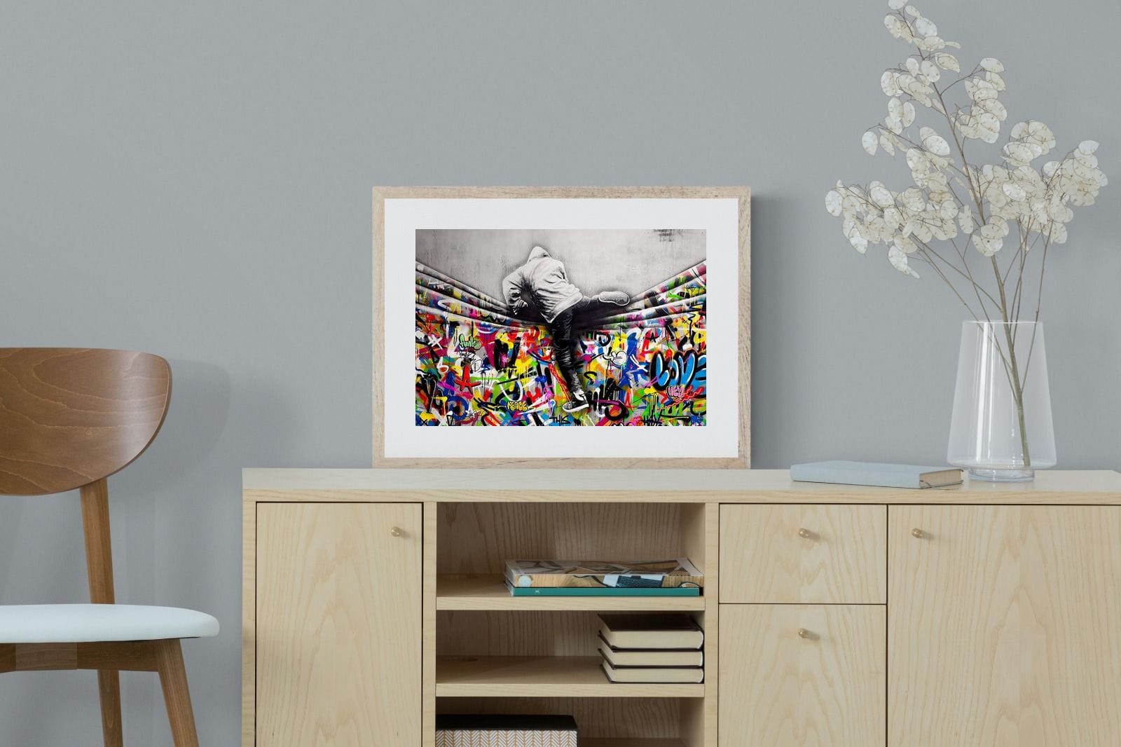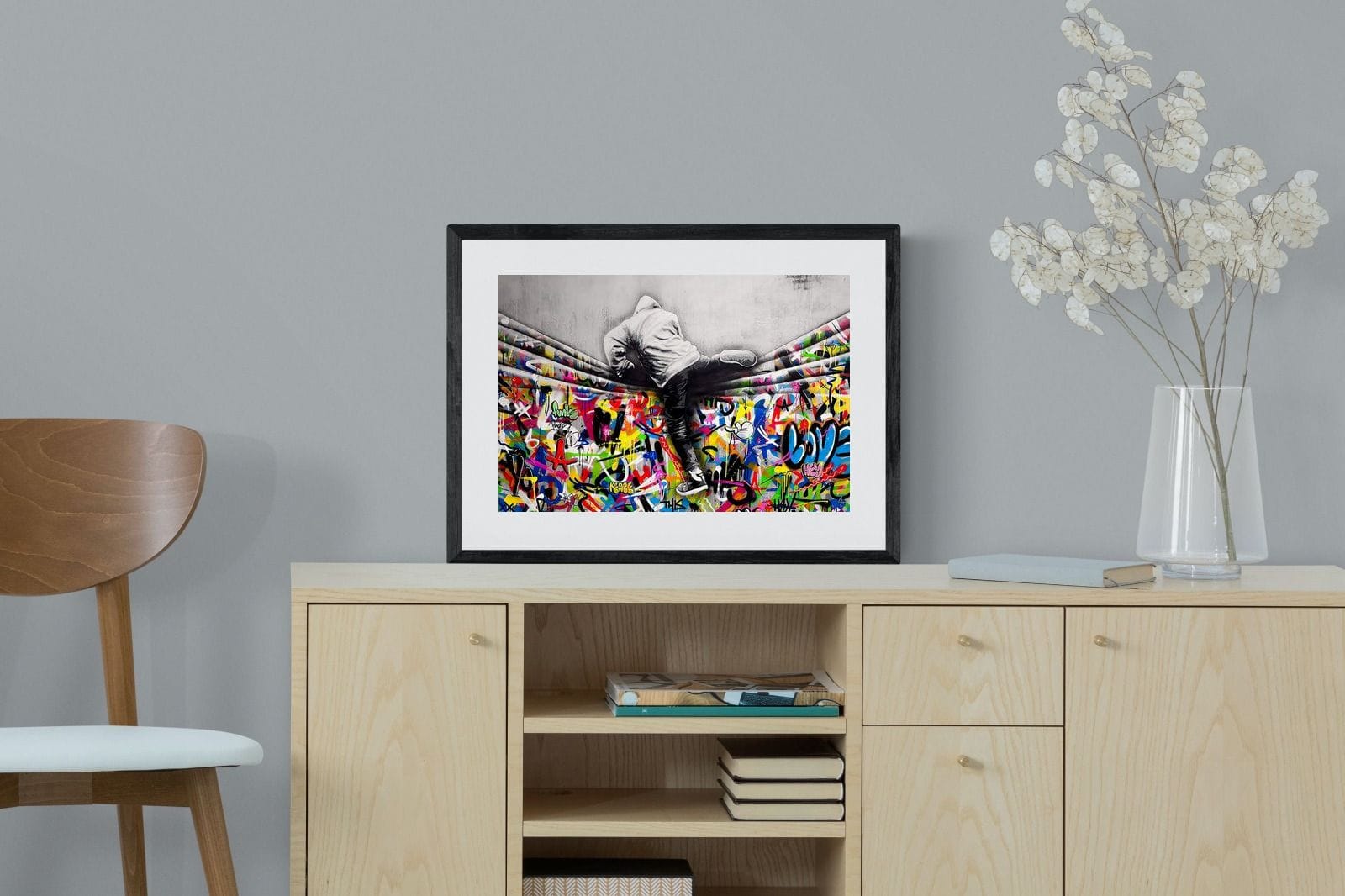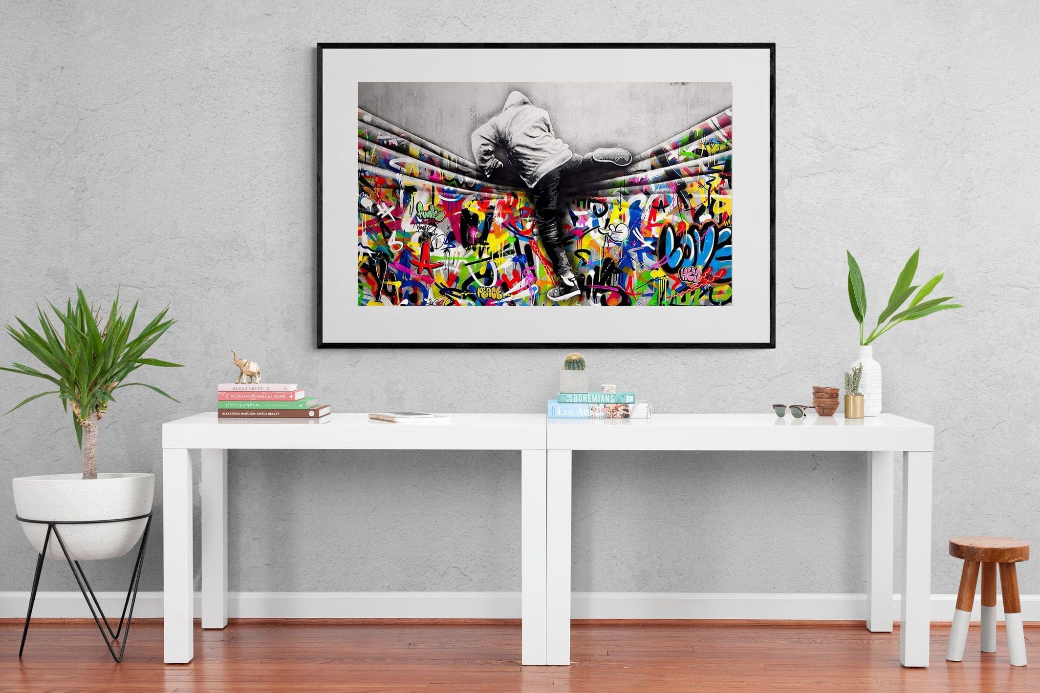“Over the Curtain” is a striking urban art piece blending monochrome realism with chaotic colour. A hooded figure scales a curtain-like barrier, revealing a riot of graffiti beneath. The dramatic contrast between grayscale and vivid spray paint gives the illusion of tearing through dimensions—symbolic of rebellion, freedom, and expression. A bold statement for modern interiors, this artwork energises any space with its streetwise edge and visual storytelling.