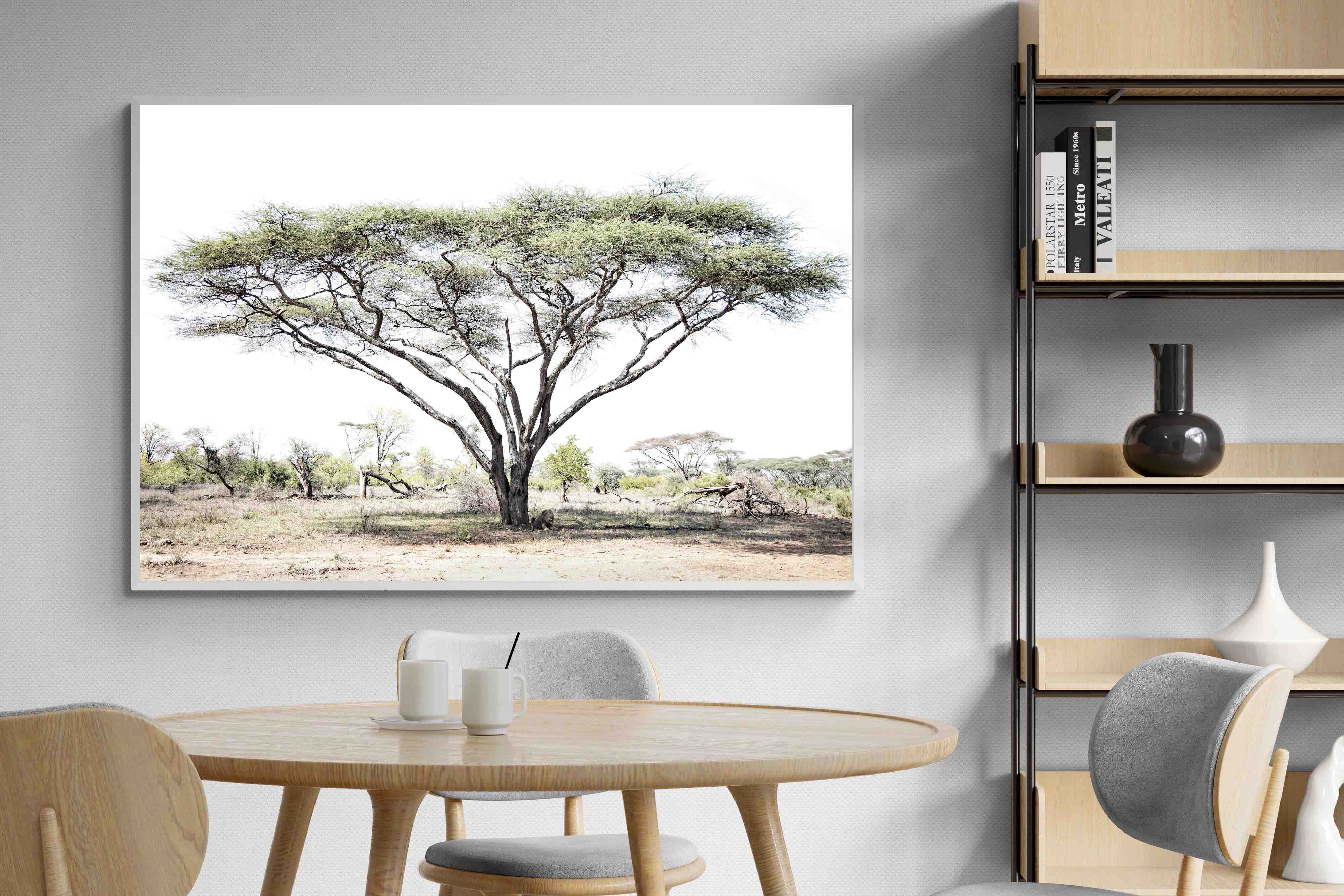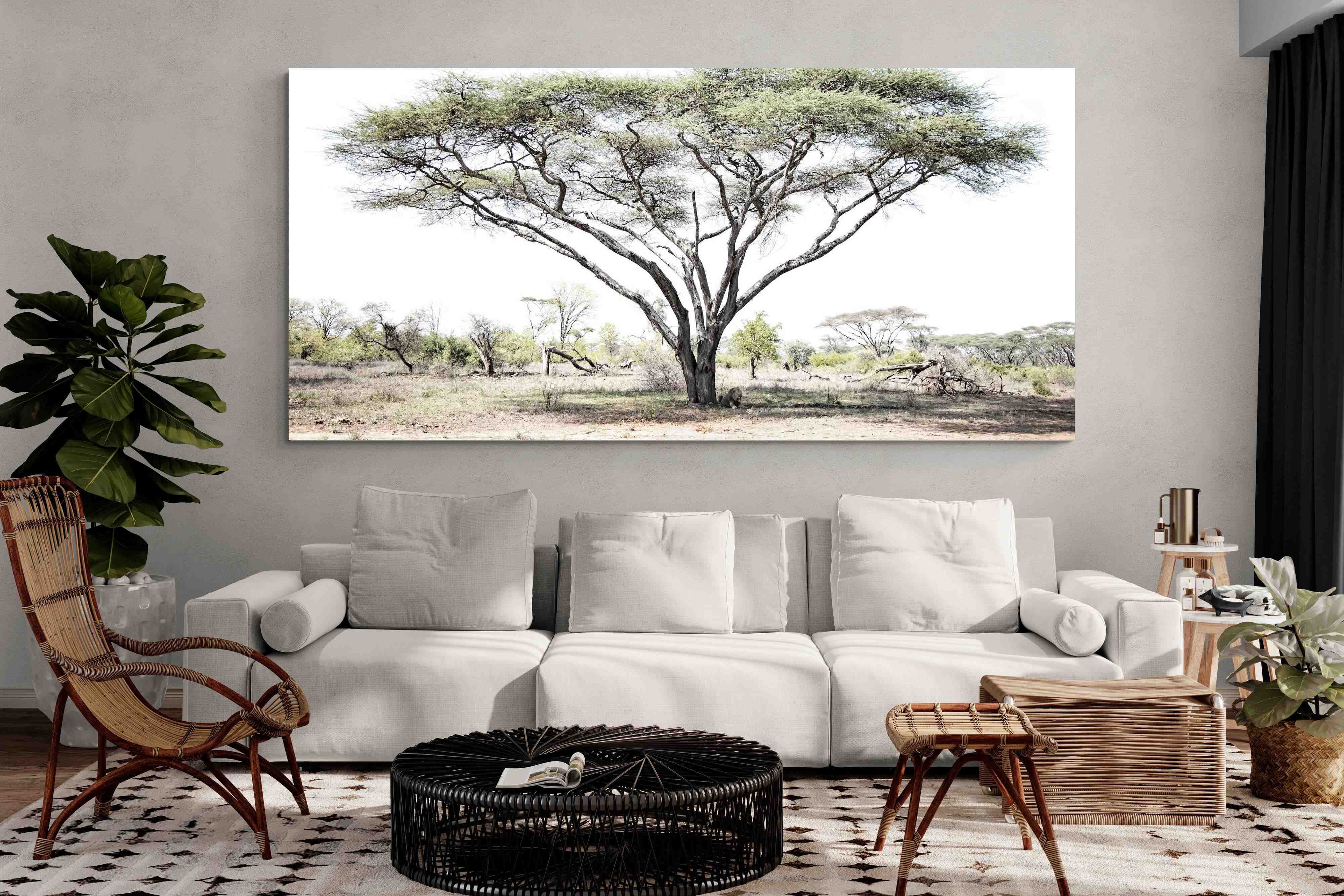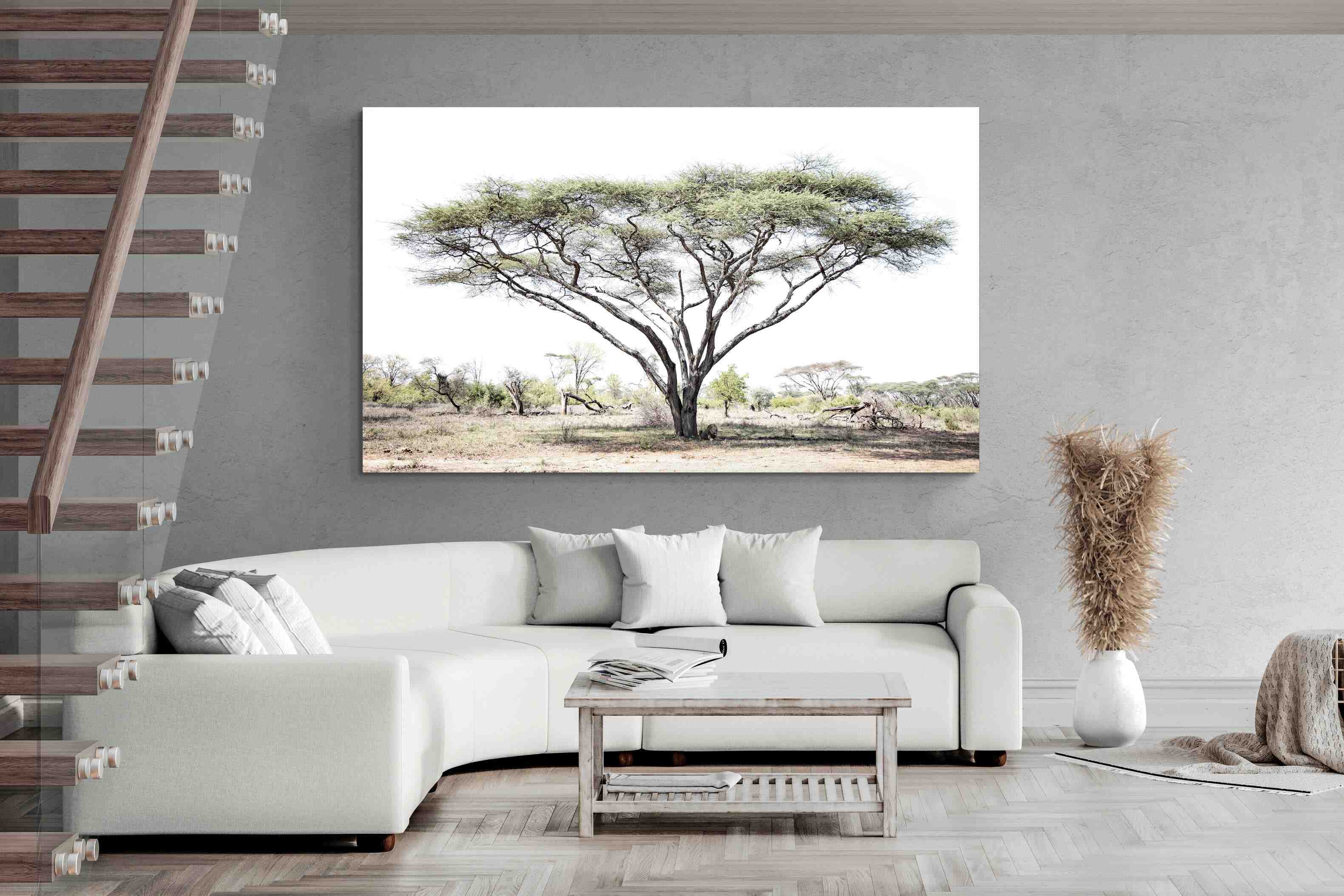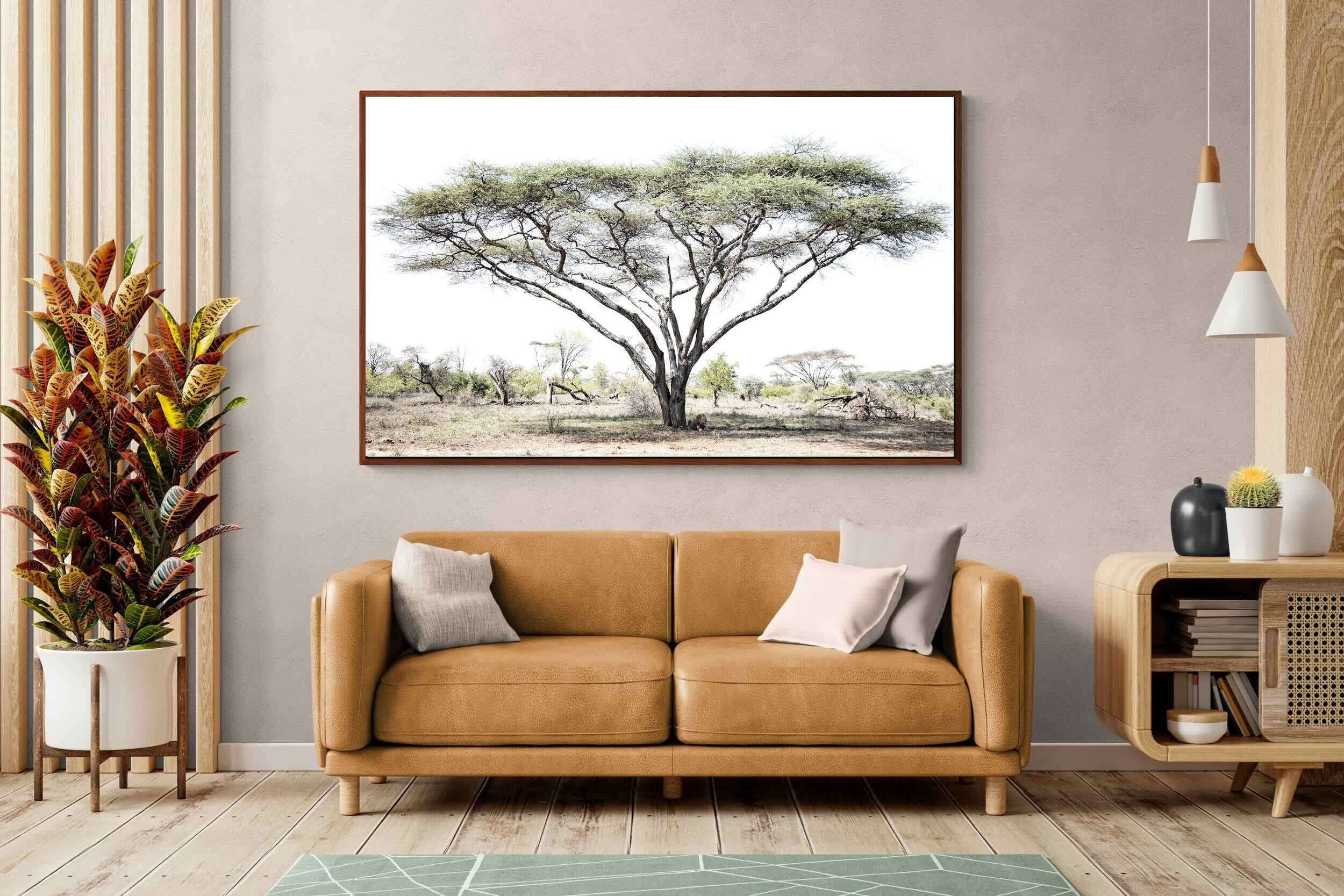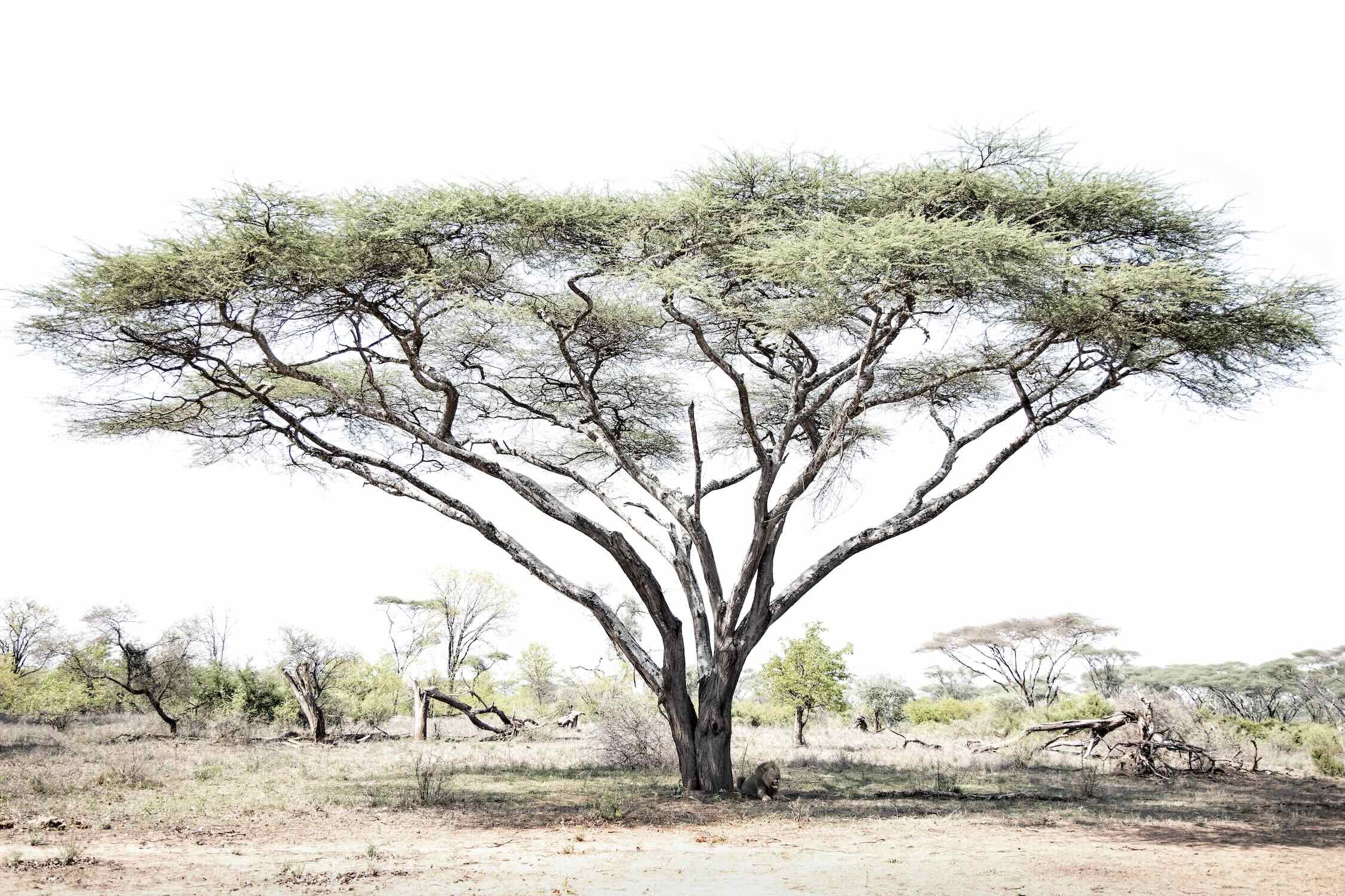 Embark on a journey into the heart of the African savannah with "Lion Under Umbrella Tree", a striking photograph capturing the serenity and grandeur of Zimbabwe’s wilderness. This evocative image portrays a lone lion beneath an iconic umbrella tree, blending muted tones with soft contrasts to highlight the lion’s regal poise against the vast landscape.