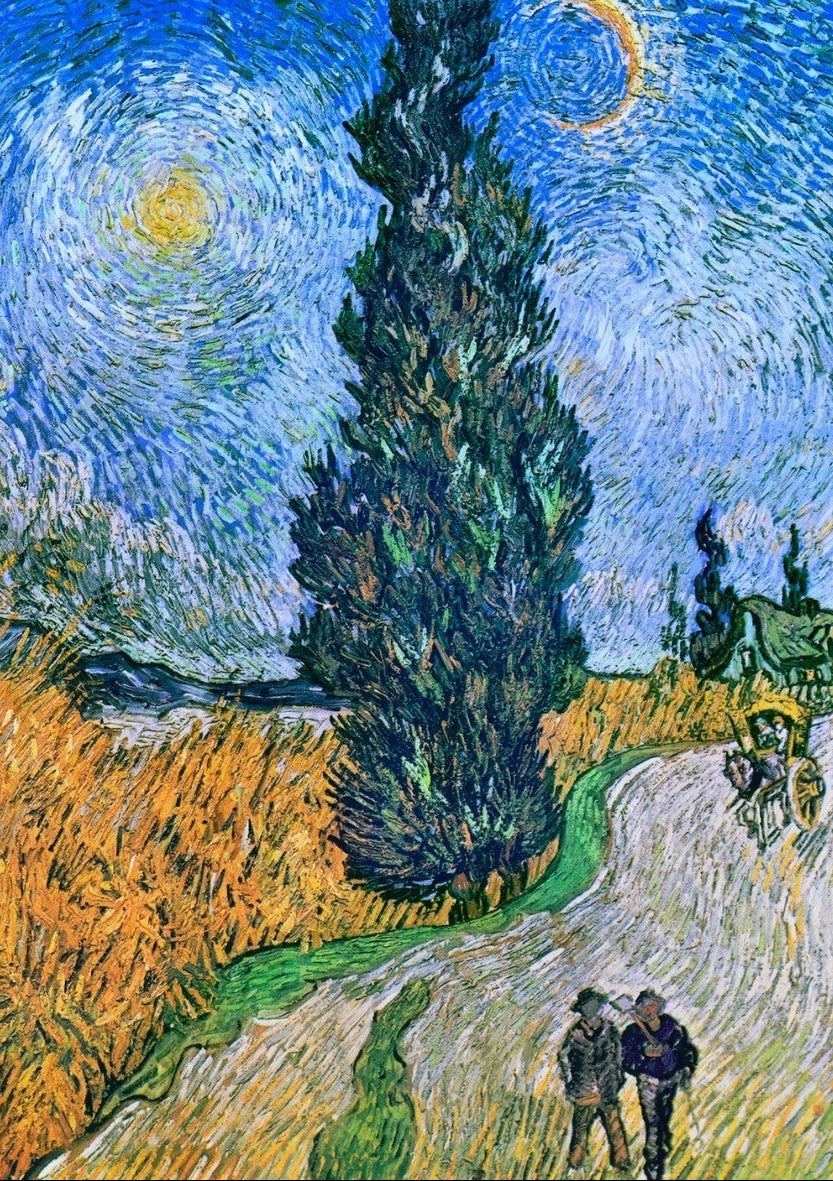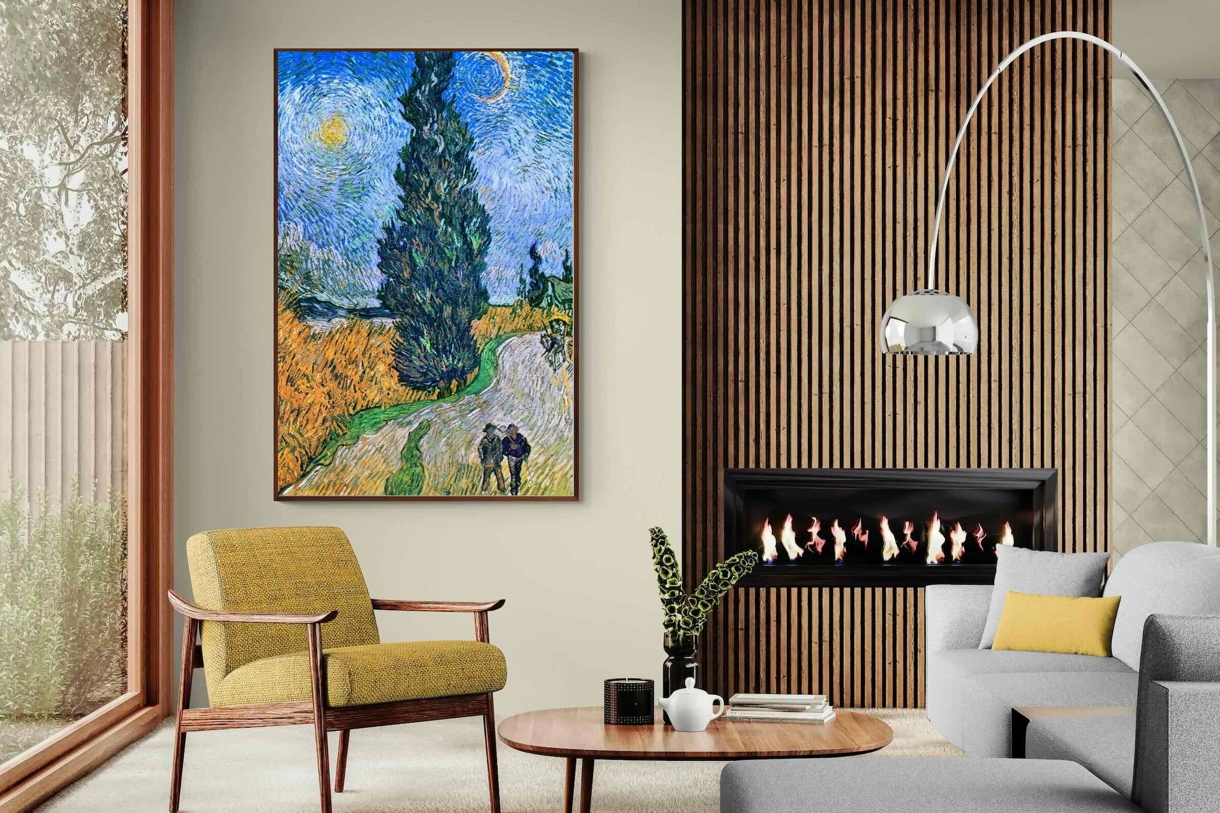 Vincent van Gogh's "Road with Cypress and Star," painted in 1890, is one of his most poignant works symbolising life's journey and the quest for hope amidst darkness. The cypress stands tall, reaching for the star-studded sky, embodying resilience and aspiration. With its vibrant colours and swirling sky, this piece radiates energy and emotion, making it a powerful and inspiring statement piece for any home, stirring contemplation and admiration in equal measure.