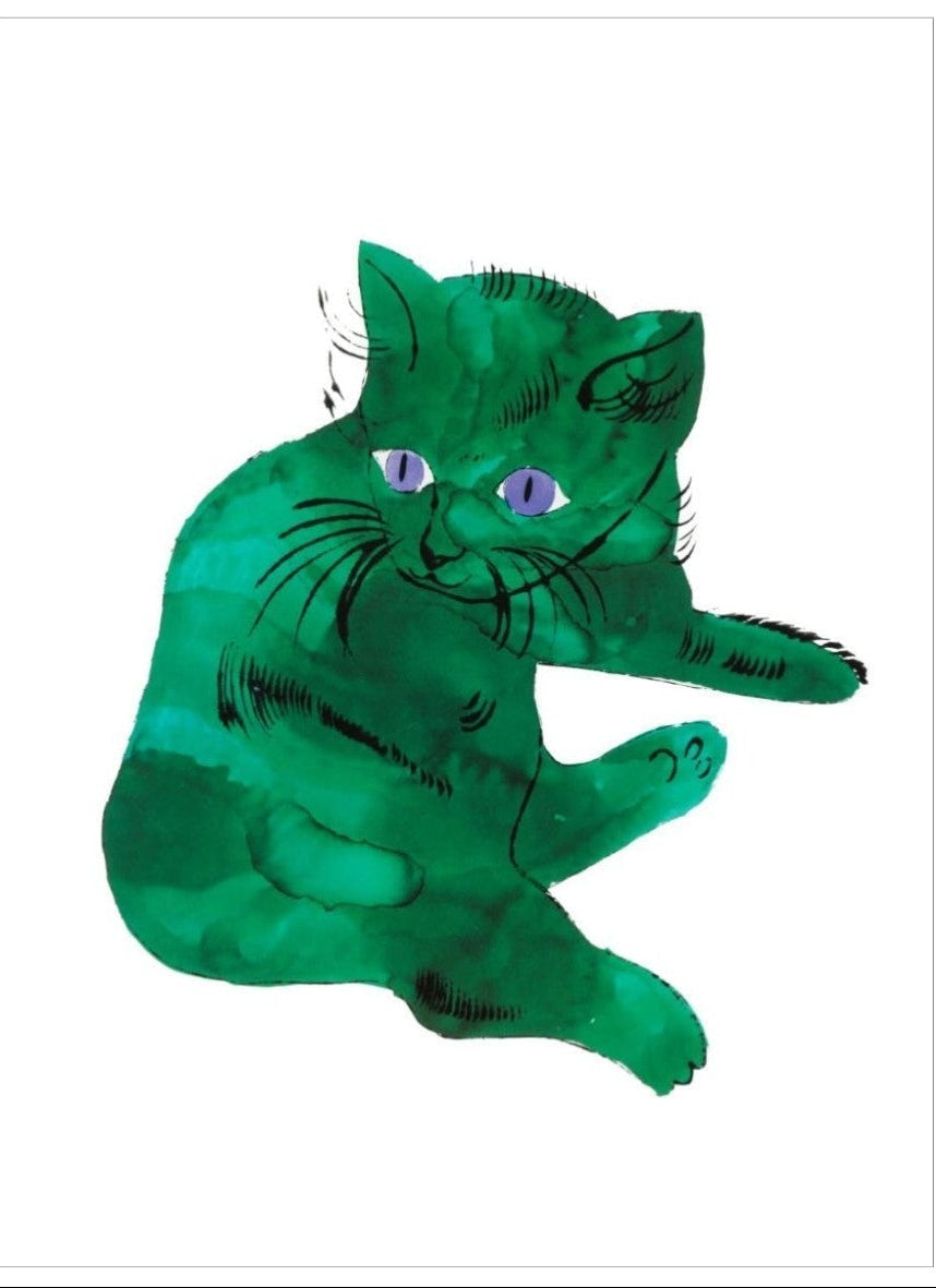 Andy Warhol's Green Cat is a playful and whimsical illustration created in the 1950s, featuring a bright green cat with an expressive, almost childlike style. The piece reflects Warhol's early commercial work, showcasing his love for bold colours and simple lines. Part of his 25 Cats Name[d] Sam and One Blue Pussy series, this piece highlights Warhol's experimentation with unconventional art subjects, blending pop culture with traditional themes.