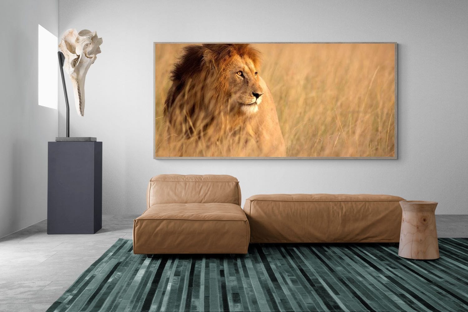A majestic male lion stands calmly within golden savanna grass, his mane catching the warm light of the African plains. The soft tones of the landscape create a serene backdrop that highlights the lion’s quiet strength and watchful presence. Capturing a timeless safari moment, this wildlife photograph brings warmth, elegance and a sense of untamed wilderness to interiors inspired by nature and African landscapes.