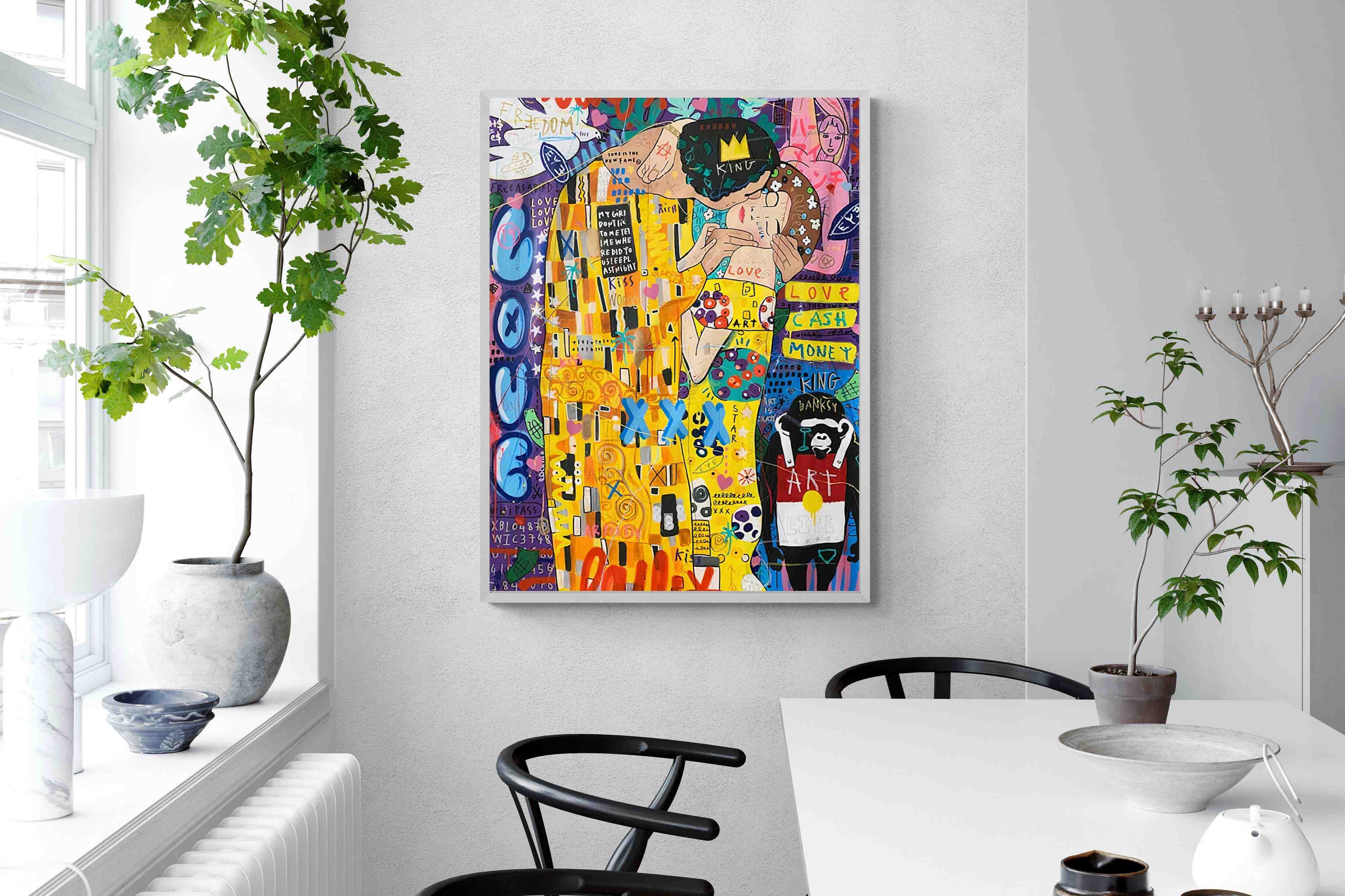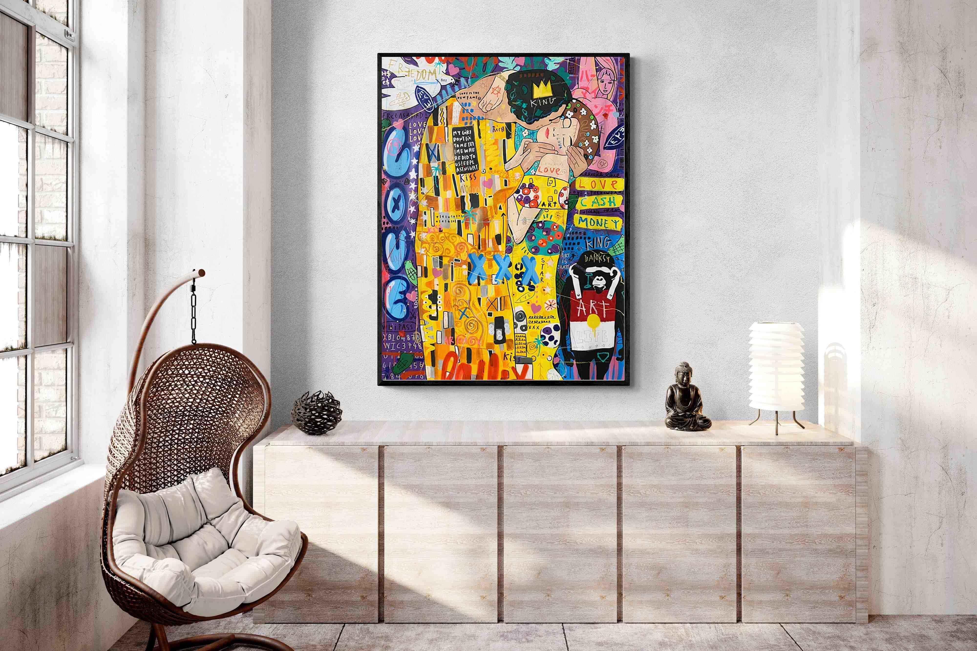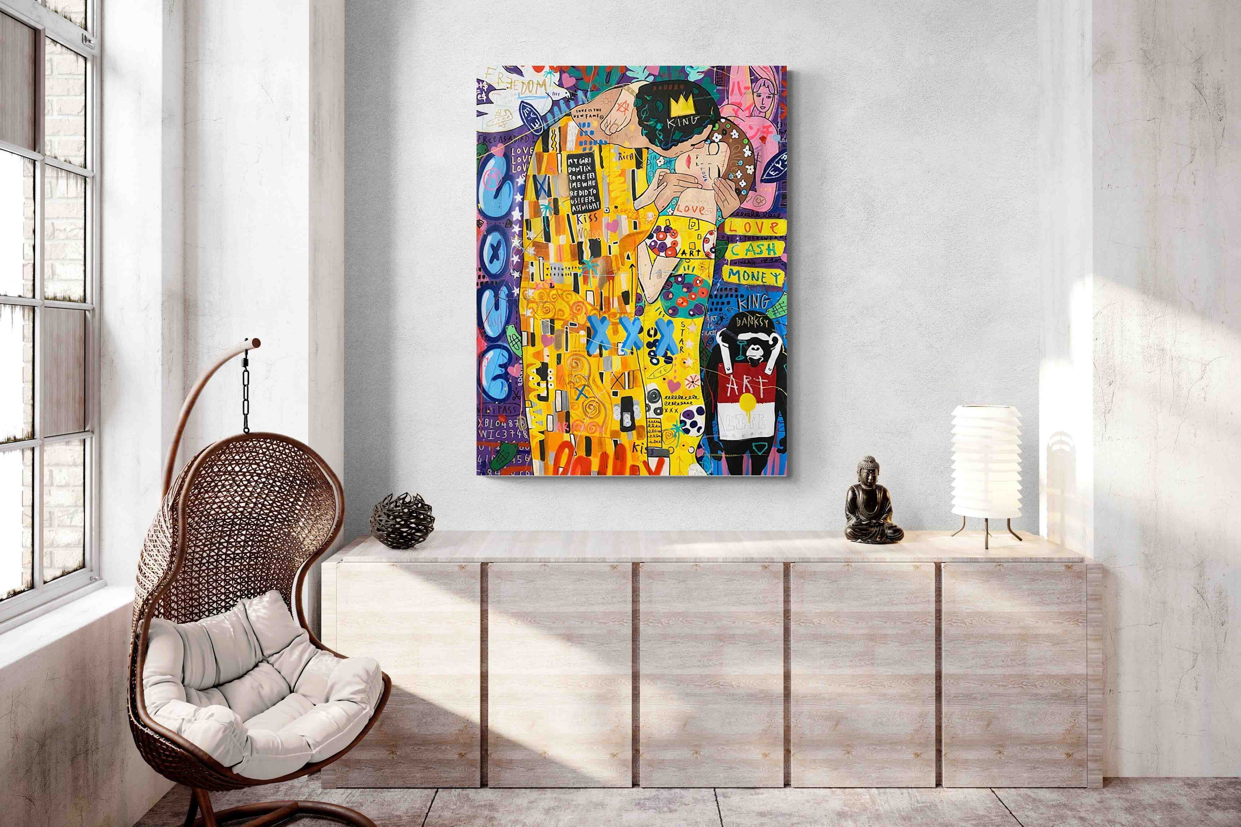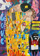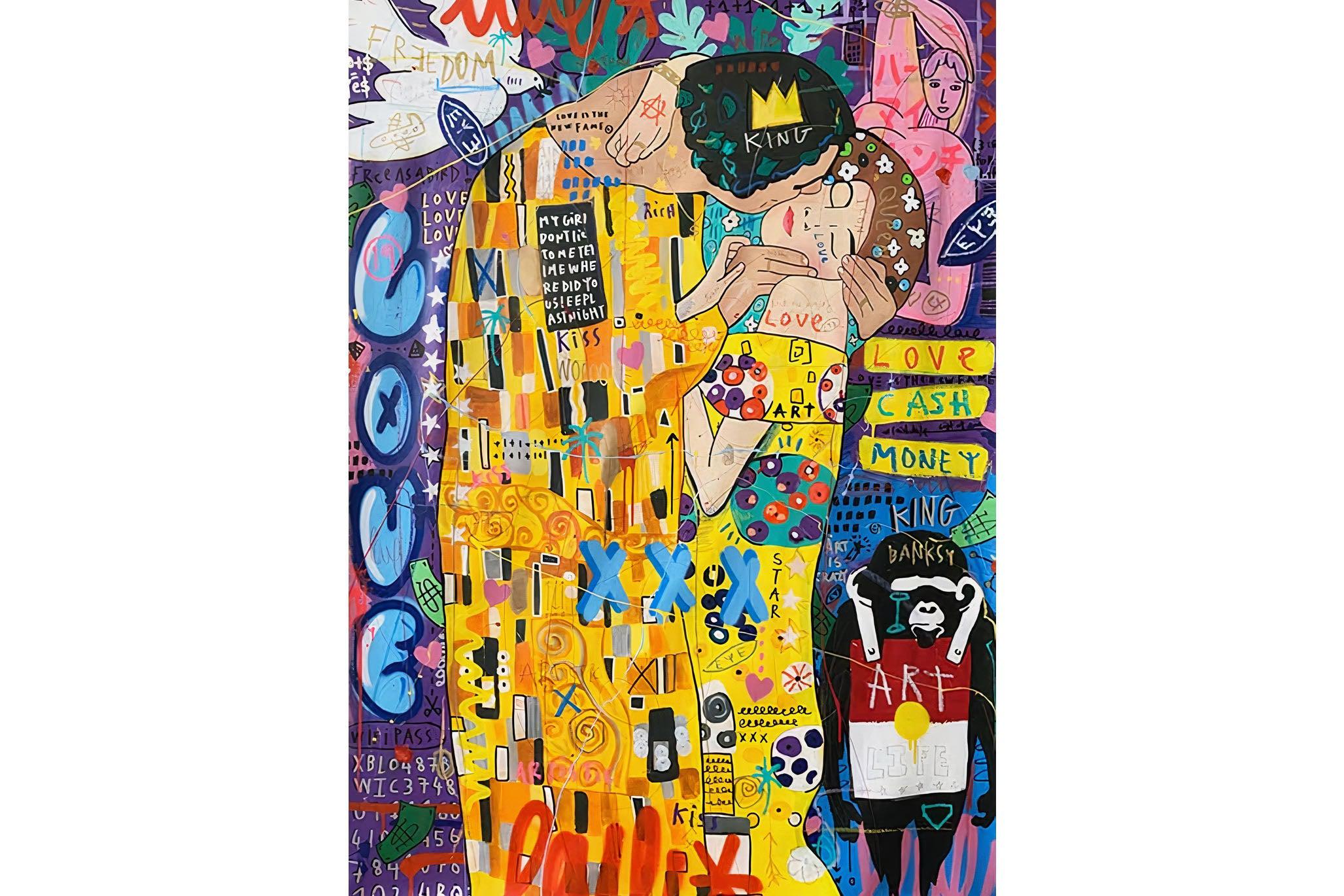 "Graffiti Kiss" presents a modern reimagining of Klimt’s timeless embrace, enveloped in a rich tapestry of street art motifs and vibrant colour bursts. Juxtaposed against a backdrop teeming with symbols of contemporary urban culture, the central figures encapsulate a fervent love that's both timeless and fiercely present-day. The intricate blend of sprayed patterns, hand-drawn elements, and emblematic stencils add depth and dynamism, transporting viewers to the bustling streets where street art meets classicism.