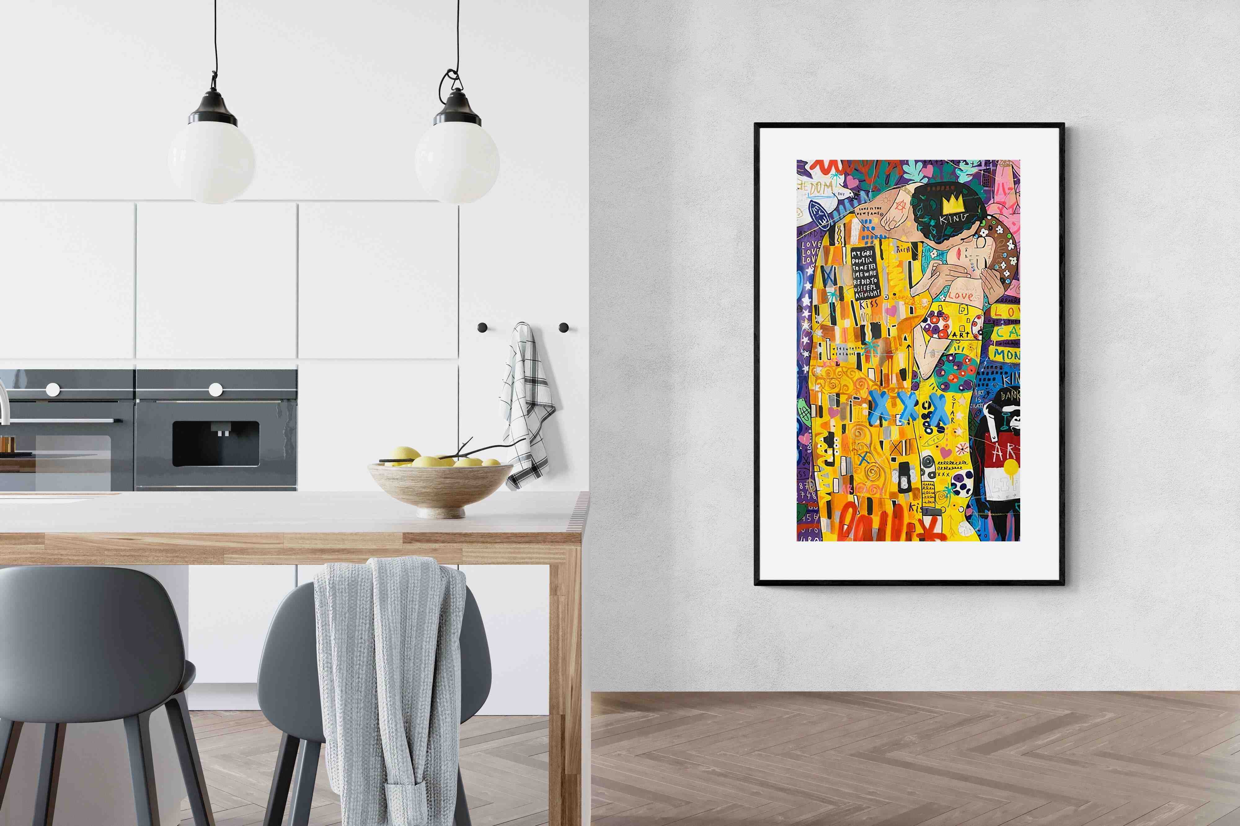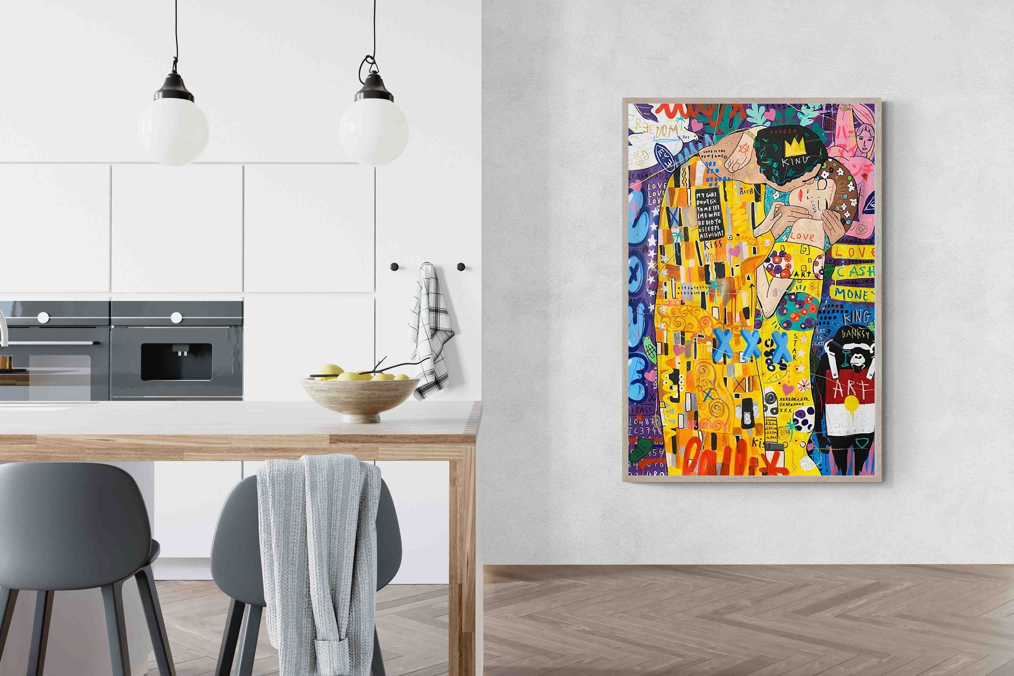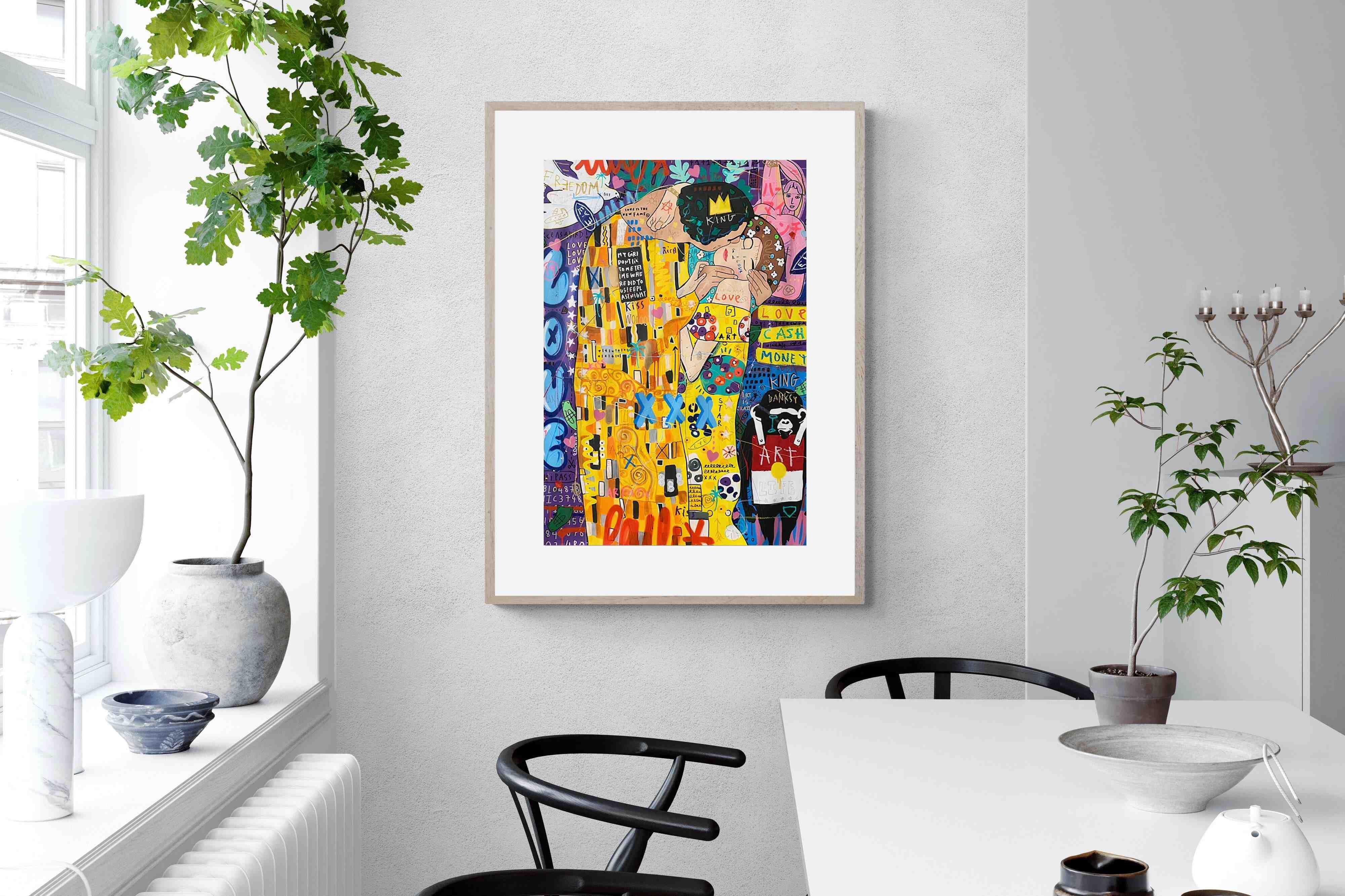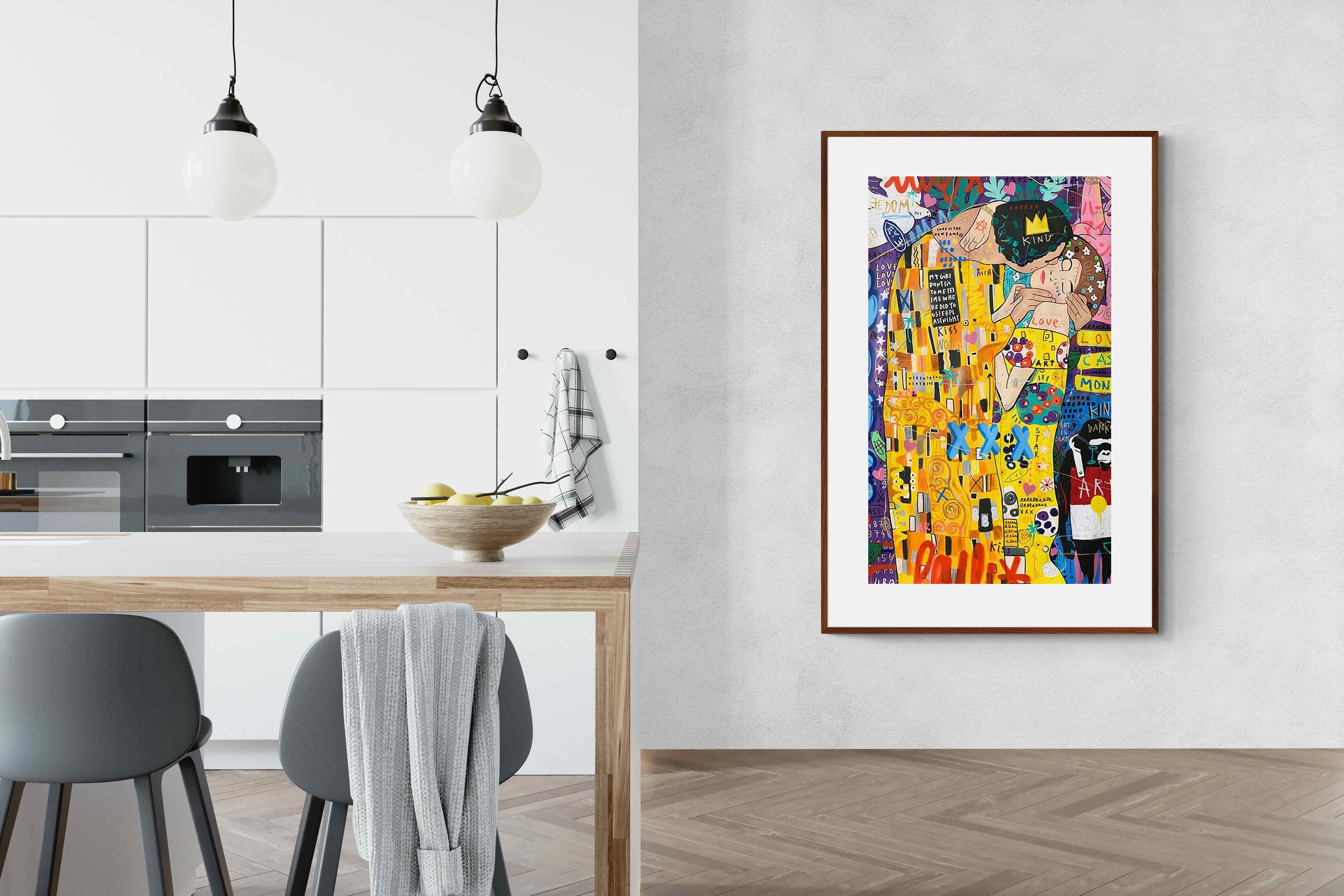 "Graffiti Kiss" presents a modern reimagining of Klimt’s timeless embrace, enveloped in a rich tapestry of street art motifs and vibrant colour bursts. Juxtaposed against a backdrop teeming with symbols of contemporary urban culture, the central figures encapsulate a fervent love that's both timeless and fiercely present-day. The intricate blend of sprayed patterns, hand-drawn elements, and emblematic stencils add depth and dynamism, transporting viewers to the bustling streets where street art meets classicism.