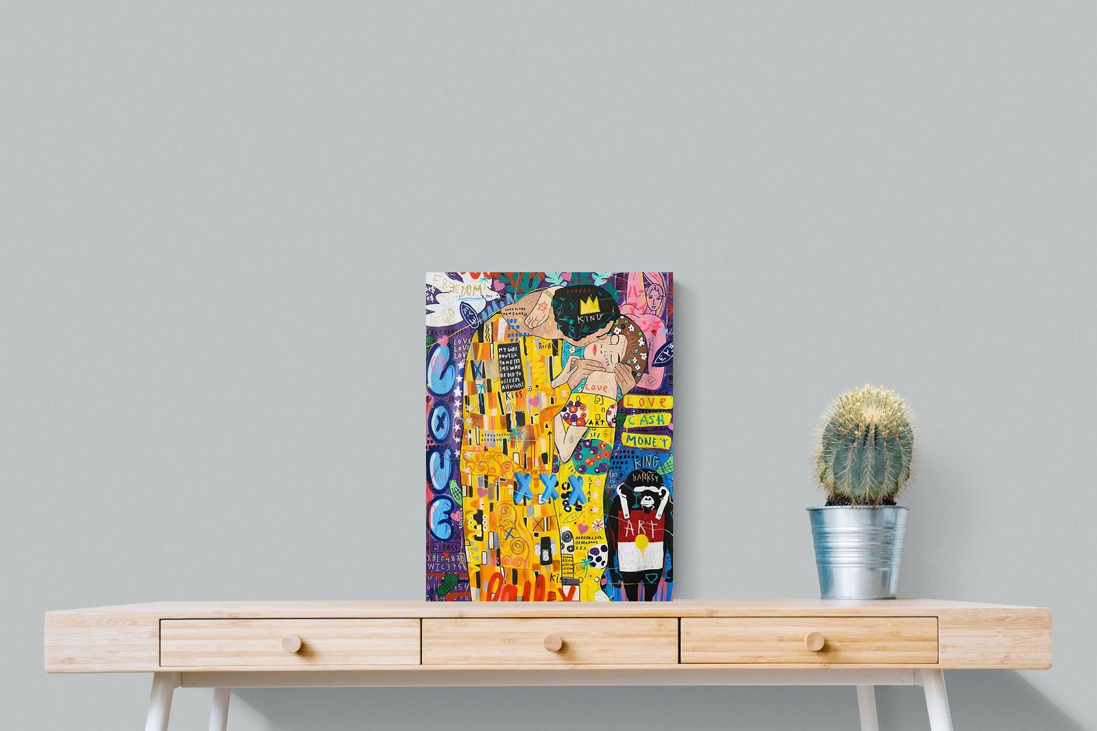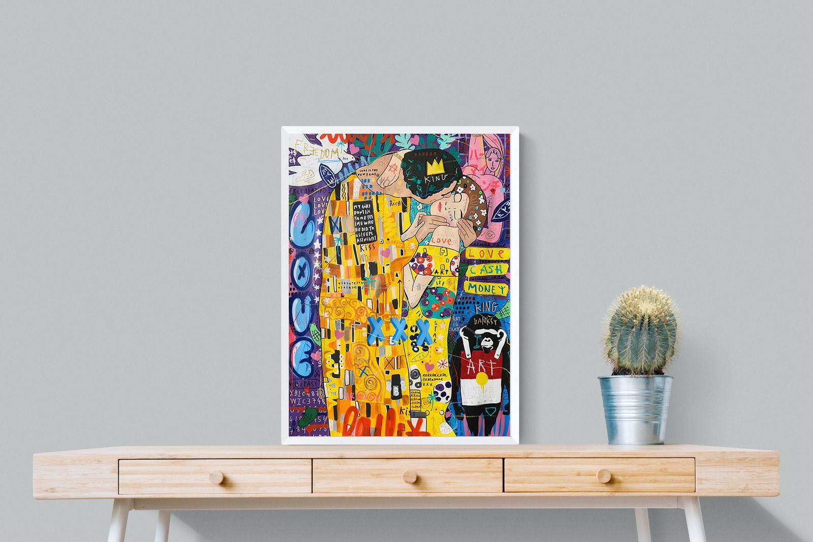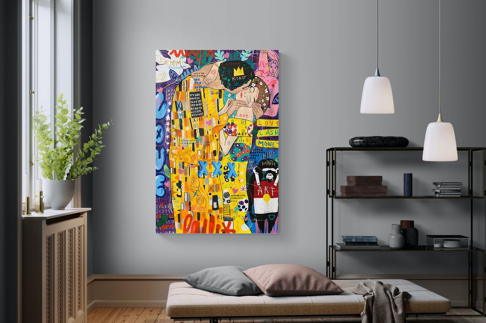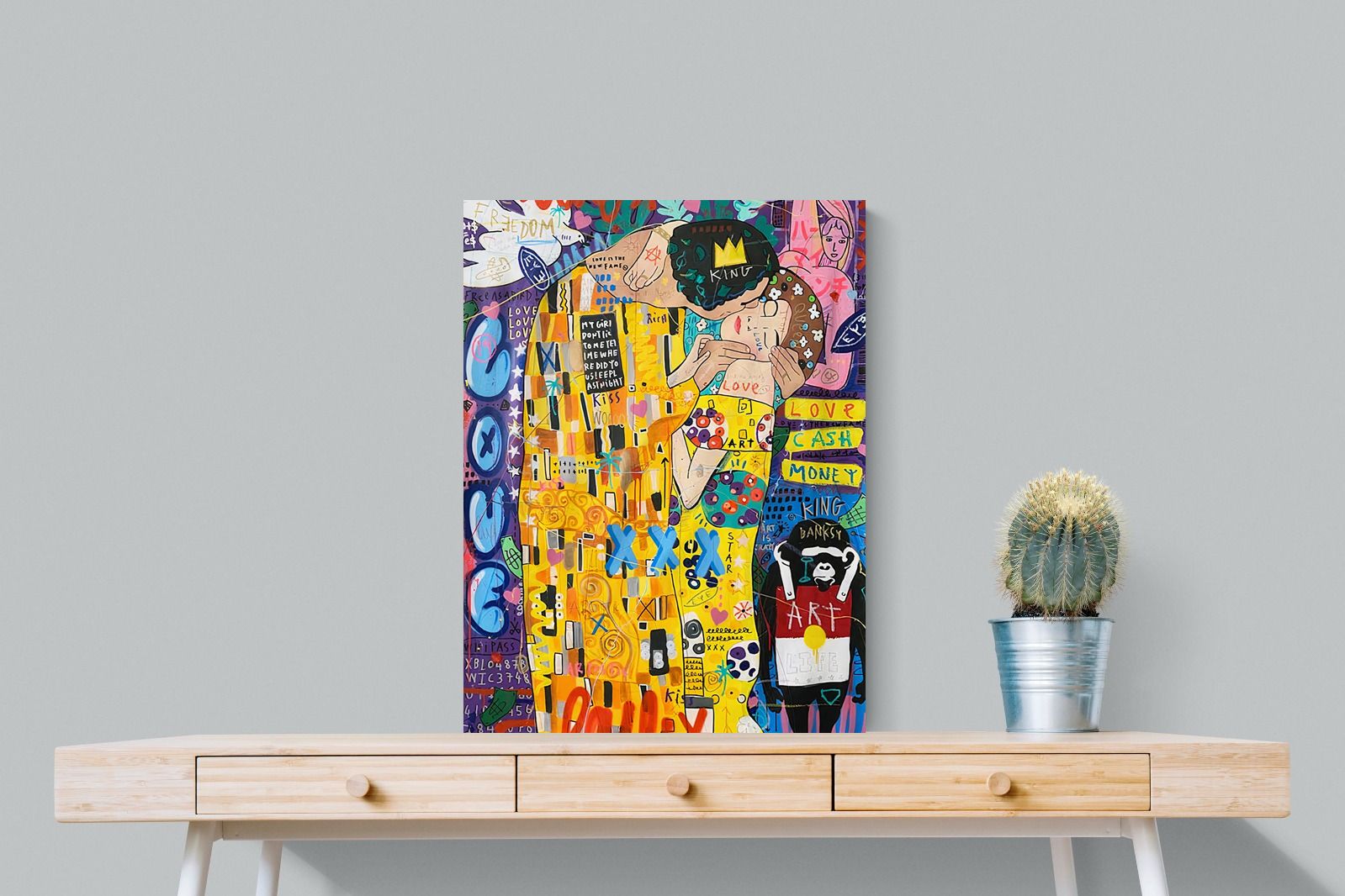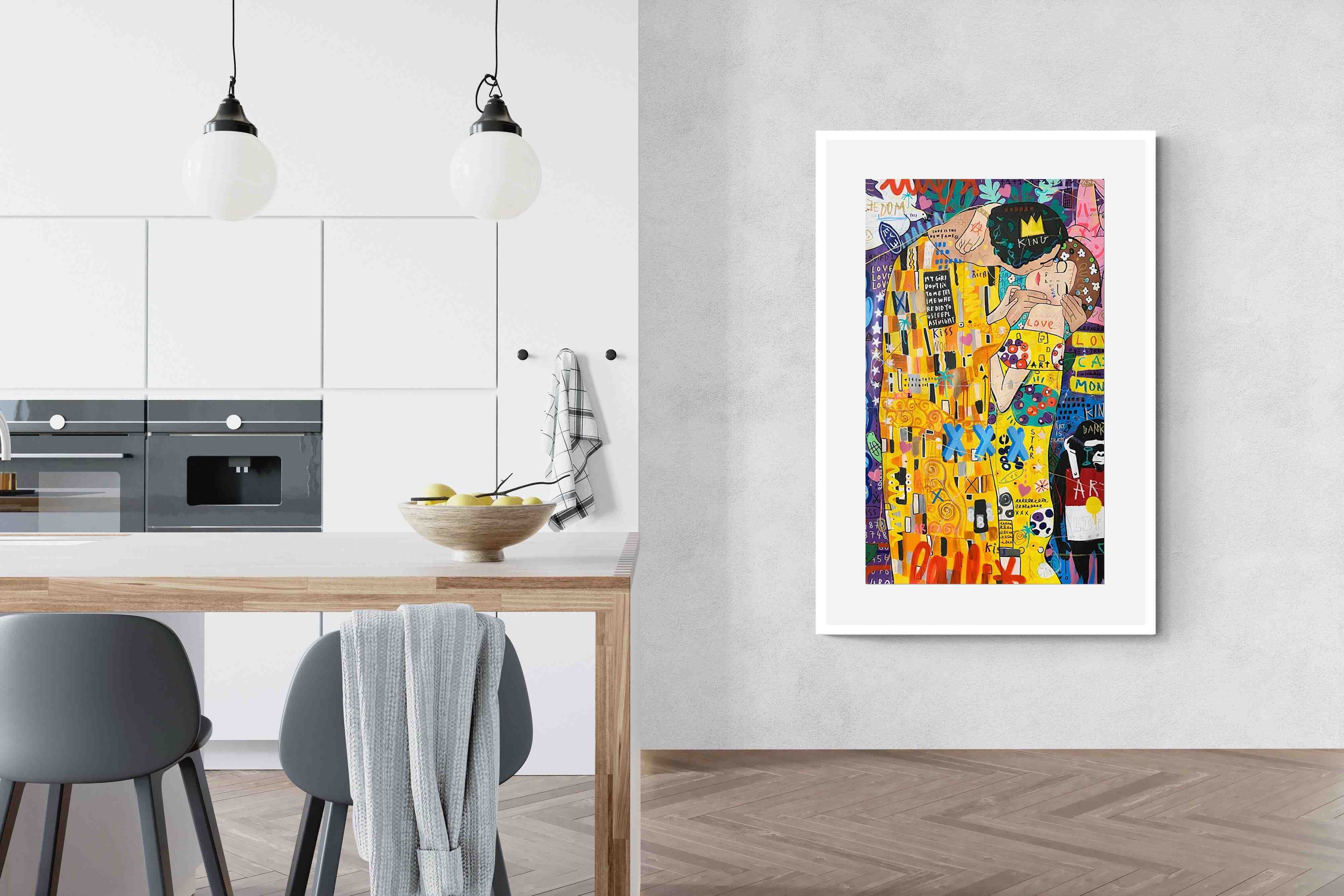 "Graffiti Kiss" presents a modern reimagining of Klimt’s timeless embrace, enveloped in a rich tapestry of street art motifs and vibrant colour bursts. Juxtaposed against a backdrop teeming with symbols of contemporary urban culture, the central figures encapsulate a fervent love that's both timeless and fiercely present-day. The intricate blend of sprayed patterns, hand-drawn elements, and emblematic stencils add depth and dynamism, transporting viewers to the bustling streets where street art meets classicism.
