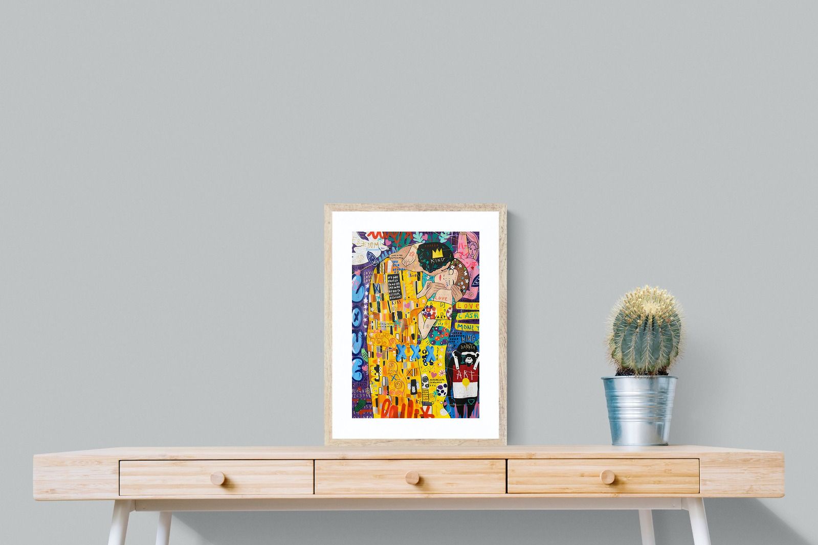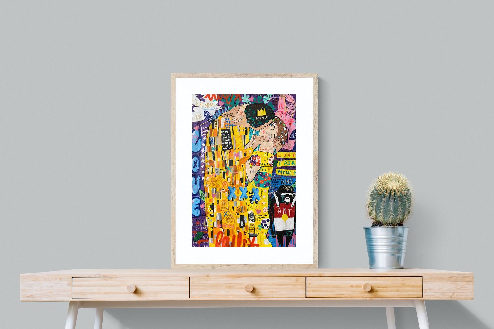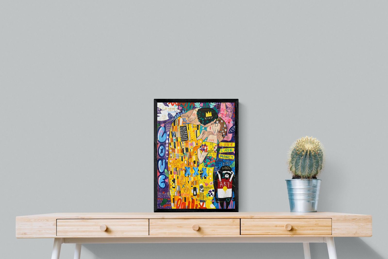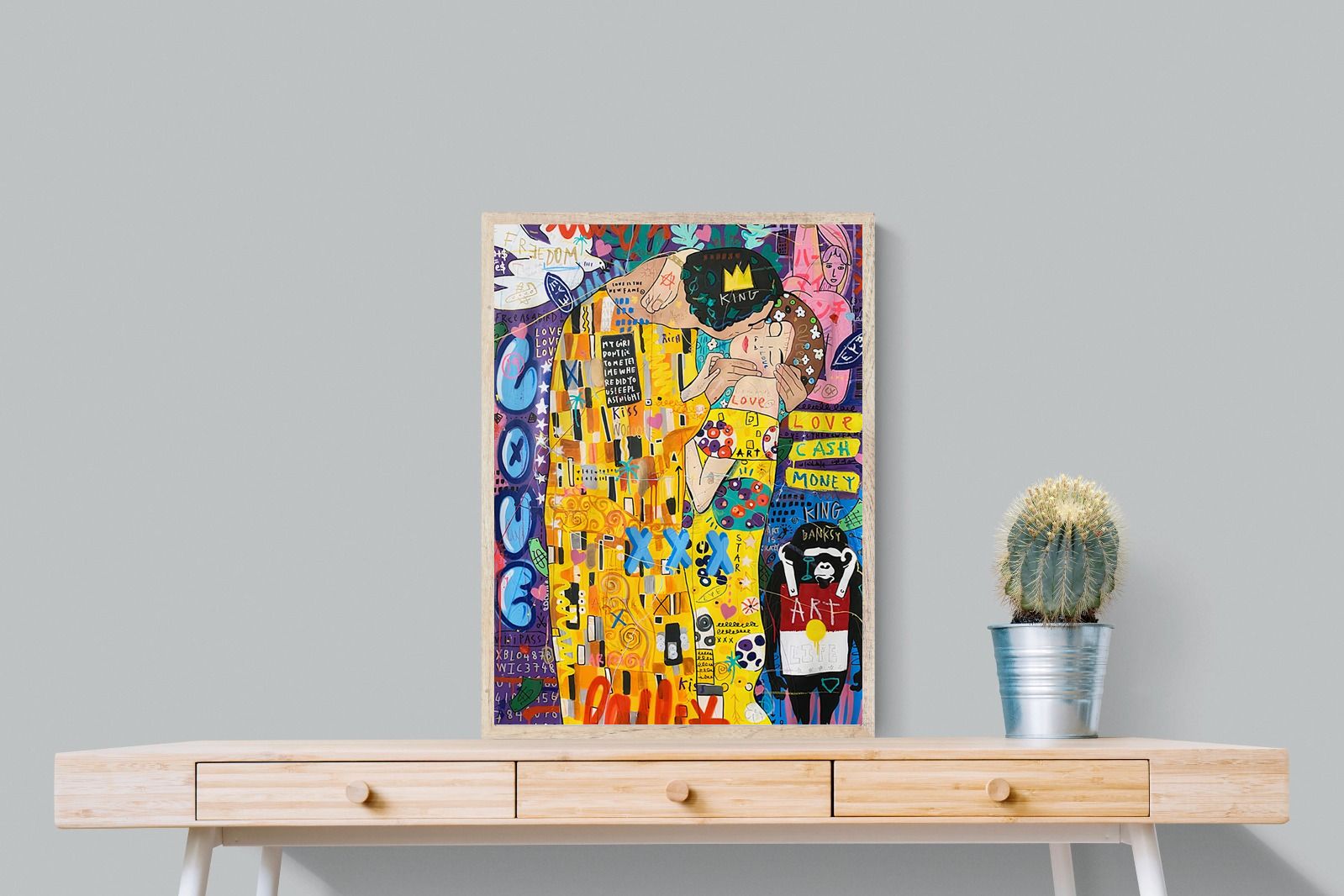 "Graffiti Kiss" presents a modern reimagining of Klimt’s timeless embrace, enveloped in a rich tapestry of street art motifs and vibrant colour bursts. Juxtaposed against a backdrop teeming with symbols of contemporary urban culture, the central figures encapsulate a fervent love that's both timeless and fiercely present-day. The intricate blend of sprayed patterns, hand-drawn elements, and emblematic stencils add depth and dynamism, transporting viewers to the bustling streets where street art meets classicism.
