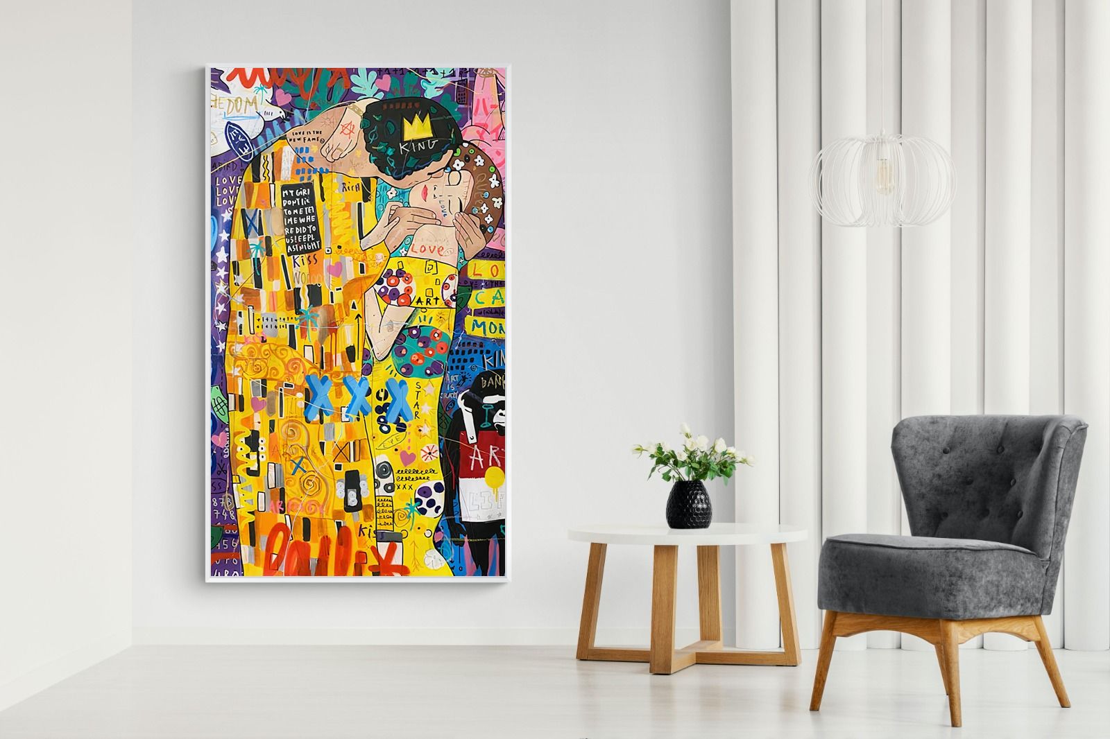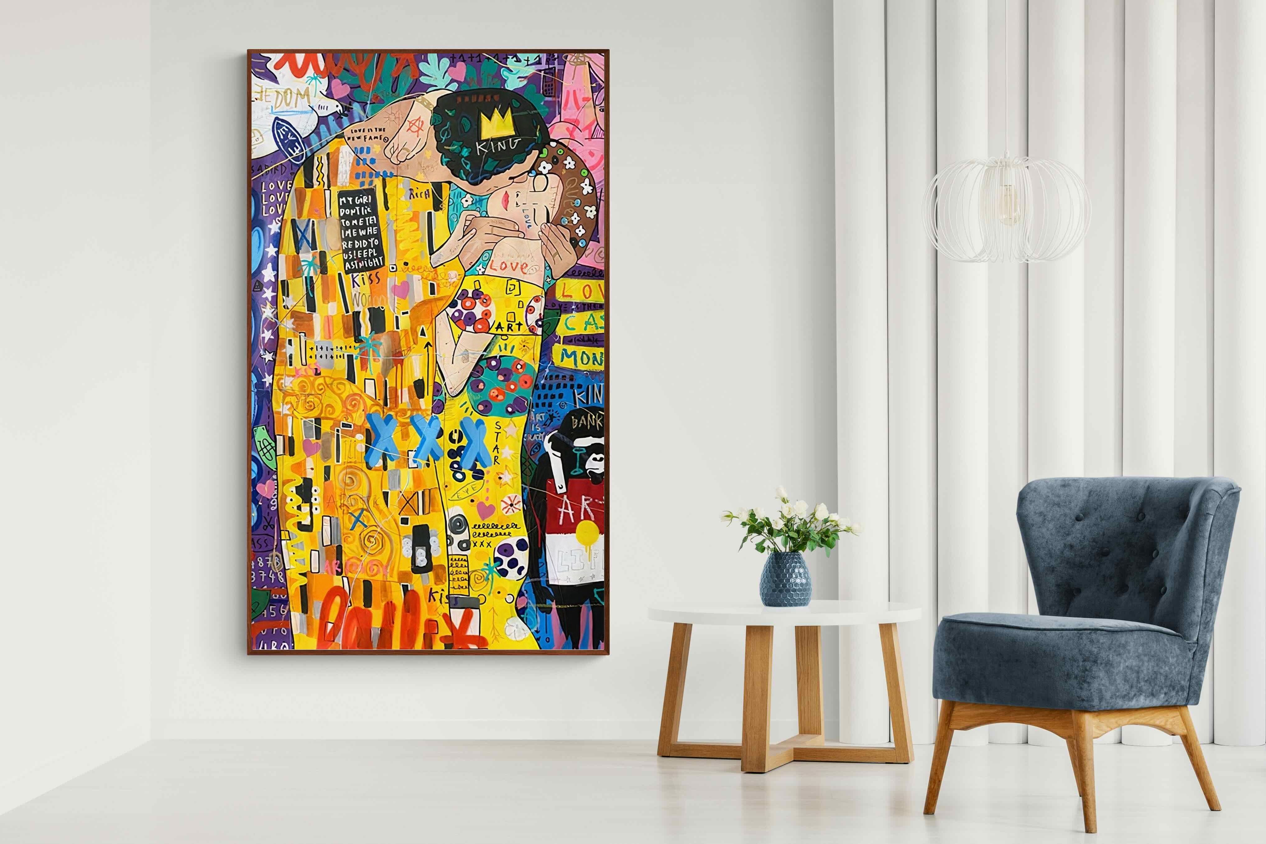 Delve into the magnetic allure of "Graffiti Kiss" – a contemporary masterpiece that seamlessly combines the revolutionary ethos of modern graffiti art with the sensuous romanticism of Gustav Klimt's iconic "The Kiss". This brilliant artwork captures the spirit of modern love through an audacious mesh of graffiti art and classical fin-de-siècle painting, evoking powerful emotions of passion, defiance, and intrigue.