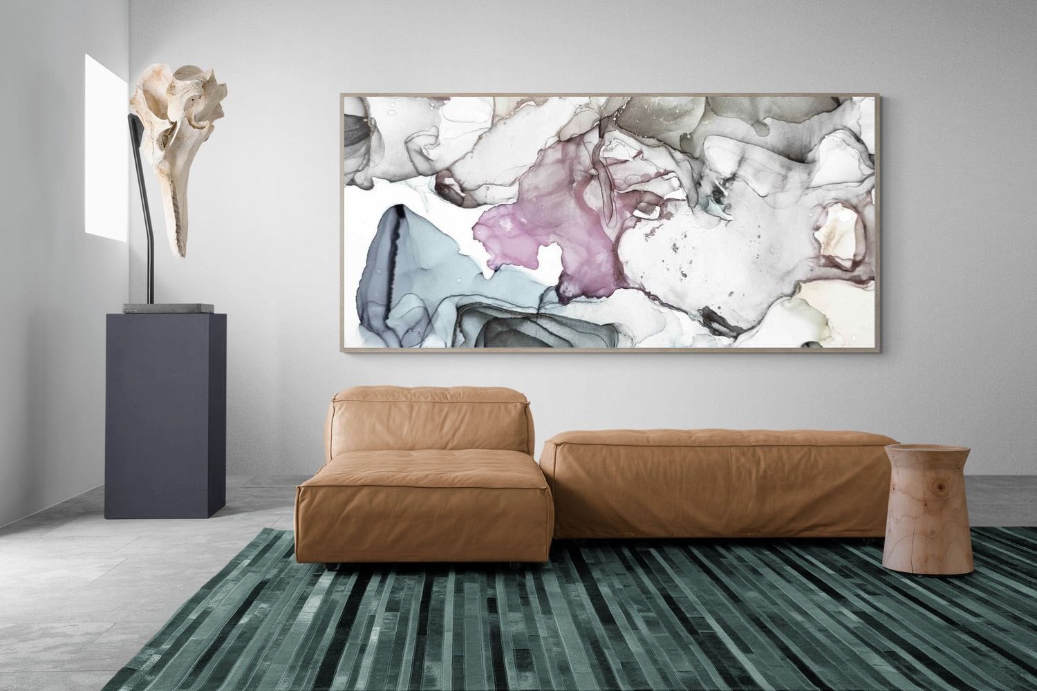Delicate layers of translucent ink create a calm, flowing composition in soft greys, muted blues, and gentle blush tones. The organic shapes drift across a light background, forming a balanced yet expressive abstract. Subtle gradients and fine detailing give the piece depth while maintaining an airy, minimal feel. Ideal for modern, Scandinavian, or serene interiors, this artwork brings softness, elegance, and a quiet sense of movement to bedrooms, living spaces, or refined office environments.