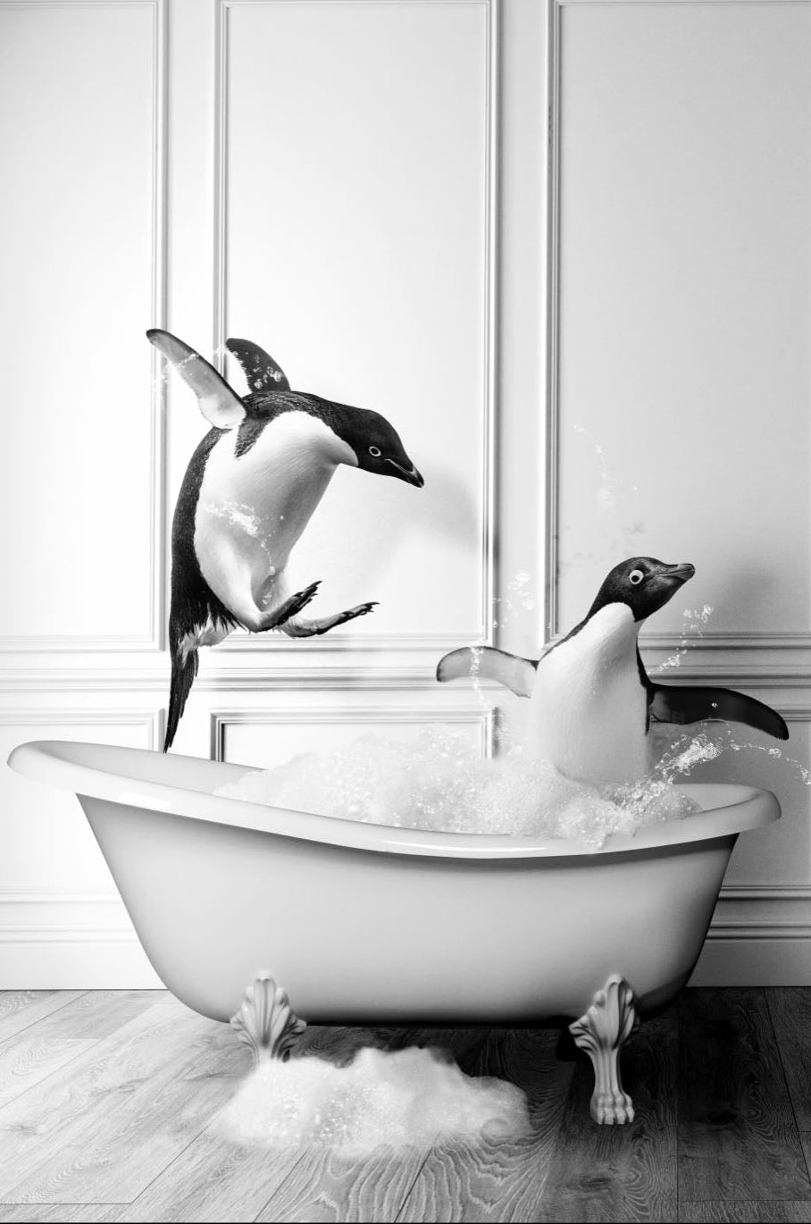 This playful image captures two joyous penguins enjoying a bubble bath, creating a humorous and endearing moment. The monochromatic palette and clean lines make it a perfect fit for a contemporary home. It adds a lighthearted, whimsical touch to minimalist spaces, bringing charm and personality to bathrooms, maintaining a modern, stylish aesthetic.
